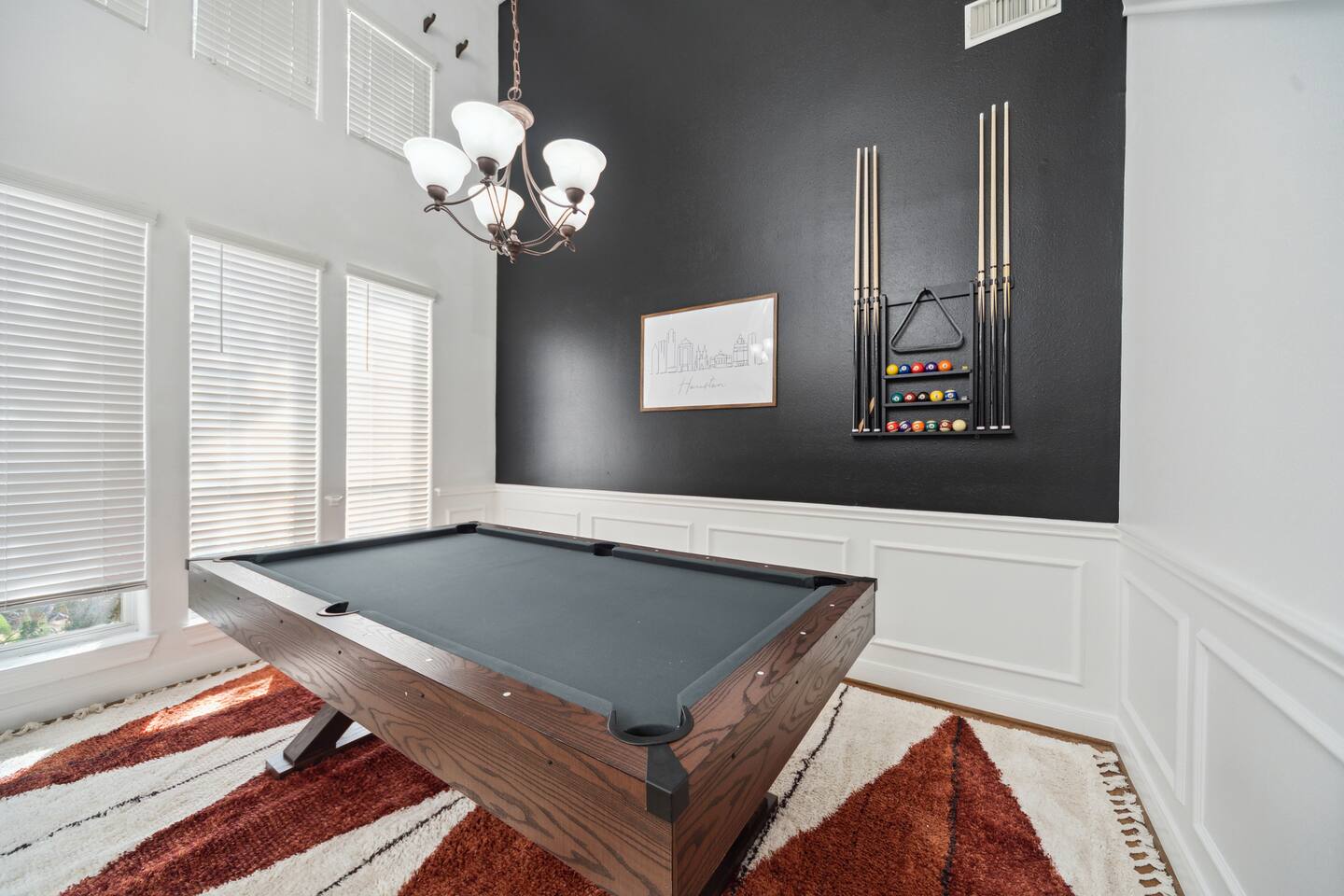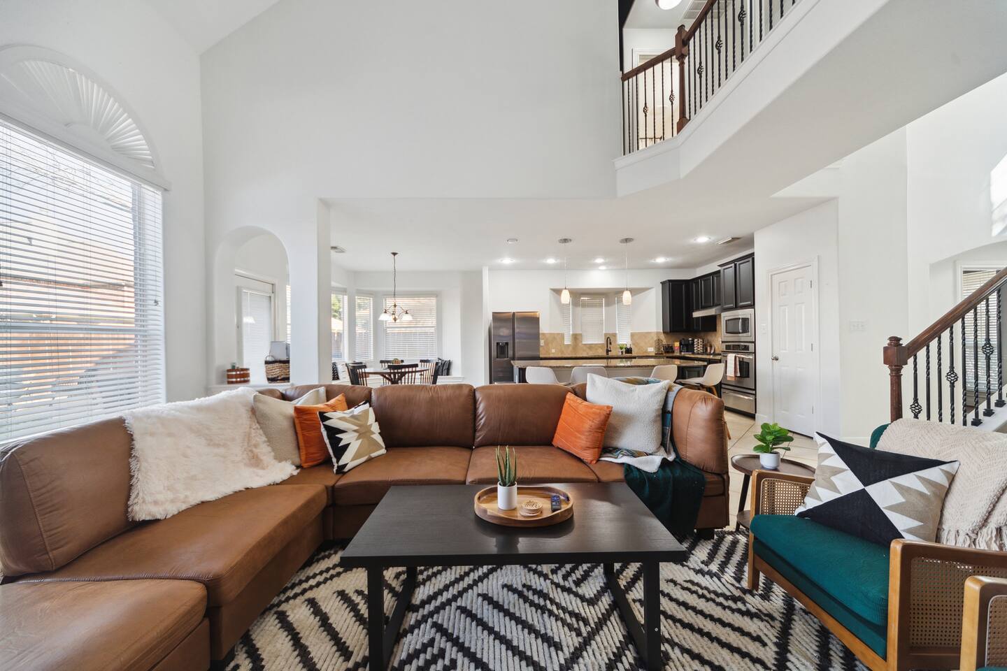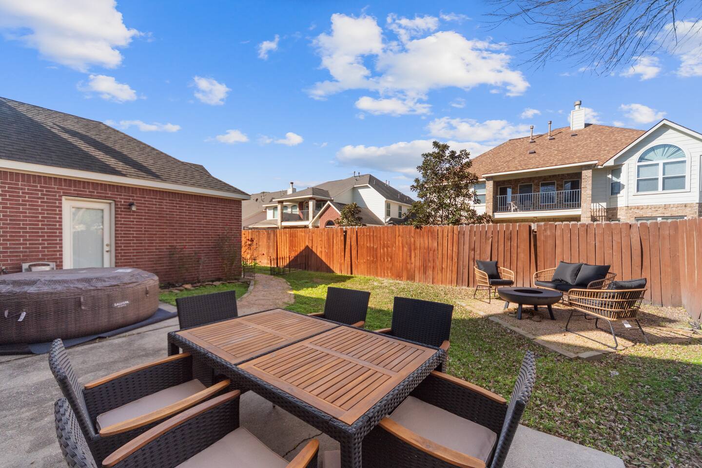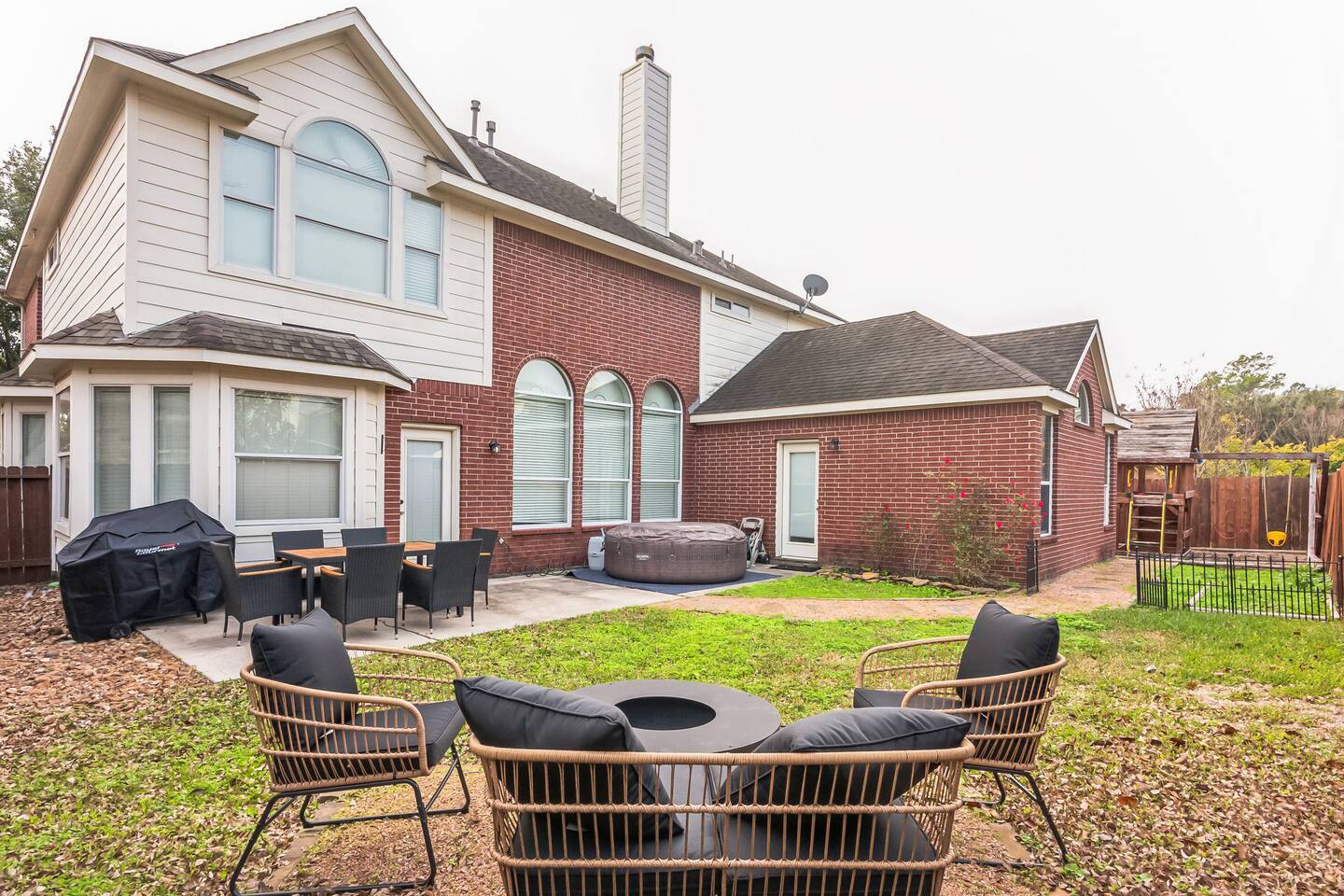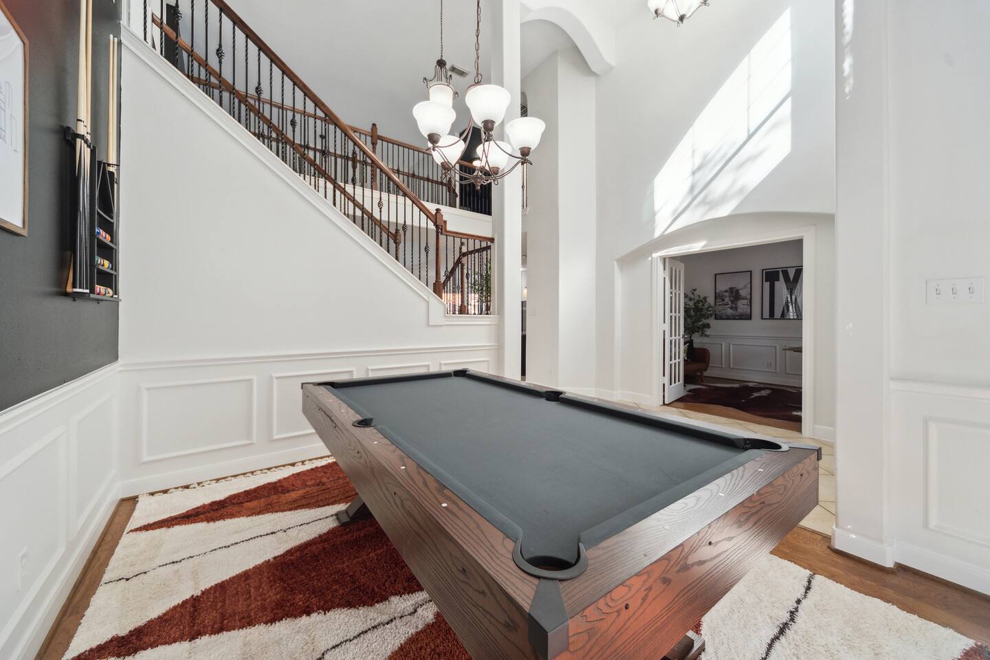 Welcome to the Modern Texan Retreat! This spacious home has plenty of space for everyone. Upon arrival you will find plenty of parking with a 3 car garage and expansive driveway on this corner lot property. Come in and get settled! Walking into the property you’ll be met with big Texas style in our oversized game room with pool table and office space directly off the entry way. This space flows perfectly into the open concept kitchen, dining and living spaces with plenty of seating for your whole group. Our kitchen is readily stocked with all of your basic cooking supplies including spices, cookware, bakeware, Kuerig Duo coffee maker & coffee, blender, air fryer and more! Say “howdy” to the spacious living room, complete with a large sectional couch, 65 in TV and gas fireplace for those colder nights & game day fun! On the main level you will also find the massive primary suite with a king size bed, dresser, seating & oversized primary bathroom with a large soaking tub, walk in shower and plenty of closet space! The half bathroom off the hallway and laundry room can also be found on this level with direct access to the garage. Head upstairs to find the 4 additional bedrooms. Each room consists of a bed, dresser, smart tv & more. We have 3 king size beds, two queen size beds, a futon & queen air mattress in the home, each in their own individual rooms. For our younger travelers we also supply a pack n play in the primary room. Upstairs has two additional full bathrooms, both with a tub/shower combo and of course our incredible theatre room with massage chairs for your viewing pleasure! This room is the perfect place for additional guests to sleep and stays quite dark! Outside we have set you up with a fire pit area with cooktop fire pit, charcoal BBQ grill, hot tub, play area (playset has been disassembled and will be replaced at a later date) and plenty of seating! You have direct access to this space through the primary bedroom and the dining room/living room areas. Our backyard is fully fenced in, making it perfect for our small or furry friends!