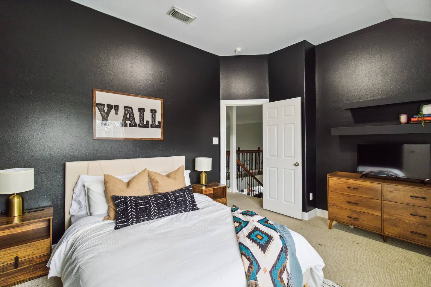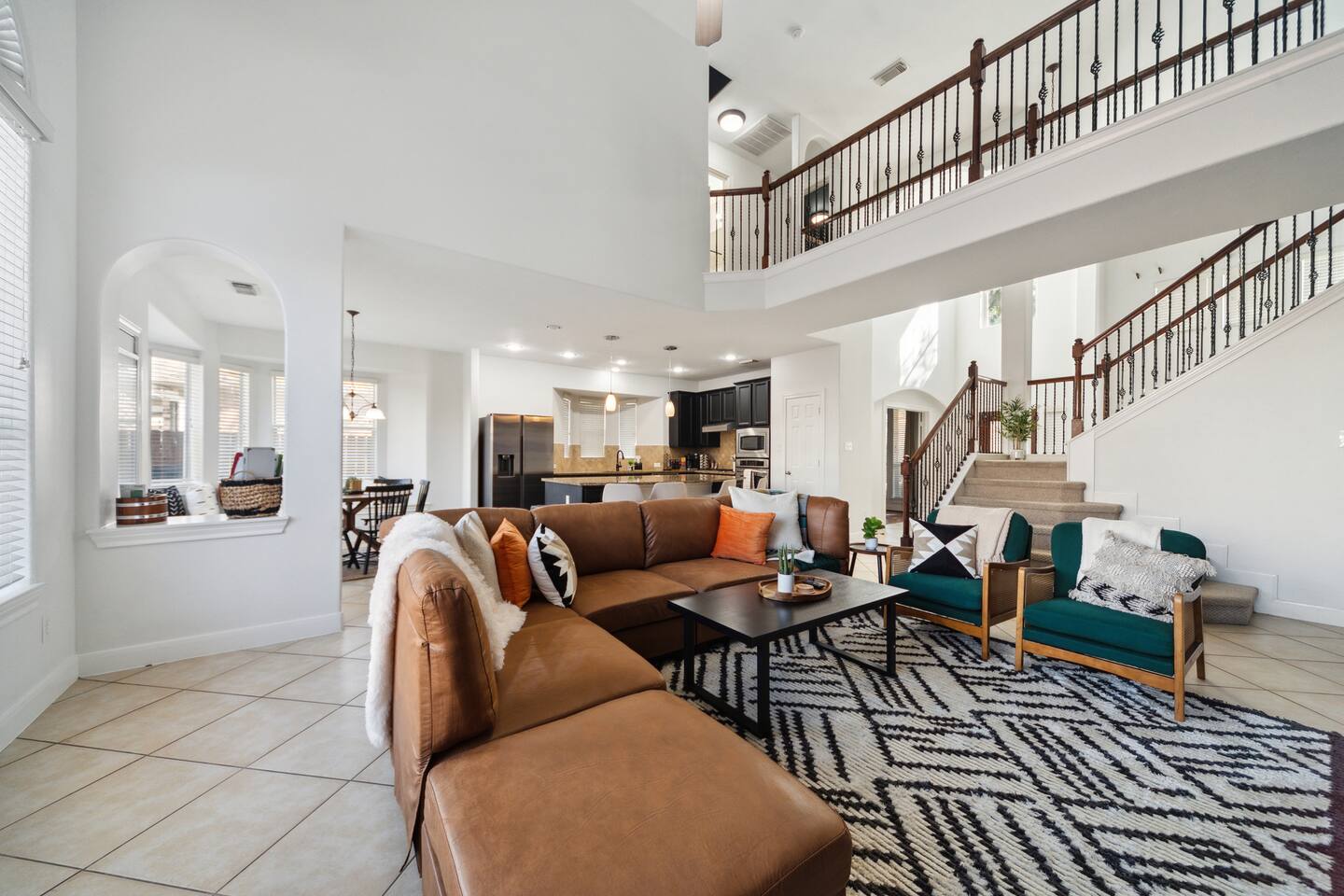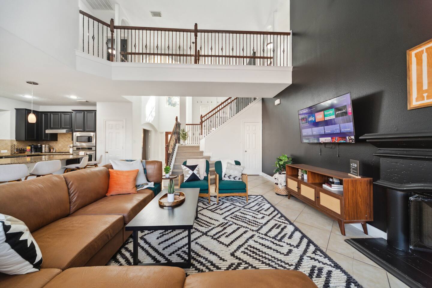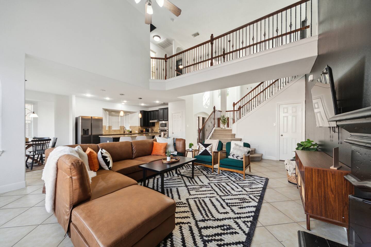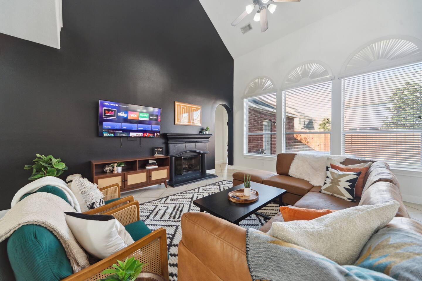 Welcome to the Modern Texan Retreat! This spacious home has plenty of space for everyone. Upon arrival you will find plenty of parking with a 3 car garage and expansive driveway on this corner lot property. Come in and get settled! Walking into the property you’ll be met with big Texas style in our oversized game room with pool table and office space directly off the entry way. This space flows perfectly into the open concept kitchen, dining and living spaces with plenty of seating for your whole group. Our kitchen is readily stocked with all of your basic cooking supplies including spices, cookware, bakeware, Kuerig Duo coffee maker & coffee, blender, air fryer and more! Say “howdy” to the spacious living room, complete with a large sectional couch, 65 in TV and gas fireplace for those colder nights & game day fun! On the main level you will also find the massive primary suite with a king size bed, dresser, seating & oversized primary bathroom with a large soaking tub, walk in shower and plenty of closet space! The half bathroom off the hallway and laundry room can also be found on this level with direct access to the garage. Head upstairs to find the 4 additional bedrooms. Each room consists of a bed, dresser, smart tv & more. We have 3 king size beds, two queen size beds, a futon & queen air mattress in the home, each in their own individual rooms. For our younger travelers we also supply a pack n play in the primary room. Upstairs has two additional full bathrooms, both with a tub/shower combo and of course our incredible theatre room with massage chairs for your viewing pleasure! This room is the perfect place for additional guests to sleep and stays quite dark! Outside we have set you up with a fire pit area with cooktop fire pit, charcoal BBQ grill, hot tub, play area (playset has been disassembled and will be replaced at a later date) and plenty of seating! You have direct access to this space through the primary bedroom and the dining room/living room areas. Our backyard is fully fenced in, making it perfect for our small or furry friends!