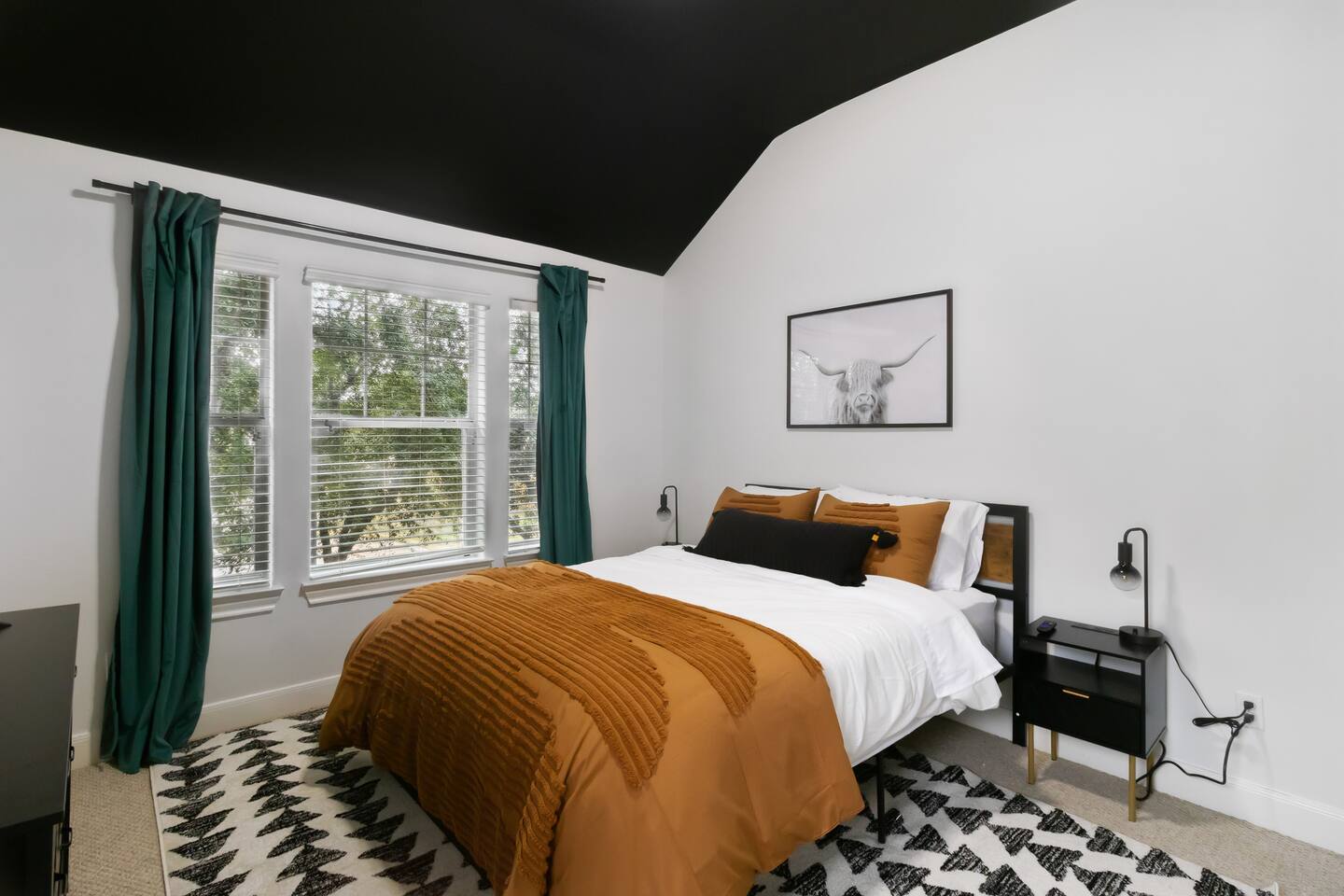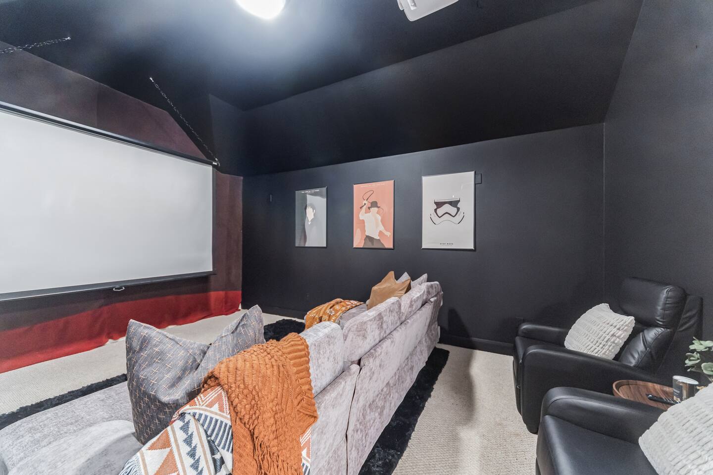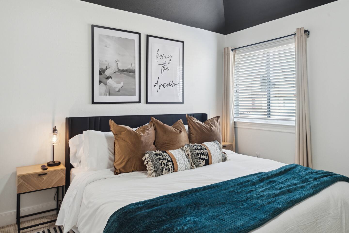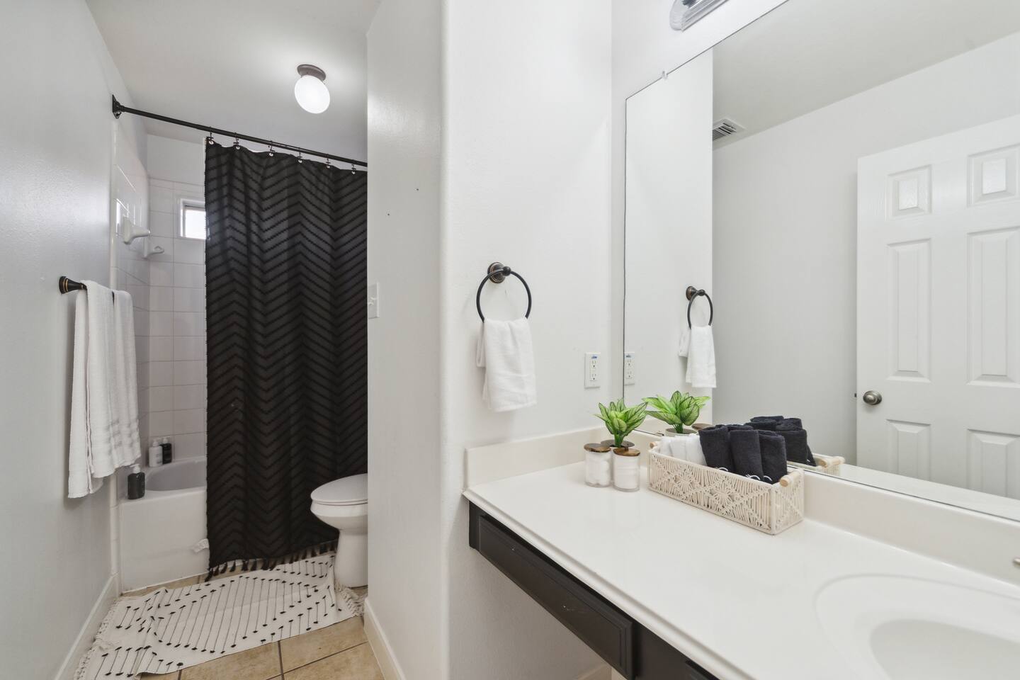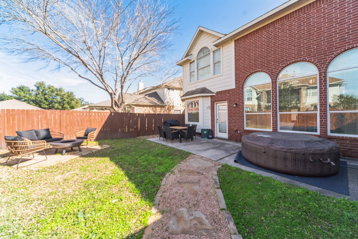 Welcome to the Modern Texan Retreat! This spacious home has plenty of space for everyone. Upon arrival you will find plenty of parking with a 3 car garage and expansive driveway on this corner lot property. Come in and get settled! Walking into the property you’ll be met with big Texas style in our oversized game room with pool table and office space directly off the entry way. This space flows perfectly into the open concept kitchen, dining and living spaces with plenty of seating for your whole group. Our kitchen is readily stocked with all of your basic cooking supplies including spices, cookware, bakeware, Kuerig Duo coffee maker & coffee, blender, air fryer and more! Say “howdy” to the spacious living room, complete with a large sectional couch, 65 in TV and gas fireplace for those colder nights & game day fun! On the main level you will also find the massive primary suite with a king size bed, dresser, seating & oversized primary bathroom with a large soaking tub, walk in shower and plenty of closet space! The half bathroom off the hallway and laundry room can also be found on this level with direct access to the garage. Head upstairs to find the 4 additional bedrooms. Each room consists of a bed, dresser, smart tv & more. We have 3 king size beds, two queen size beds, a futon & queen air mattress in the home, each in their own individual rooms. For our younger travelers we also supply a pack n play in the primary room. Upstairs has two additional full bathrooms, both with a tub/shower combo and of course our incredible theatre room with massage chairs for your viewing pleasure! This room is the perfect place for additional guests to sleep and stays quite dark! Outside we have set you up with a fire pit area with cooktop fire pit, charcoal BBQ grill, hot tub, play area (playset has been disassembled and will be replaced at a later date) and plenty of seating! You have direct access to this space through the primary bedroom and the dining room/living room areas. Our backyard is fully fenced in, making it perfect for our small or furry friends!