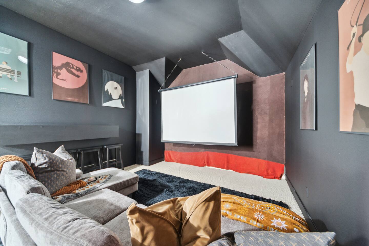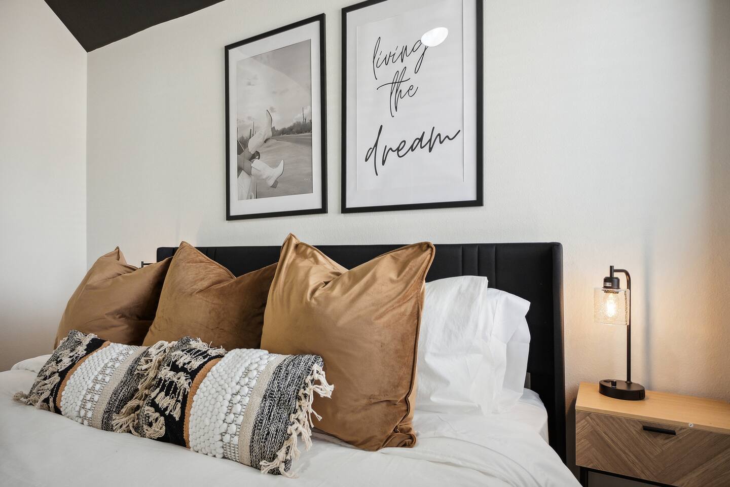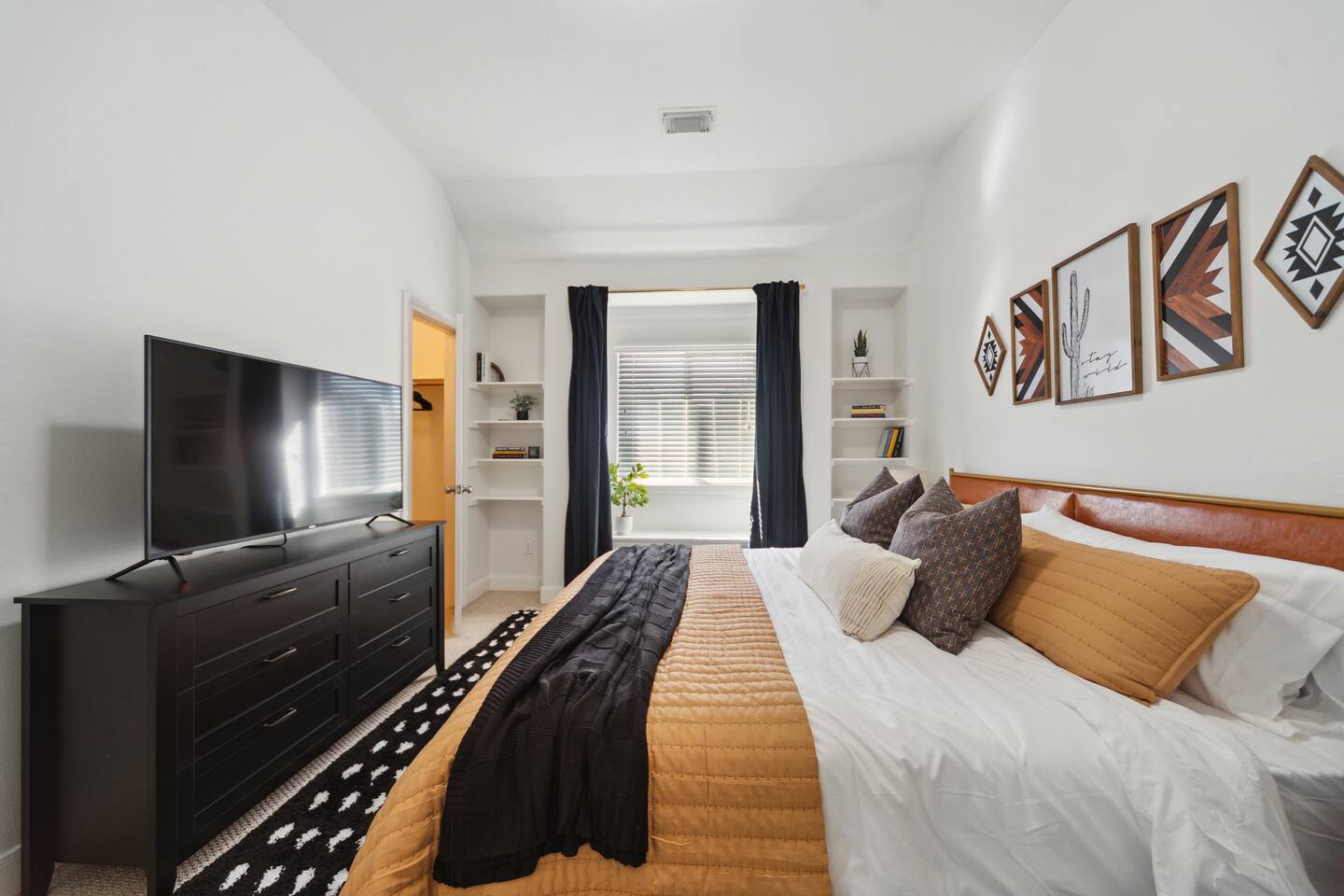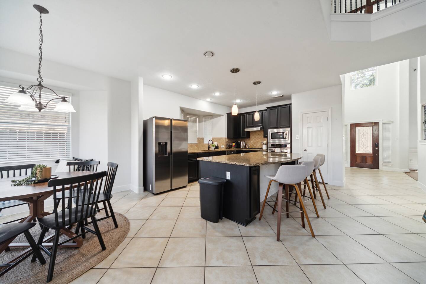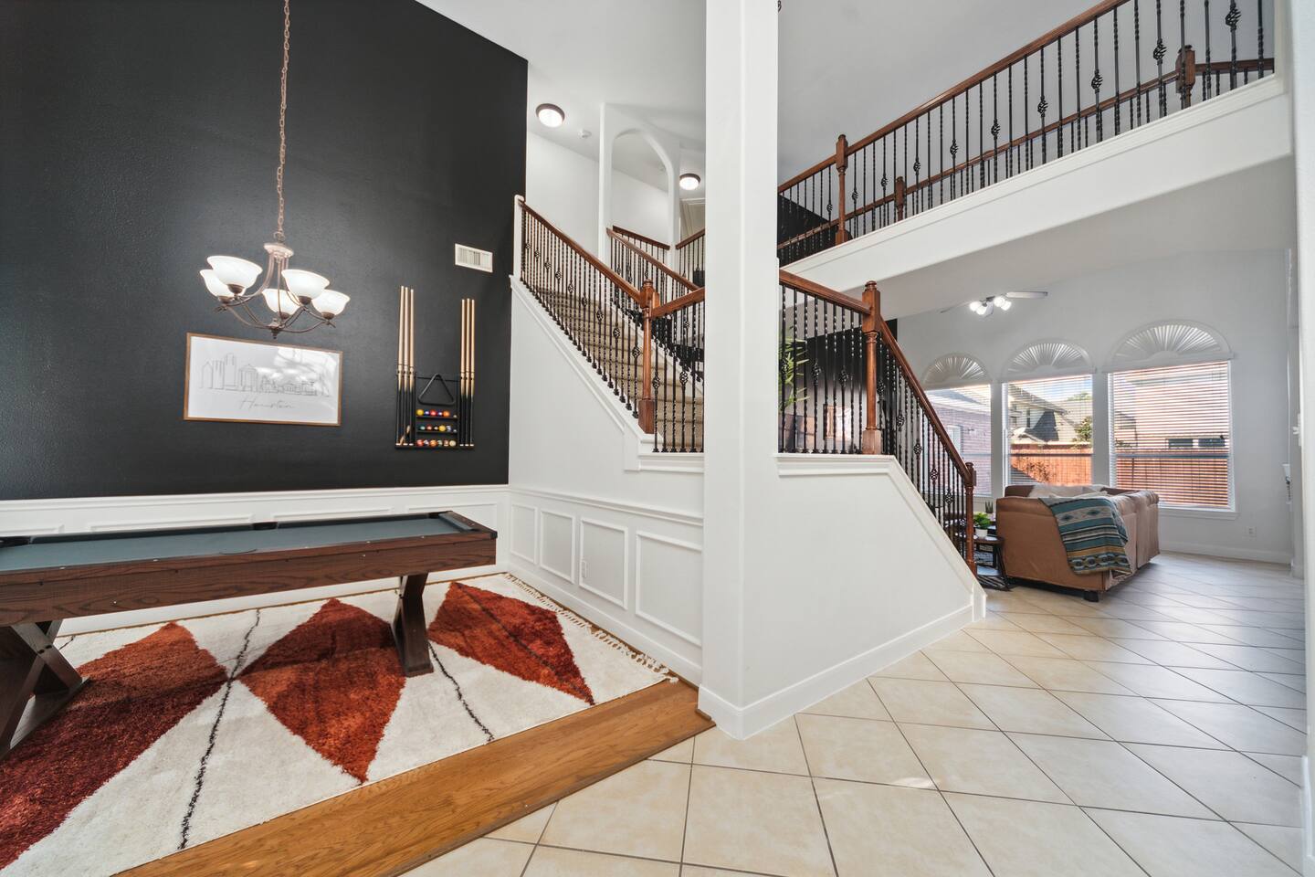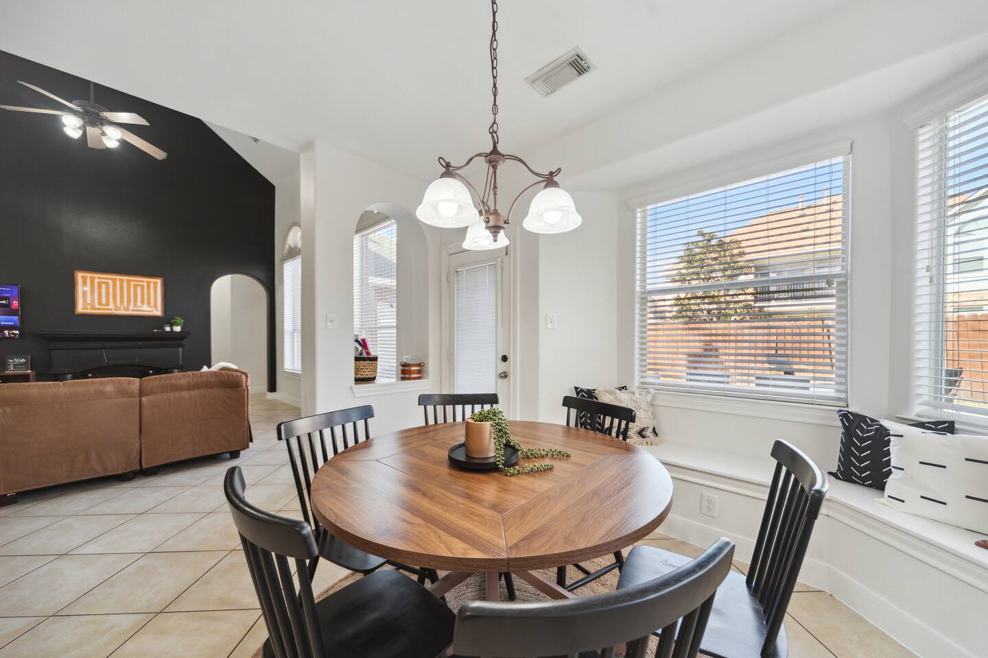 Welcome to the Modern Texan Retreat! This spacious home has plenty of space for everyone. Upon arrival you will find plenty of parking with a 3 car garage and expansive driveway on this corner lot property. Come in and get settled! Walking into the property you’ll be met with big Texas style in our oversized game room with pool table and office space directly off the entry way. This space flows perfectly into the open concept kitchen, dining and living spaces with plenty of seating for your whole group. Our kitchen is readily stocked with all of your basic cooking supplies including spices, cookware, bakeware, Kuerig Duo coffee maker & coffee, blender, air fryer and more! Say “howdy” to the spacious living room, complete with a large sectional couch, 65 in TV and gas fireplace for those colder nights & game day fun! On the main level you will also find the massive primary suite with a king size bed, dresser, seating & oversized primary bathroom with a large soaking tub, walk in shower and plenty of closet space! The half bathroom off the hallway and laundry room can also be found on this level with direct access to the garage. Head upstairs to find the 4 additional bedrooms. Each room consists of a bed, dresser, smart tv & more. We have 3 king size beds, two queen size beds, a futon & queen air mattress in the home, each in their own individual rooms. For our younger travelers we also supply a pack n play in the primary room. Upstairs has two additional full bathrooms, both with a tub/shower combo and of course our incredible theatre room with massage chairs for your viewing pleasure! This room is the perfect place for additional guests to sleep and stays quite dark! Outside we have set you up with a fire pit area with cooktop fire pit, charcoal BBQ grill, hot tub, play area (playset has been disassembled and will be replaced at a later date) and plenty of seating! You have direct access to this space through the primary bedroom and the dining room/living room areas. Our backyard is fully fenced in, making it perfect for our small or furry friends!