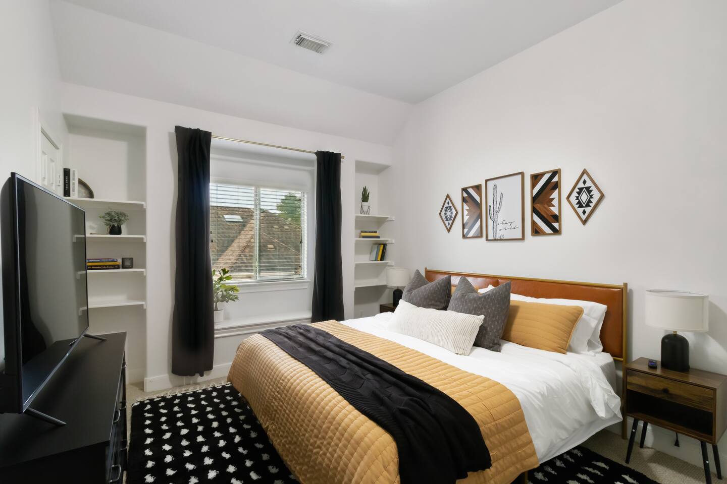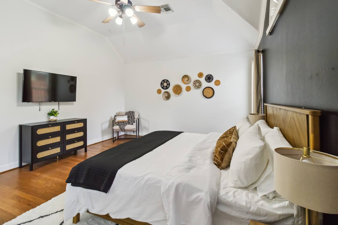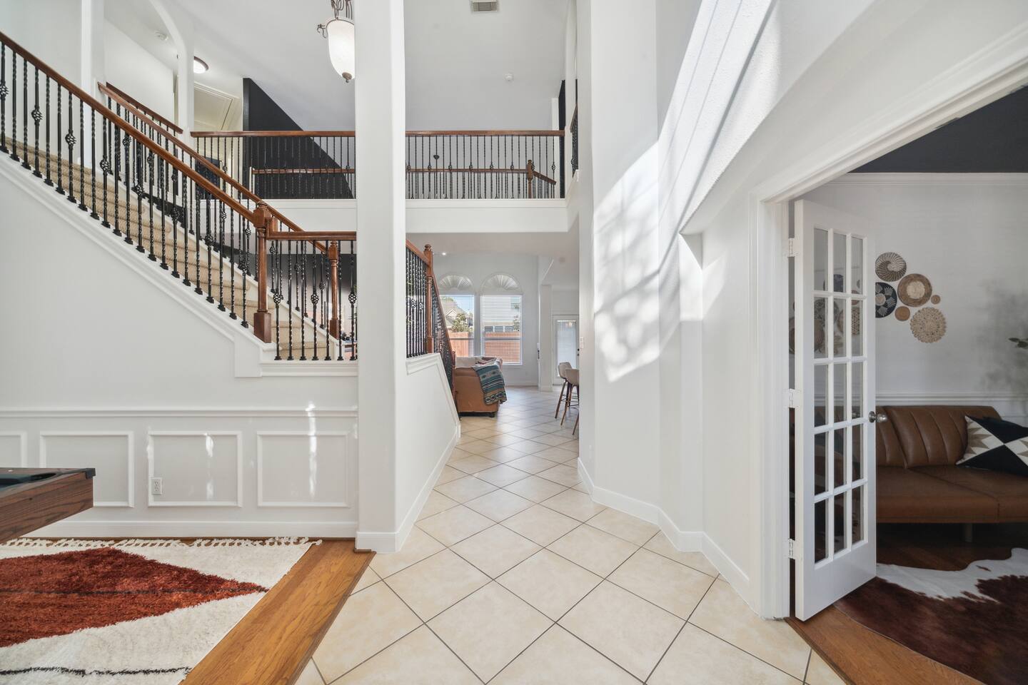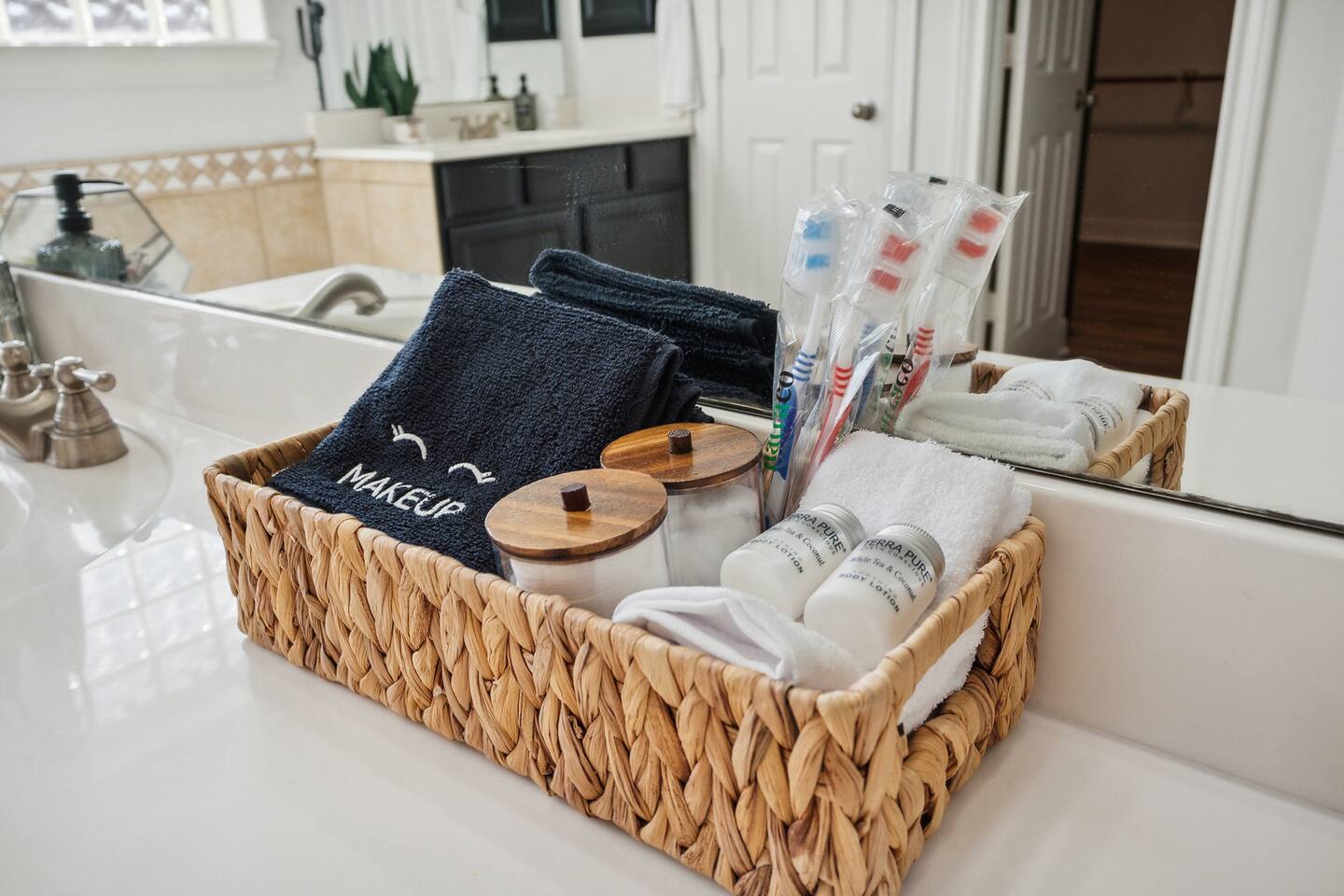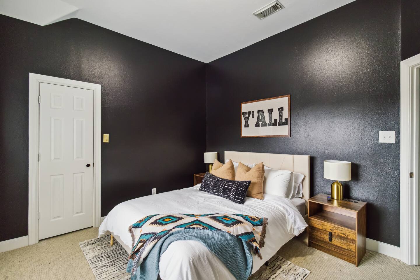 Welcome to the Modern Texan Retreat! This spacious home has plenty of space for everyone. Upon arrival you will find plenty of parking with a 3 car garage and expansive driveway on this corner lot property. Come in and get settled! Walking into the property you’ll be met with big Texas style in our oversized game room with pool table and office space directly off the entry way. This space flows perfectly into the open concept kitchen, dining and living spaces with plenty of seating for your whole group. Our kitchen is readily stocked with all of your basic cooking supplies including spices, cookware, bakeware, Kuerig Duo coffee maker & coffee, blender, air fryer and more! Say “howdy” to the spacious living room, complete with a large sectional couch, 65 in TV and gas fireplace for those colder nights & game day fun! On the main level you will also find the massive primary suite with a king size bed, dresser, seating & oversized primary bathroom with a large soaking tub, walk in shower and plenty of closet space! The half bathroom off the hallway and laundry room can also be found on this level with direct access to the garage. Head upstairs to find the 4 additional bedrooms. Each room consists of a bed, dresser, smart tv & more. We have 3 king size beds, two queen size beds, a futon & queen air mattress in the home, each in their own individual rooms. For our younger travelers we also supply a pack n play in the primary room. Upstairs has two additional full bathrooms, both with a tub/shower combo and of course our incredible theatre room with massage chairs for your viewing pleasure! This room is the perfect place for additional guests to sleep and stays quite dark! Outside we have set you up with a fire pit area with cooktop fire pit, charcoal BBQ grill, hot tub, play area (playset has been disassembled and will be replaced at a later date) and plenty of seating! You have direct access to this space through the primary bedroom and the dining room/living room areas. Our backyard is fully fenced in, making it perfect for our small or furry friends!