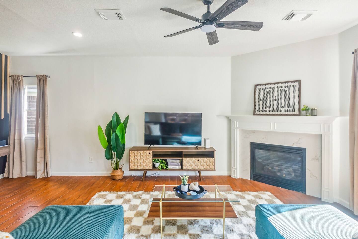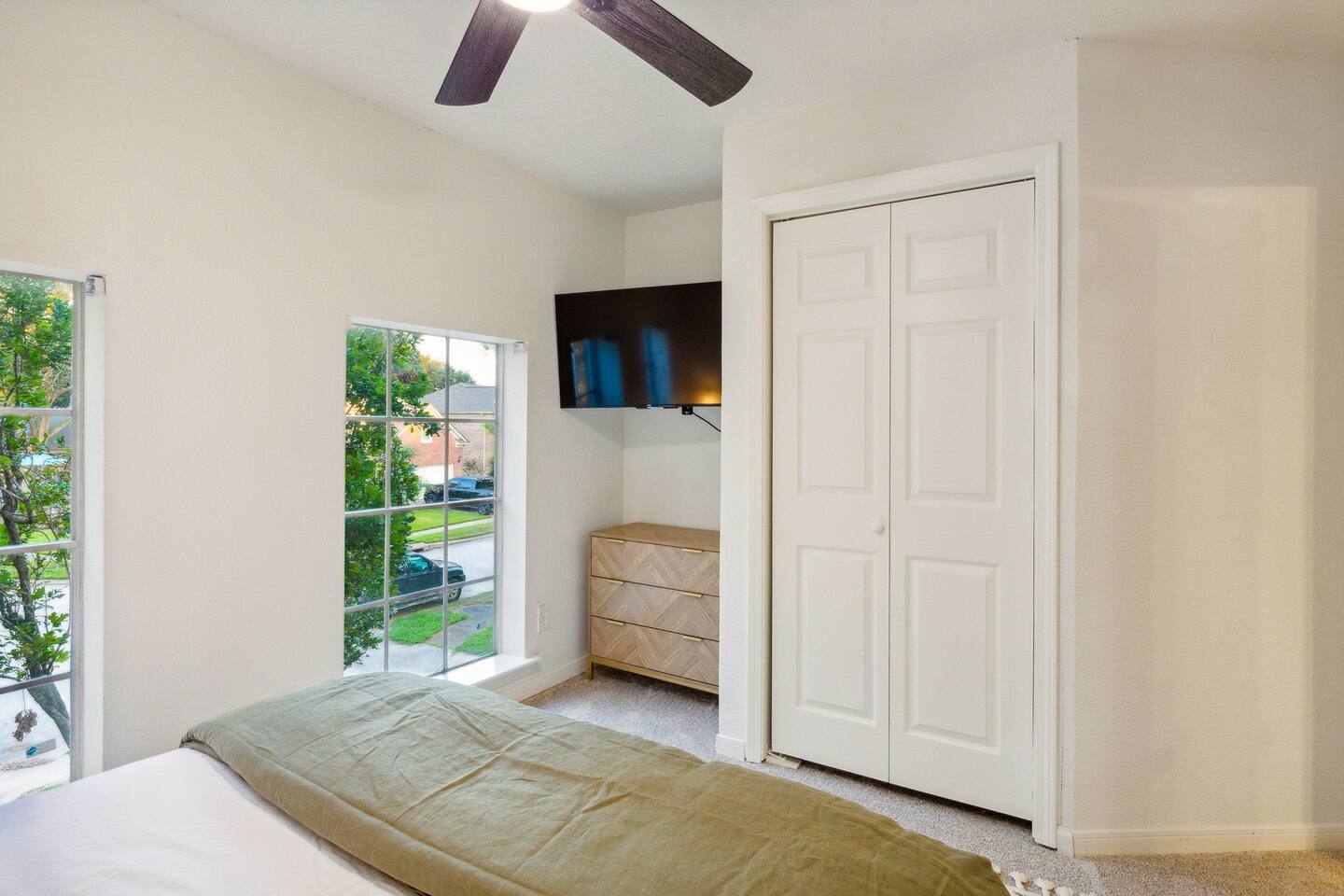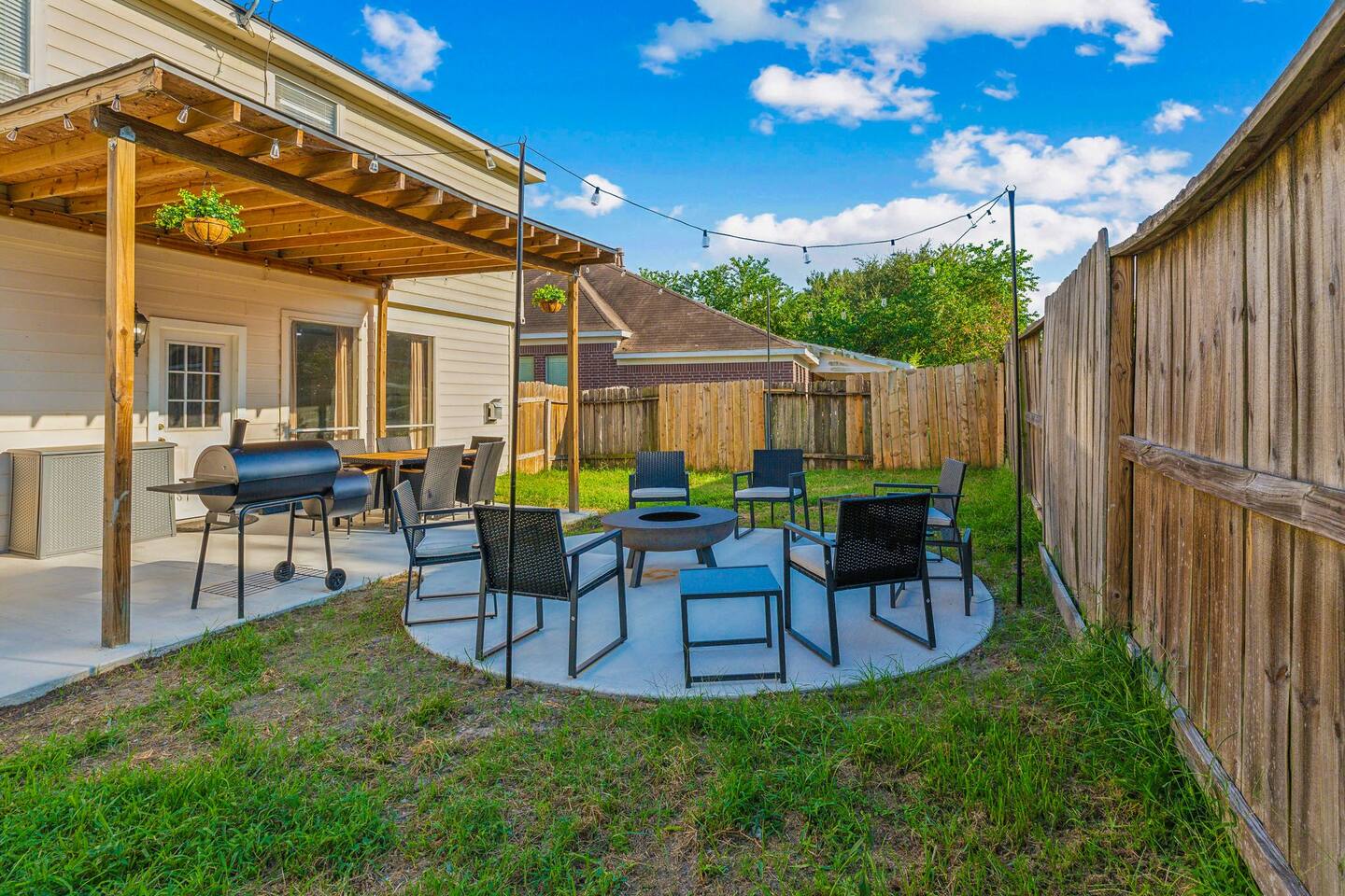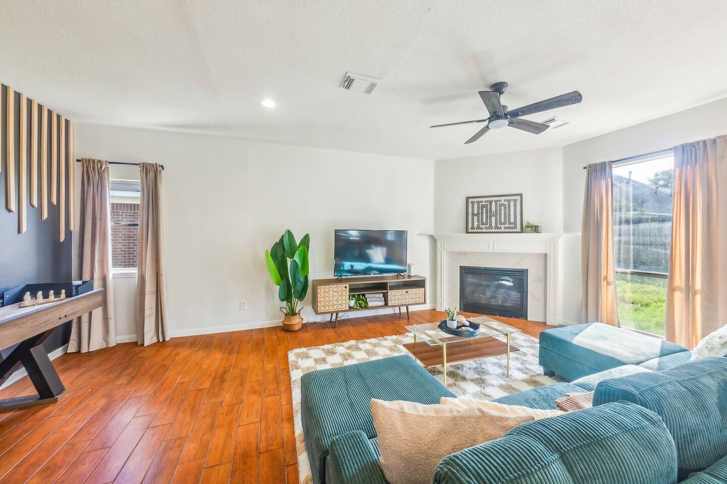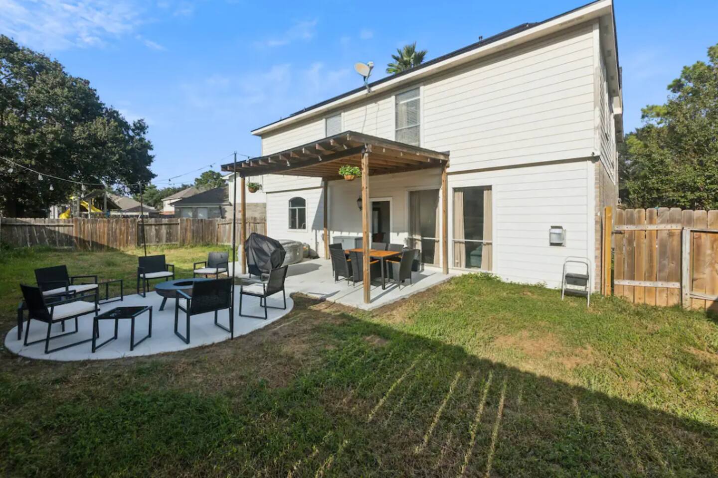 Welcome to the Vintage Texan rental, your perfect getaway in Cypress, TX! Located in a quiet cul-de-sac, this charming 5-bedroom, 3.5-bath home offers comfort, convenience, and all the amenities you need for a memorable short or mid-term stay. The house sits on an oversized lot at the bend of the road, providing a peaceful and spacious retreat for families, groups, or business travelers. Upon entering the neighborhood, you’ll immediately notice the serene atmosphere, ideal for a relaxing stay away from the hustle and bustle of the city. Parking is a breeze, with a two-car garage and a large driveway that can accommodate up to four cars. There's also ample street parking available. The front yard, adorned with a beautiful palm tree and well-lit landscaping, creates a warm and inviting welcome. Your arrival will be seamless, thanks to our Yale smart lock, pre-programmed with the last four digits of your phone number. This convenient feature ensures that accessing the home is effortless throughout your stay. As you step through the front door, you’re greeted by a cozy sitting area, perfect for luggage drop-off or a moment to relax. Here, you’ll also find a welcome gift and our house manual with all the information you need to make your stay as smooth as possible. The front sitting area leads into the open and airy dining room, which is spacious enough for large family meals or gatherings with friends. The dining area flows seamlessly into the beautifully updated kitchen, which is fully stocked with everything you’ll need for your stay. Whether you're preparing a gourmet meal, brewing a fresh cup of coffee in the morning, or stocking the fridge and pantry with snacks, the kitchen is designed to accommodate every culinary need. Stainless steel appliances and ample counter space make meal prep a breeze. Just around the corner, you'll find the main living room downstairs. This open-concept space features a cozy U-shaped sectional, a large TV, and a beautiful remote-controlled fireplace, perfect for relaxing after a long day. The shuffleboard table adds a fun element to the space, inviting friendly competition among guests. From the living room, you can easily access the backyard, making BBQ season that much easier. At the front of the house, the staircase takes you to the second floor, where the space splits into two wings. To the right, you'll find the game room, complete with a pool table ready for your next match. This side of the house also features a private bedroom with a queen bed and its own ensuite bathroom, complete with a walk-in shower—ideal for guests seeking extra privacy. On the left side of the second floor, you’ll discover a cozy upstairs living room, thoughtfully designed with kids in mind. It features a comfortable modular sleeper sofa, a TV, and a soft, washable rug. This room provides a perfect space for younger guests to relax and watch their favorite shows or movies. Off this living room is the primary bedroom, your own personal sanctuary during your stay. This luxurious room includes a king-size bed, a sitting chair, and a TV for unwinding with a good movie or show. The en-suite bathroom is equally impressive, featuring a large soaking tub, a walk-in shower with a rainhead, and a double vanity. You'll have plenty of storage space with a walk-in closet and dresser, ensuring you can unpack and feel right at home. The primary suite also includes a dual-purpose room just off the bedroom. This additional space is furnished with a full-size daybed and a sit/stand desk, perfect for anyone needing a quiet workspace. The 43-inch TV in this room can also double as a monitor if needed. On the opposite side of the upstairs living room, you’ll find two additional bedrooms and a third bathroom. One bedroom is equipped with a king-size bed, while the other features a queen-size bed. Both rooms include smart TVs and sit/stand desks, offering even more work-from-home options. The shared bathroom on this side has a full-size tub and shower combo, ensuring all guests have access to everything they need for a comfortable stay. Now, step outside into the backyard, where a brand-new concrete slab has been poured to create the ultimate outdoor oasis. The backyard is fully fenced, making it a safe and fun space for children and pets to roam freely. A string of lights surrounds the outdoor area, creating a cozy and inviting atmosphere for evenings under the stars. A large 7-person inflatable hot tub awaits you, perfect for relaxing after a long day of exploring or working. Gather around the fire pit, which seats six comfortably, and enjoy a night of conversation and s’mores with family or friends. In addition to the hot tub and fire pit, the backyard includes a BBQ area complete with a charcoal grill and smoker for all your outdoor cooking needs. The outdoor dining space provides plenty of seating for meals al fresco, making this area ideal for BBQ season. Our location is a highlight of the Vintage Texan. We're just 20-30 minutes from downtown Houston and only 10 minutes from the Cypress Boardwalk, offering quick access to dining, shopping, and entertainment. This home is also conveniently located near highly rated schools, top-tier medical facilities, and a variety of shopping options, making it the perfect place for families and professionals alike. We’ve designed every aspect of this home with comfort, convenience, and enjoyment in mind. Whether you’re here for work, play, or a little of both, our Vintage Texan rental is the perfect place to relax, unwind, and create lasting memories. We hope you enjoy your stay, and if you have any questions during your visit, please don't hesitate to reach out!
