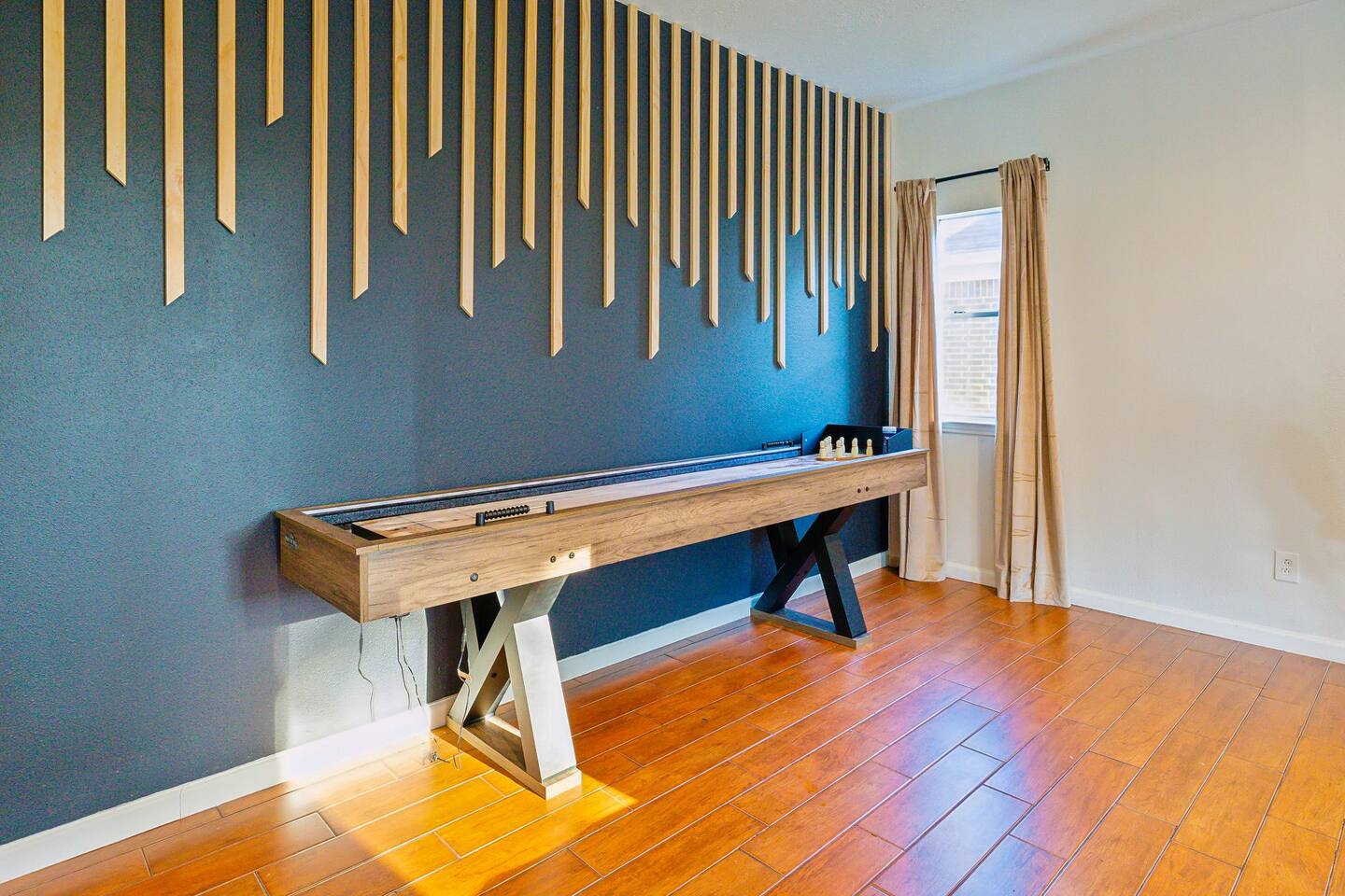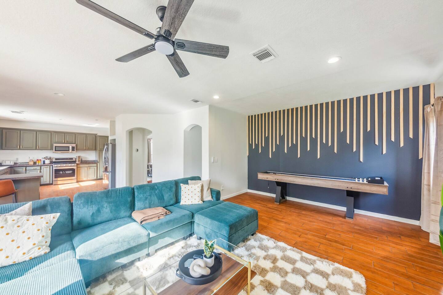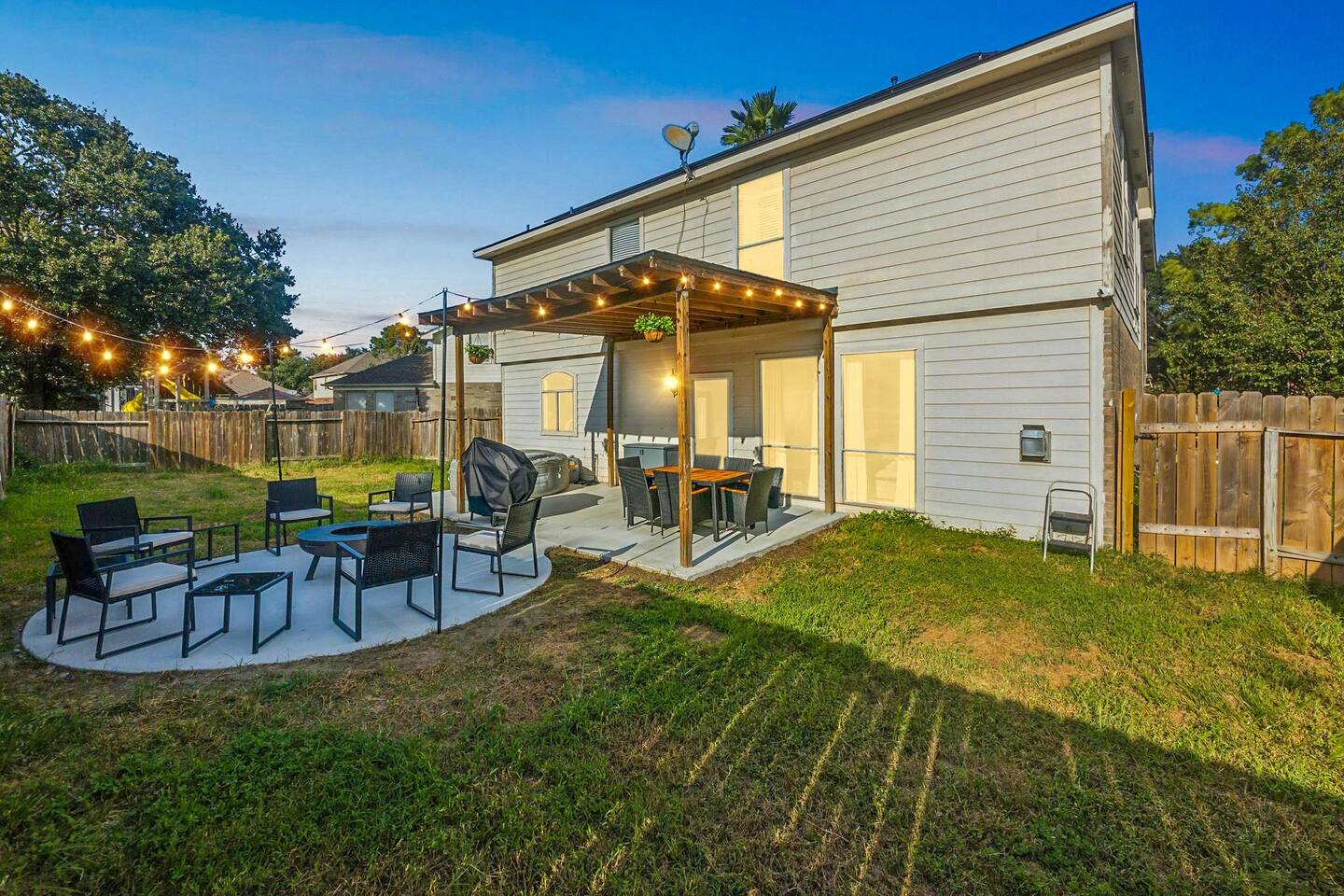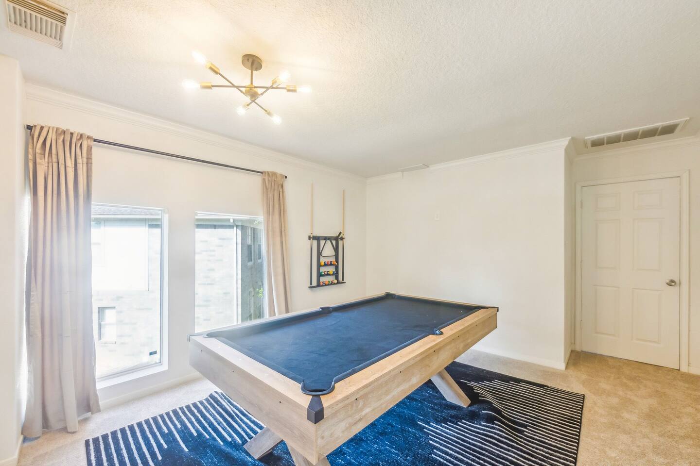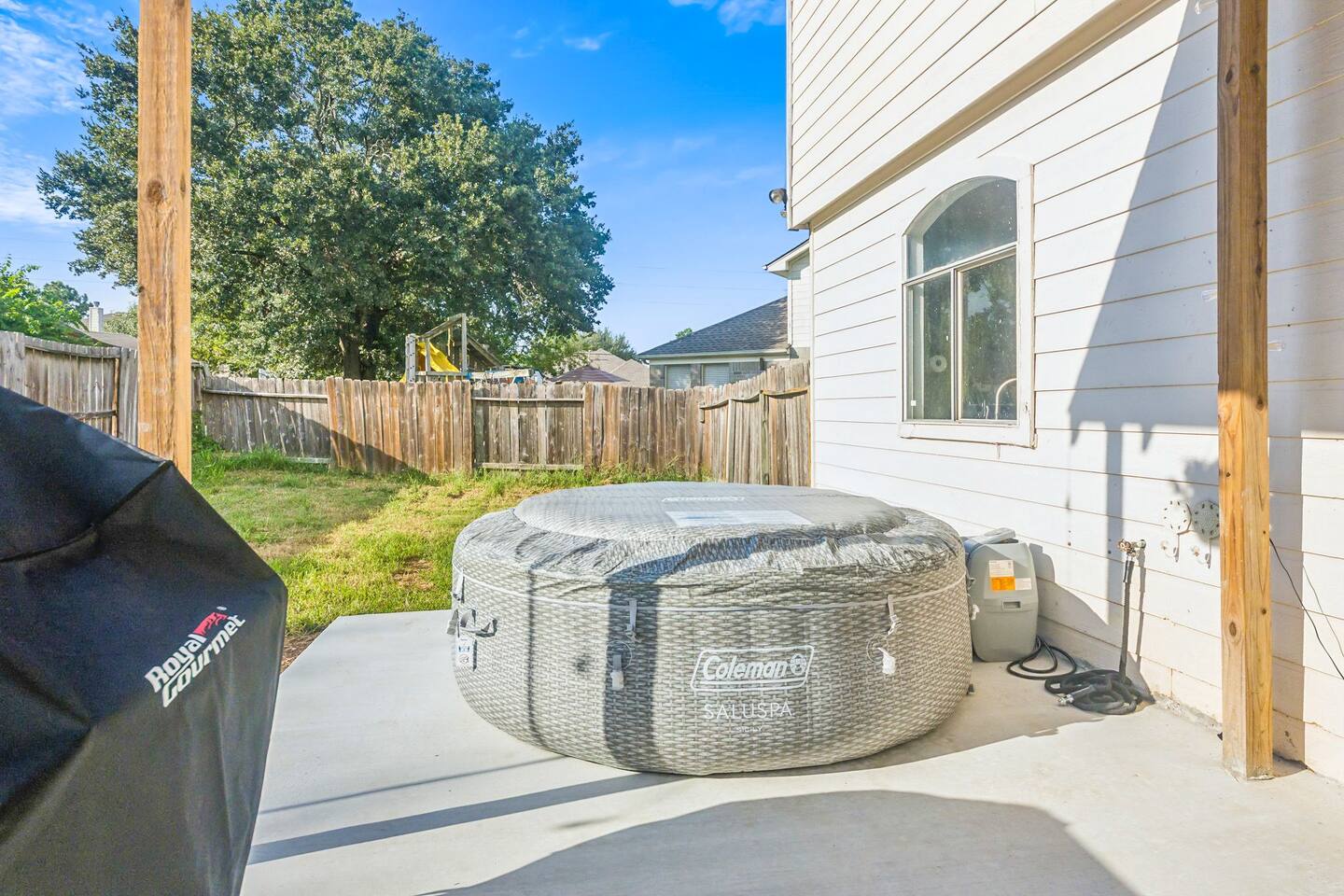 Welcome to the Vintage Texan rental, your perfect getaway in Cypress, TX! Located in a quiet cul-de-sac, this charming 5-bedroom, 3.5-bath home offers comfort, convenience, and all the amenities you need for a memorable short or mid-term stay. The house sits on an oversized lot at the bend of the road, providing a peaceful and spacious retreat for families, groups, or business travelers. Upon entering the neighborhood, you’ll immediately notice the serene atmosphere, ideal for a relaxing stay away from the hustle and bustle of the city. Parking is a breeze, with a two-car garage and a large driveway that can accommodate up to four cars. There's also ample street parking available. The front yard, adorned with a beautiful palm tree and well-lit landscaping, creates a warm and inviting welcome. Your arrival will be seamless, thanks to our Yale smart lock, pre-programmed with the last four digits of your phone number. This convenient feature ensures that accessing the home is effortless throughout your stay. As you step through the front door, you’re greeted by a cozy sitting area, perfect for luggage drop-off or a moment to relax. Here, you’ll also find a welcome gift and our house manual with all the information you need to make your stay as smooth as possible. The front sitting area leads into the open and airy dining room, which is spacious enough for large family meals or gatherings with friends. The dining area flows seamlessly into the beautifully updated kitchen, which is fully stocked with everything you’ll need for your stay. Whether you're preparing a gourmet meal, brewing a fresh cup of coffee in the morning, or stocking the fridge and pantry with snacks, the kitchen is designed to accommodate every culinary need. Stainless steel appliances and ample counter space make meal prep a breeze. Just around the corner, you'll find the main living room downstairs. This open-concept space features a cozy U-shaped sectional, a large TV, and a beautiful remote-controlled fireplace, perfect for relaxing after a long day. The shuffleboard table adds a fun element to the space, inviting friendly competition among guests. From the living room, you can easily access the backyard, making BBQ season that much easier. At the front of the house, the staircase takes you to the second floor, where the space splits into two wings. To the right, you'll find the game room, complete with a pool table ready for your next match. This side of the house also features a private bedroom with a queen bed and its own ensuite bathroom, complete with a walk-in shower—ideal for guests seeking extra privacy. On the left side of the second floor, you’ll discover a cozy upstairs living room, thoughtfully designed with kids in mind. It features a comfortable modular sleeper sofa, a TV, and a soft, washable rug. This room provides a perfect space for younger guests to relax and watch their favorite shows or movies. Off this living room is the primary bedroom, your own personal sanctuary during your stay. This luxurious room includes a king-size bed, a sitting chair, and a TV for unwinding with a good movie or show. The en-suite bathroom is equally impressive, featuring a large soaking tub, a walk-in shower with a rainhead, and a double vanity. You'll have plenty of storage space with a walk-in closet and dresser, ensuring you can unpack and feel right at home. The primary suite also includes a dual-purpose room just off the bedroom. This additional space is furnished with a full-size daybed and a sit/stand desk, perfect for anyone needing a quiet workspace. The 43-inch TV in this room can also double as a monitor if needed. On the opposite side of the upstairs living room, you’ll find two additional bedrooms and a third bathroom. One bedroom is equipped with a king-size bed, while the other features a queen-size bed. Both rooms include smart TVs and sit/stand desks, offering even more work-from-home options. The shared bathroom on this side has a full-size tub and shower combo, ensuring all guests have access to everything they need for a comfortable stay. Now, step outside into the backyard, where a brand-new concrete slab has been poured to create the ultimate outdoor oasis. The backyard is fully fenced, making it a safe and fun space for children and pets to roam freely. A string of lights surrounds the outdoor area, creating a cozy and inviting atmosphere for evenings under the stars. A large 7-person inflatable hot tub awaits you, perfect for relaxing after a long day of exploring or working. Gather around the fire pit, which seats six comfortably, and enjoy a night of conversation and s’mores with family or friends. In addition to the hot tub and fire pit, the backyard includes a BBQ area complete with a charcoal grill and smoker for all your outdoor cooking needs. The outdoor dining space provides plenty of seating for meals al fresco, making this area ideal for BBQ season. Our location is a highlight of the Vintage Texan. We're just 20-30 minutes from downtown Houston and only 10 minutes from the Cypress Boardwalk, offering quick access to dining, shopping, and entertainment. This home is also conveniently located near highly rated schools, top-tier medical facilities, and a variety of shopping options, making it the perfect place for families and professionals alike. We’ve designed every aspect of this home with comfort, convenience, and enjoyment in mind. Whether you’re here for work, play, or a little of both, our Vintage Texan rental is the perfect place to relax, unwind, and create lasting memories. We hope you enjoy your stay, and if you have any questions during your visit, please don't hesitate to reach out!
