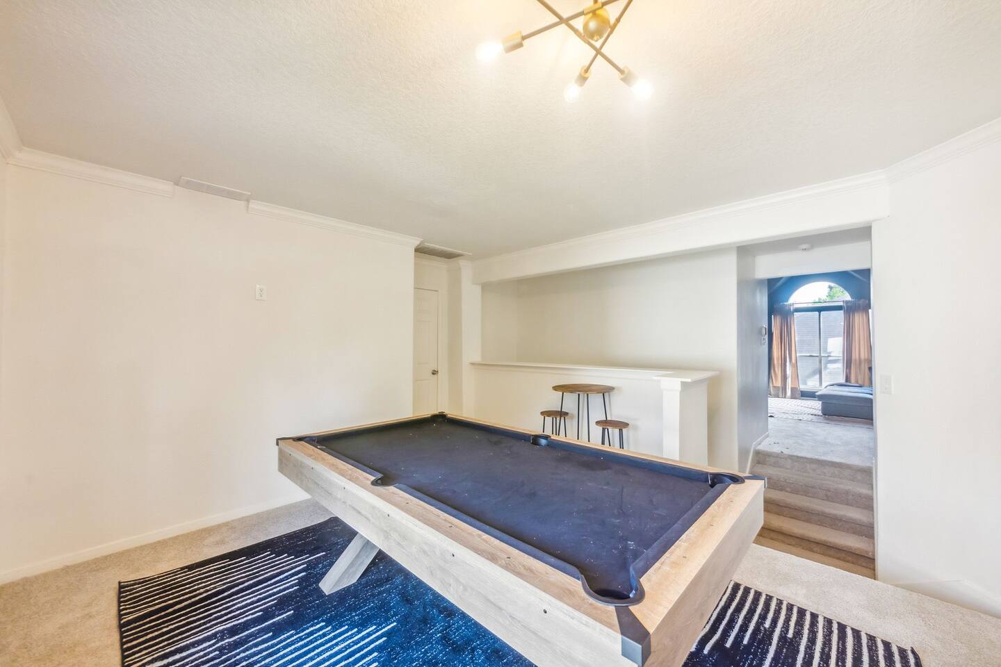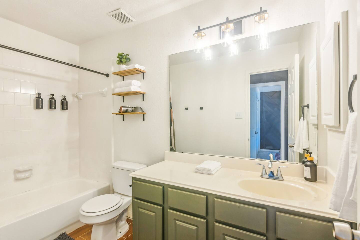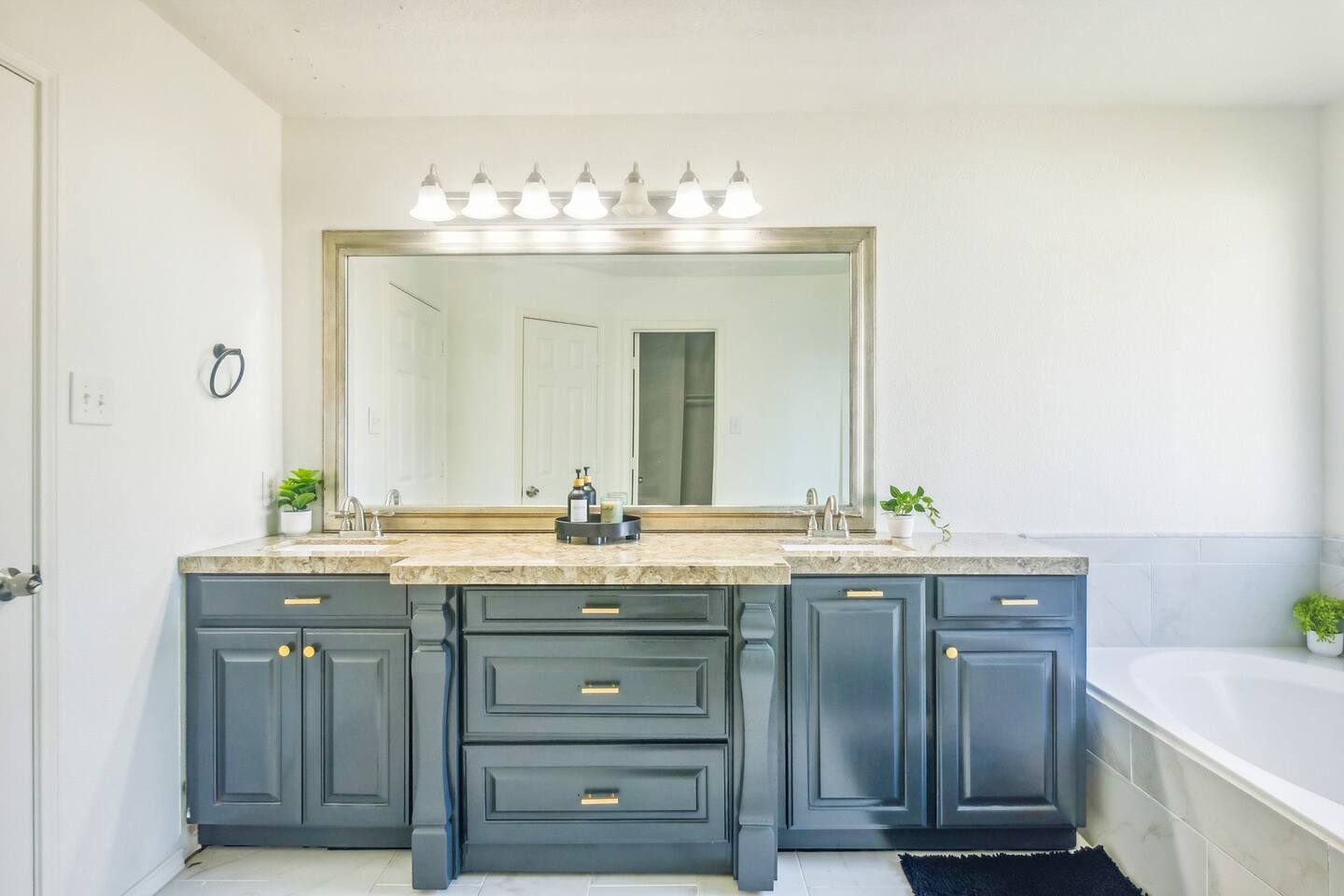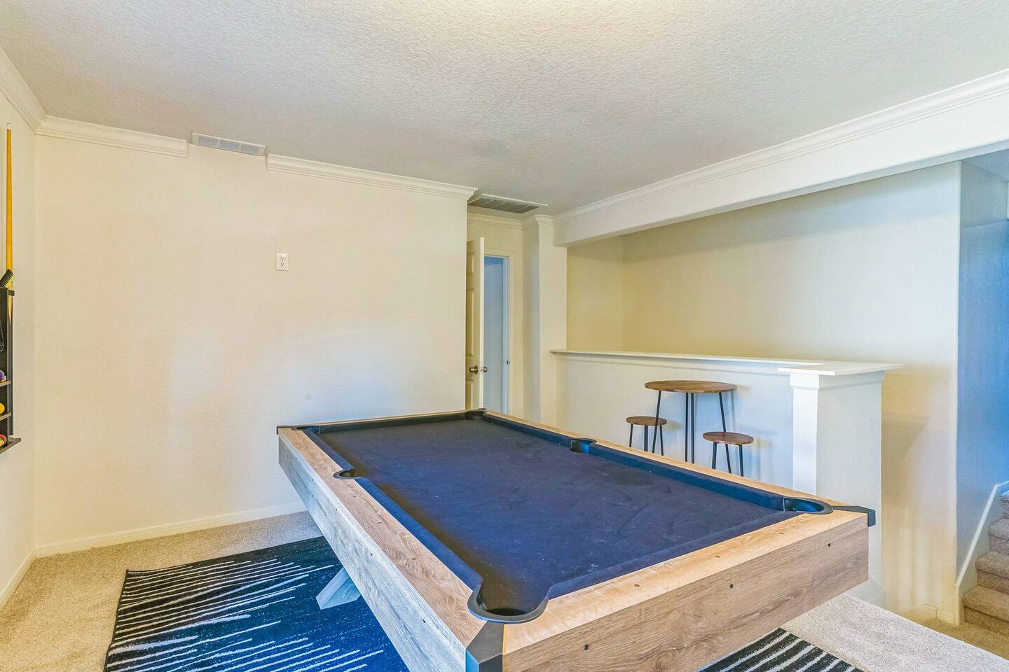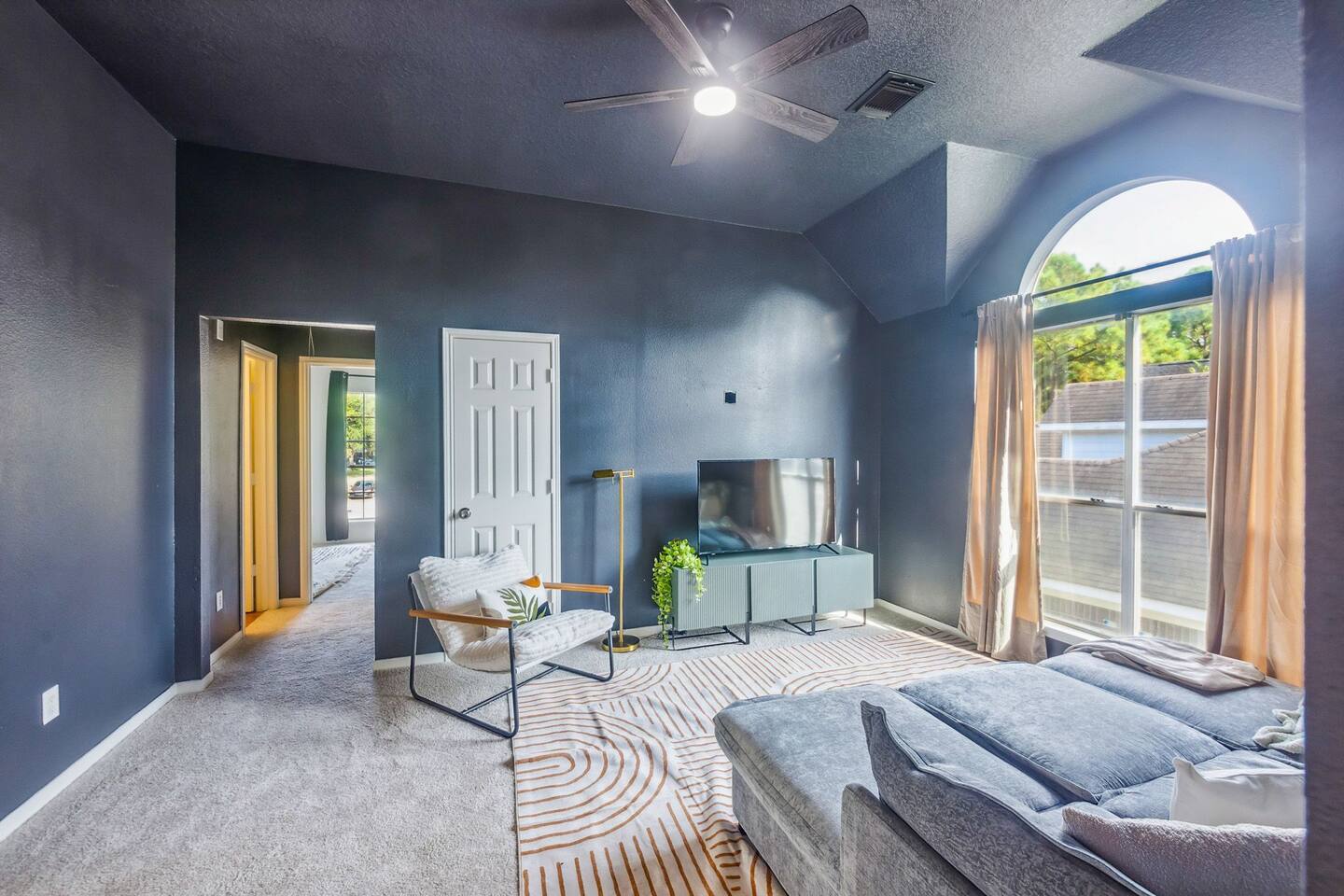 Welcome to the Vintage Texan rental, your perfect getaway in Cypress, TX! Located in a quiet cul-de-sac, this charming 5-bedroom, 3.5-bath home offers comfort, convenience, and all the amenities you need for a memorable short or mid-term stay. The house sits on an oversized lot at the bend of the road, providing a peaceful and spacious retreat for families, groups, or business travelers. Upon entering the neighborhood, you’ll immediately notice the serene atmosphere, ideal for a relaxing stay away from the hustle and bustle of the city. Parking is a breeze, with a two-car garage and a large driveway that can accommodate up to four cars. There's also ample street parking available. The front yard, adorned with a beautiful palm tree and well-lit landscaping, creates a warm and inviting welcome. Your arrival will be seamless, thanks to our Yale smart lock, pre-programmed with the last four digits of your phone number. This convenient feature ensures that accessing the home is effortless throughout your stay. As you step through the front door, you’re greeted by a cozy sitting area, perfect for luggage drop-off or a moment to relax. Here, you’ll also find a welcome gift and our house manual with all the information you need to make your stay as smooth as possible. The front sitting area leads into the open and airy dining room, which is spacious enough for large family meals or gatherings with friends. The dining area flows seamlessly into the beautifully updated kitchen, which is fully stocked with everything you’ll need for your stay. Whether you're preparing a gourmet meal, brewing a fresh cup of coffee in the morning, or stocking the fridge and pantry with snacks, the kitchen is designed to accommodate every culinary need. Stainless steel appliances and ample counter space make meal prep a breeze. Just around the corner, you'll find the main living room downstairs. This open-concept space features a cozy U-shaped sectional, a large TV, and a beautiful remote-controlled fireplace, perfect for relaxing after a long day. The shuffleboard table adds a fun element to the space, inviting friendly competition among guests. From the living room, you can easily access the backyard, making BBQ season that much easier. At the front of the house, the staircase takes you to the second floor, where the space splits into two wings. To the right, you'll find the game room, complete with a pool table ready for your next match. This side of the house also features a private bedroom with a queen bed and its own ensuite bathroom, complete with a walk-in shower—ideal for guests seeking extra privacy. On the left side of the second floor, you’ll discover a cozy upstairs living room, thoughtfully designed with kids in mind. It features a comfortable modular sleeper sofa, a TV, and a soft, washable rug. This room provides a perfect space for younger guests to relax and watch their favorite shows or movies. Off this living room is the primary bedroom, your own personal sanctuary during your stay. This luxurious room includes a king-size bed, a sitting chair, and a TV for unwinding with a good movie or show. The en-suite bathroom is equally impressive, featuring a large soaking tub, a walk-in shower with a rainhead, and a double vanity. You'll have plenty of storage space with a walk-in closet and dresser, ensuring you can unpack and feel right at home. The primary suite also includes a dual-purpose room just off the bedroom. This additional space is furnished with a full-size daybed and a sit/stand desk, perfect for anyone needing a quiet workspace. The 43-inch TV in this room can also double as a monitor if needed. On the opposite side of the upstairs living room, you’ll find two additional bedrooms and a third bathroom. One bedroom is equipped with a king-size bed, while the other features a queen-size bed. Both rooms include smart TVs and sit/stand desks, offering even more work-from-home options. The shared bathroom on this side has a full-size tub and shower combo, ensuring all guests have access to everything they need for a comfortable stay. Now, step outside into the backyard, where a brand-new concrete slab has been poured to create the ultimate outdoor oasis. The backyard is fully fenced, making it a safe and fun space for children and pets to roam freely. A string of lights surrounds the outdoor area, creating a cozy and inviting atmosphere for evenings under the stars. A large 7-person inflatable hot tub awaits you, perfect for relaxing after a long day of exploring or working. Gather around the fire pit, which seats six comfortably, and enjoy a night of conversation and s’mores with family or friends. In addition to the hot tub and fire pit, the backyard includes a BBQ area complete with a charcoal grill and smoker for all your outdoor cooking needs. The outdoor dining space provides plenty of seating for meals al fresco, making this area ideal for BBQ season. Our location is a highlight of the Vintage Texan. We're just 20-30 minutes from downtown Houston and only 10 minutes from the Cypress Boardwalk, offering quick access to dining, shopping, and entertainment. This home is also conveniently located near highly rated schools, top-tier medical facilities, and a variety of shopping options, making it the perfect place for families and professionals alike. We’ve designed every aspect of this home with comfort, convenience, and enjoyment in mind. Whether you’re here for work, play, or a little of both, our Vintage Texan rental is the perfect place to relax, unwind, and create lasting memories. We hope you enjoy your stay, and if you have any questions during your visit, please don't hesitate to reach out!