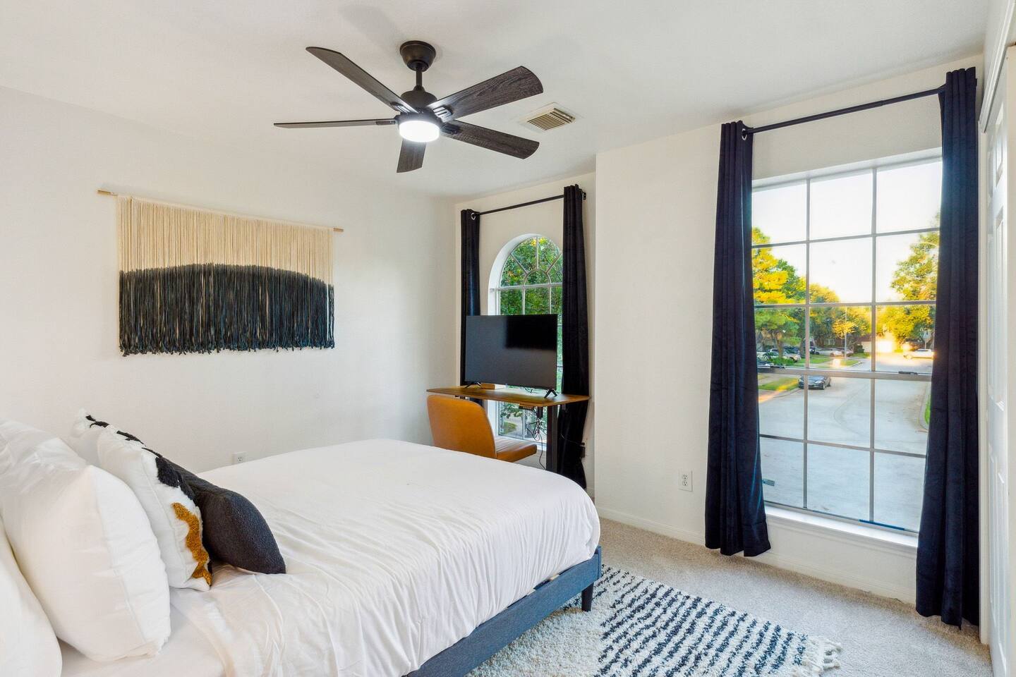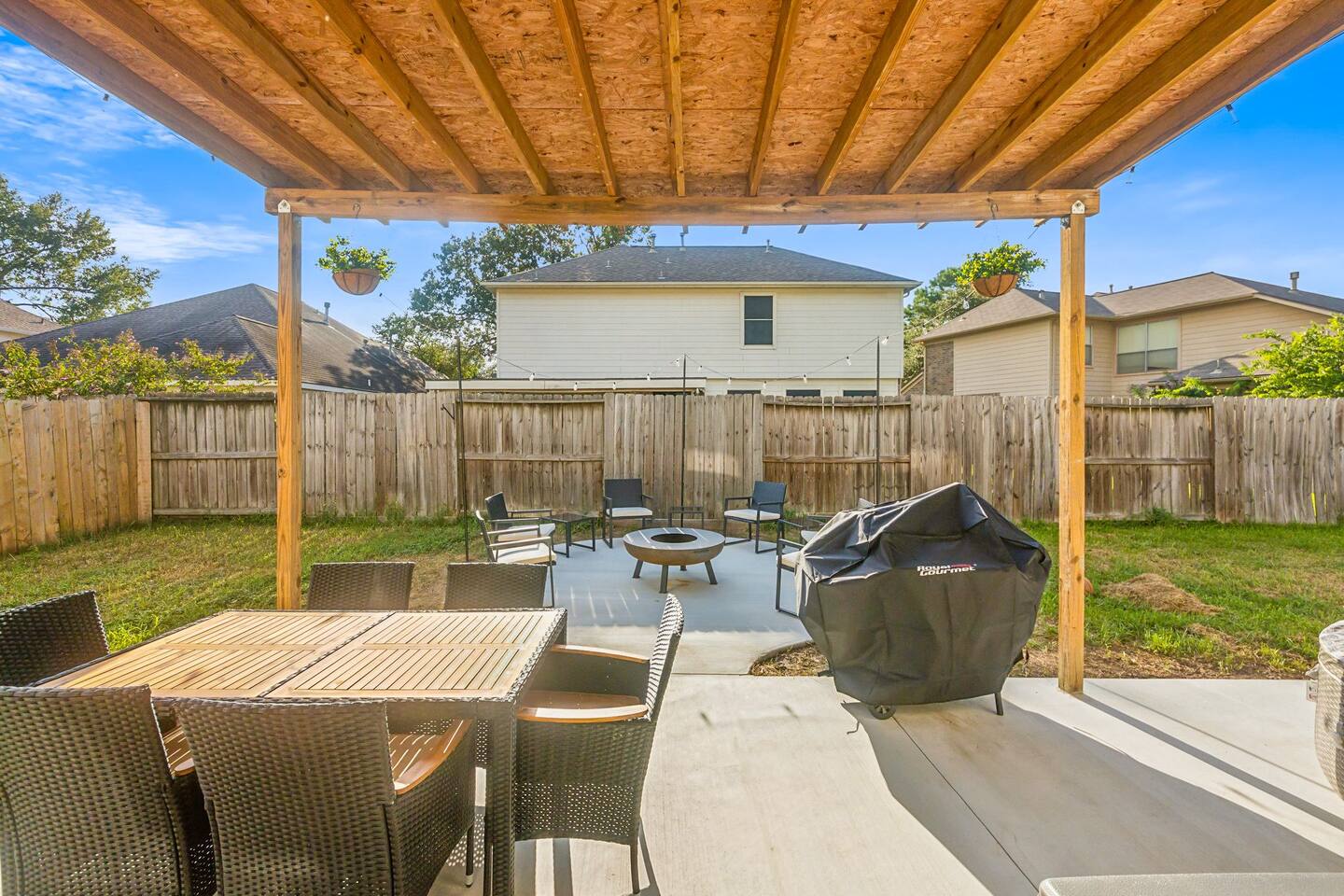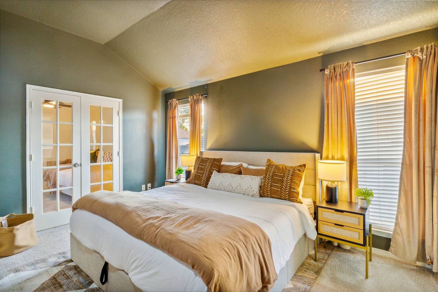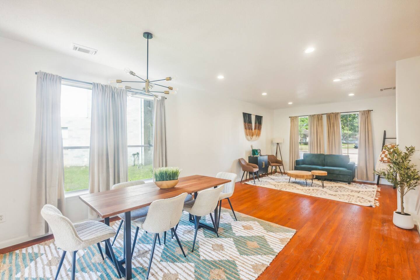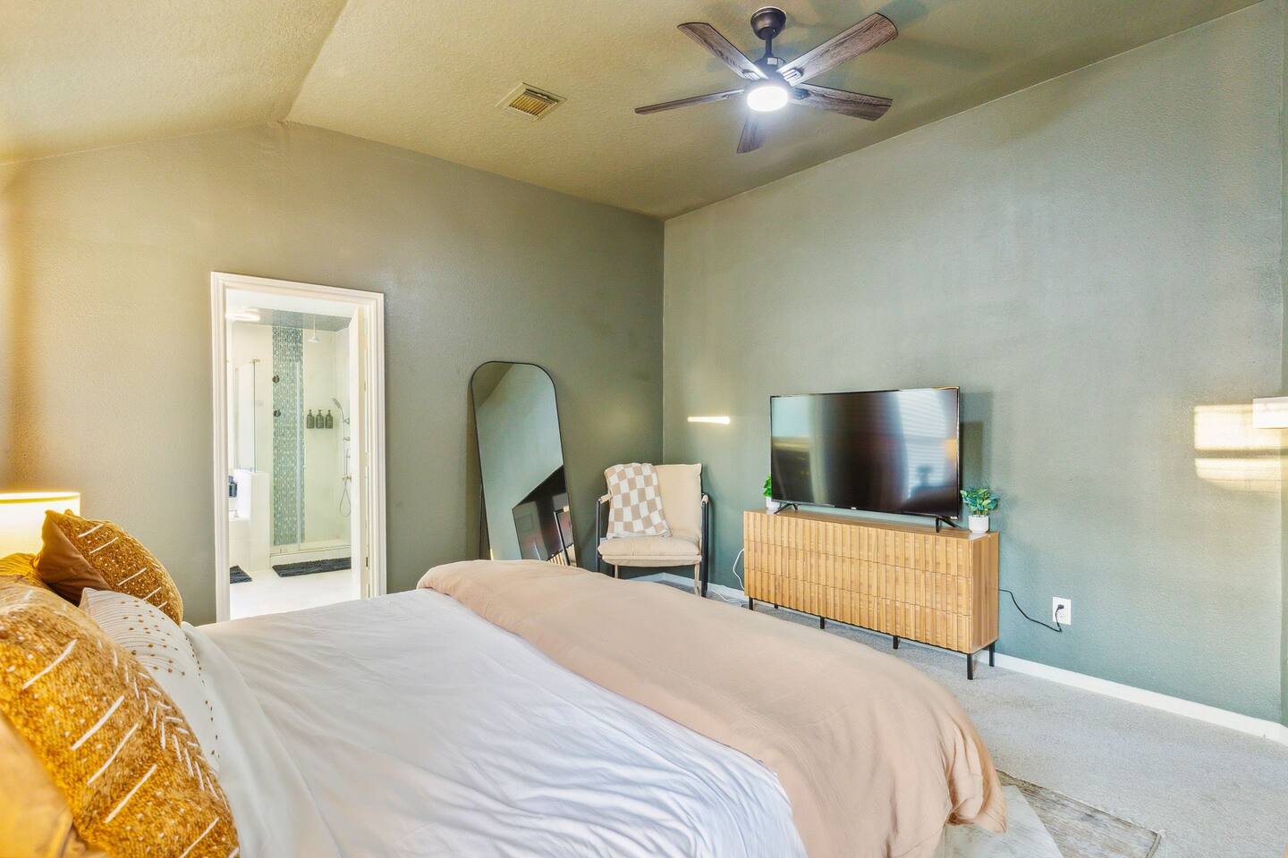 Welcome to the Vintage Texan rental, your perfect getaway in Cypress, TX! Located in a quiet cul-de-sac, this charming 5-bedroom, 3.5-bath home offers comfort, convenience, and all the amenities you need for a memorable short or mid-term stay. The house sits on an oversized lot at the bend of the road, providing a peaceful and spacious retreat for families, groups, or business travelers. Upon entering the neighborhood, you’ll immediately notice the serene atmosphere, ideal for a relaxing stay away from the hustle and bustle of the city. Parking is a breeze, with a two-car garage and a large driveway that can accommodate up to four cars. There's also ample street parking available. The front yard, adorned with a beautiful palm tree and well-lit landscaping, creates a warm and inviting welcome. Your arrival will be seamless, thanks to our Yale smart lock, pre-programmed with the last four digits of your phone number. This convenient feature ensures that accessing the home is effortless throughout your stay. As you step through the front door, you’re greeted by a cozy sitting area, perfect for luggage drop-off or a moment to relax. Here, you’ll also find a welcome gift and our house manual with all the information you need to make your stay as smooth as possible. The front sitting area leads into the open and airy dining room, which is spacious enough for large family meals or gatherings with friends. The dining area flows seamlessly into the beautifully updated kitchen, which is fully stocked with everything you’ll need for your stay. Whether you're preparing a gourmet meal, brewing a fresh cup of coffee in the morning, or stocking the fridge and pantry with snacks, the kitchen is designed to accommodate every culinary need. Stainless steel appliances and ample counter space make meal prep a breeze. Just around the corner, you'll find the main living room downstairs. This open-concept space features a cozy U-shaped sectional, a large TV, and a beautiful remote-controlled fireplace, perfect for relaxing after a long day. The shuffleboard table adds a fun element to the space, inviting friendly competition among guests. From the living room, you can easily access the backyard, making BBQ season that much easier. At the front of the house, the staircase takes you to the second floor, where the space splits into two wings. To the right, you'll find the game room, complete with a pool table ready for your next match. This side of the house also features a private bedroom with a queen bed and its own ensuite bathroom, complete with a walk-in shower—ideal for guests seeking extra privacy. On the left side of the second floor, you’ll discover a cozy upstairs living room, thoughtfully designed with kids in mind. It features a comfortable modular sleeper sofa, a TV, and a soft, washable rug. This room provides a perfect space for younger guests to relax and watch their favorite shows or movies. Off this living room is the primary bedroom, your own personal sanctuary during your stay. This luxurious room includes a king-size bed, a sitting chair, and a TV for unwinding with a good movie or show. The en-suite bathroom is equally impressive, featuring a large soaking tub, a walk-in shower with a rainhead, and a double vanity. You'll have plenty of storage space with a walk-in closet and dresser, ensuring you can unpack and feel right at home. The primary suite also includes a dual-purpose room just off the bedroom. This additional space is furnished with a full-size daybed and a sit/stand desk, perfect for anyone needing a quiet workspace. The 43-inch TV in this room can also double as a monitor if needed. On the opposite side of the upstairs living room, you’ll find two additional bedrooms and a third bathroom. One bedroom is equipped with a king-size bed, while the other features a queen-size bed. Both rooms include smart TVs and sit/stand desks, offering even more work-from-home options. The shared bathroom on this side has a full-size tub and shower combo, ensuring all guests have access to everything they need for a comfortable stay. Now, step outside into the backyard, where a brand-new concrete slab has been poured to create the ultimate outdoor oasis. The backyard is fully fenced, making it a safe and fun space for children and pets to roam freely. A string of lights surrounds the outdoor area, creating a cozy and inviting atmosphere for evenings under the stars. A large 7-person inflatable hot tub awaits you, perfect for relaxing after a long day of exploring or working. Gather around the fire pit, which seats six comfortably, and enjoy a night of conversation and s’mores with family or friends. In addition to the hot tub and fire pit, the backyard includes a BBQ area complete with a charcoal grill and smoker for all your outdoor cooking needs. The outdoor dining space provides plenty of seating for meals al fresco, making this area ideal for BBQ season. Our location is a highlight of the Vintage Texan. We're just 20-30 minutes from downtown Houston and only 10 minutes from the Cypress Boardwalk, offering quick access to dining, shopping, and entertainment. This home is also conveniently located near highly rated schools, top-tier medical facilities, and a variety of shopping options, making it the perfect place for families and professionals alike. We’ve designed every aspect of this home with comfort, convenience, and enjoyment in mind. Whether you’re here for work, play, or a little of both, our Vintage Texan rental is the perfect place to relax, unwind, and create lasting memories. We hope you enjoy your stay, and if you have any questions during your visit, please don't hesitate to reach out!