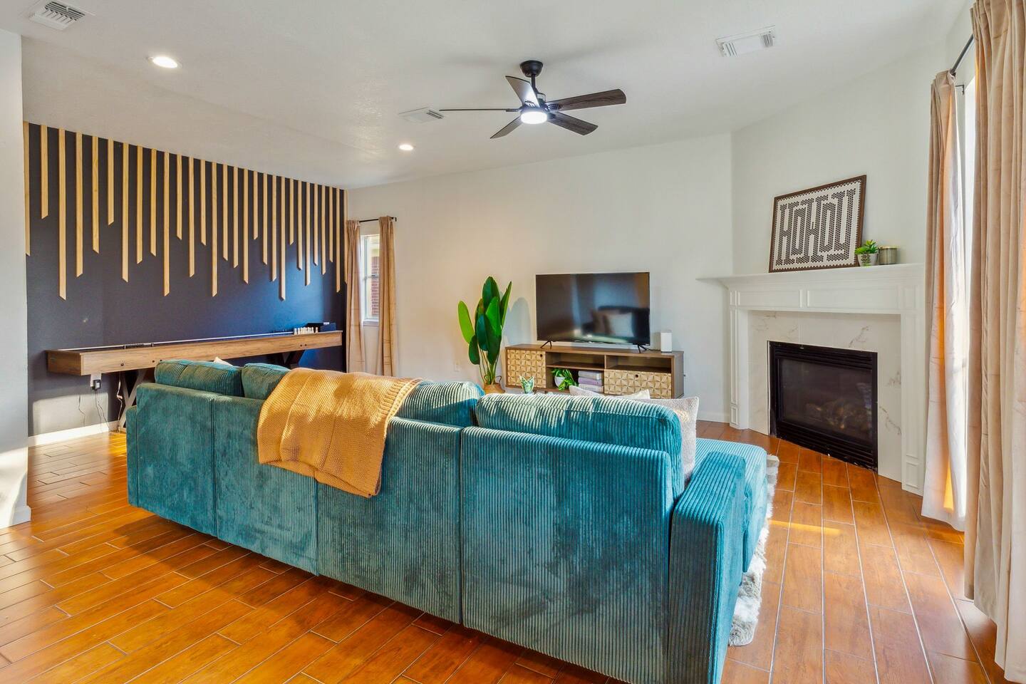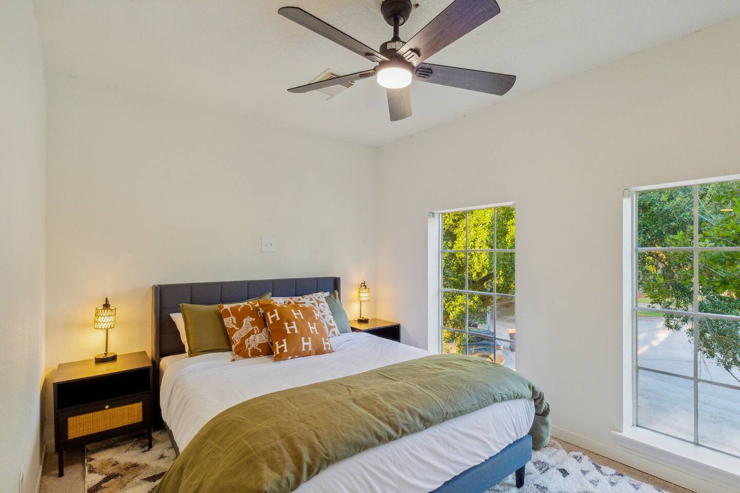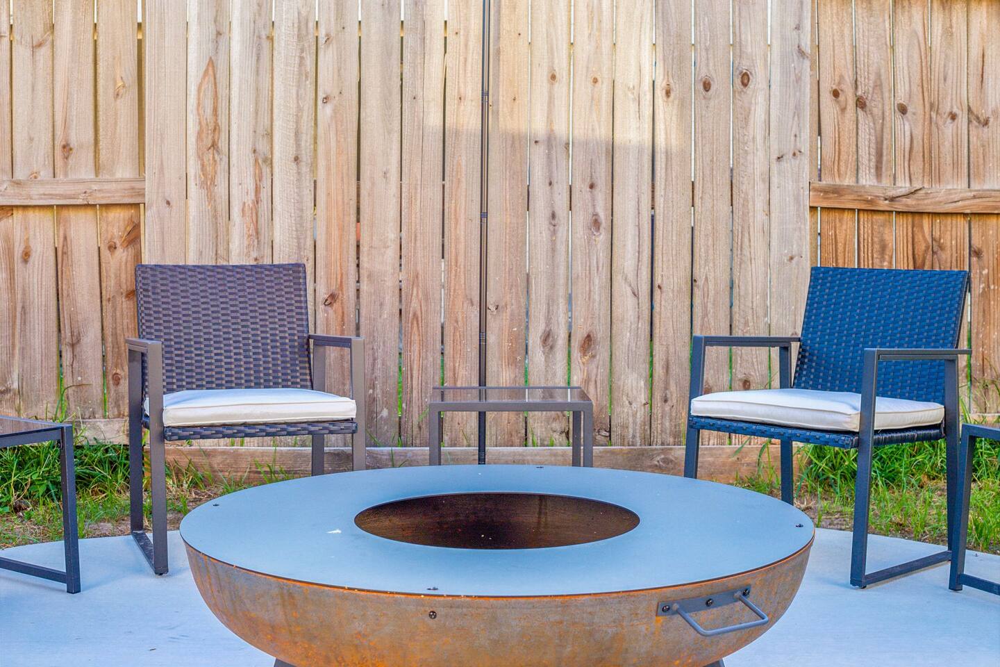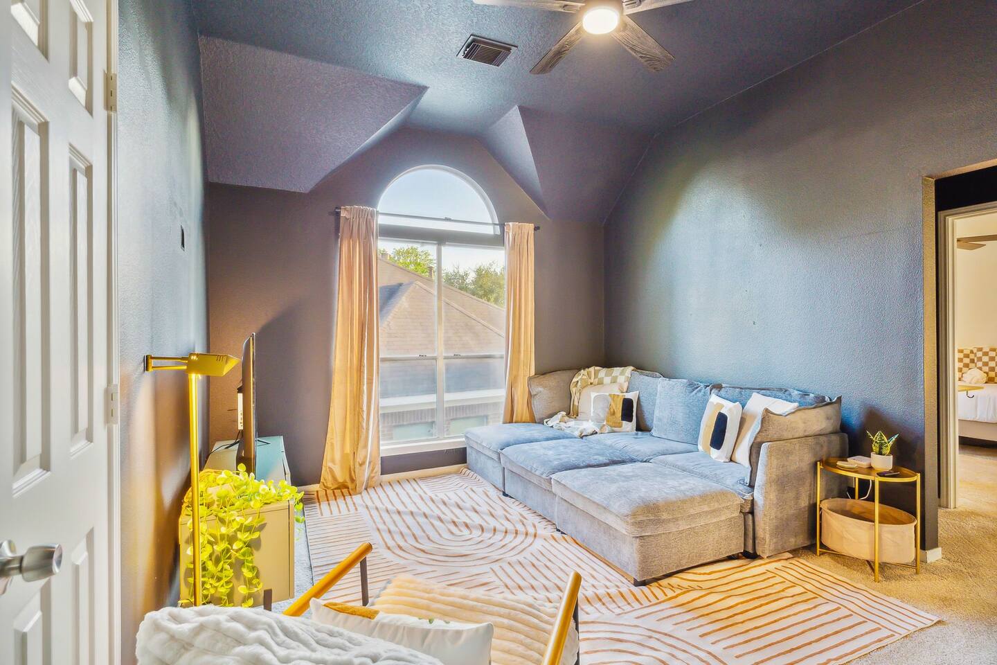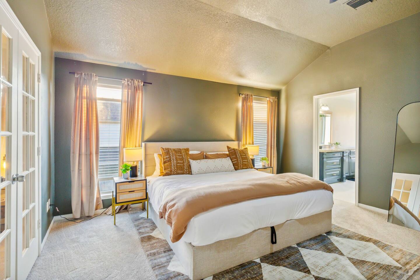 Welcome to the Vintage Texan rental, your perfect getaway in Cypress, TX! Located in a quiet cul-de-sac, this charming 5-bedroom, 3.5-bath home offers comfort, convenience, and all the amenities you need for a memorable short or mid-term stay. The house sits on an oversized lot at the bend of the road, providing a peaceful and spacious retreat for families, groups, or business travelers. Upon entering the neighborhood, you’ll immediately notice the serene atmosphere, ideal for a relaxing stay away from the hustle and bustle of the city. Parking is a breeze, with a two-car garage and a large driveway that can accommodate up to four cars. There's also ample street parking available. The front yard, adorned with a beautiful palm tree and well-lit landscaping, creates a warm and inviting welcome. Your arrival will be seamless, thanks to our Yale smart lock, pre-programmed with the last four digits of your phone number. This convenient feature ensures that accessing the home is effortless throughout your stay. As you step through the front door, you’re greeted by a cozy sitting area, perfect for luggage drop-off or a moment to relax. Here, you’ll also find a welcome gift and our house manual with all the information you need to make your stay as smooth as possible. The front sitting area leads into the open and airy dining room, which is spacious enough for large family meals or gatherings with friends. The dining area flows seamlessly into the beautifully updated kitchen, which is fully stocked with everything you’ll need for your stay. Whether you're preparing a gourmet meal, brewing a fresh cup of coffee in the morning, or stocking the fridge and pantry with snacks, the kitchen is designed to accommodate every culinary need. Stainless steel appliances and ample counter space make meal prep a breeze. Just around the corner, you'll find the main living room downstairs. This open-concept space features a cozy U-shaped sectional, a large TV, and a beautiful remote-controlled fireplace, perfect for relaxing after a long day. The shuffleboard table adds a fun element to the space, inviting friendly competition among guests. From the living room, you can easily access the backyard, making BBQ season that much easier. At the front of the house, the staircase takes you to the second floor, where the space splits into two wings. To the right, you'll find the game room, complete with a pool table ready for your next match. This side of the house also features a private bedroom with a queen bed and its own ensuite bathroom, complete with a walk-in shower—ideal for guests seeking extra privacy. On the left side of the second floor, you’ll discover a cozy upstairs living room, thoughtfully designed with kids in mind. It features a comfortable modular sleeper sofa, a TV, and a soft, washable rug. This room provides a perfect space for younger guests to relax and watch their favorite shows or movies. Off this living room is the primary bedroom, your own personal sanctuary during your stay. This luxurious room includes a king-size bed, a sitting chair, and a TV for unwinding with a good movie or show. The en-suite bathroom is equally impressive, featuring a large soaking tub, a walk-in shower with a rainhead, and a double vanity. You'll have plenty of storage space with a walk-in closet and dresser, ensuring you can unpack and feel right at home. The primary suite also includes a dual-purpose room just off the bedroom. This additional space is furnished with a full-size daybed and a sit/stand desk, perfect for anyone needing a quiet workspace. The 43-inch TV in this room can also double as a monitor if needed. On the opposite side of the upstairs living room, you’ll find two additional bedrooms and a third bathroom. One bedroom is equipped with a king-size bed, while the other features a queen-size bed. Both rooms include smart TVs and sit/stand desks, offering even more work-from-home options. The shared bathroom on this side has a full-size tub and shower combo, ensuring all guests have access to everything they need for a comfortable stay. Now, step outside into the backyard, where a brand-new concrete slab has been poured to create the ultimate outdoor oasis. The backyard is fully fenced, making it a safe and fun space for children and pets to roam freely. A string of lights surrounds the outdoor area, creating a cozy and inviting atmosphere for evenings under the stars. A large 7-person inflatable hot tub awaits you, perfect for relaxing after a long day of exploring or working. Gather around the fire pit, which seats six comfortably, and enjoy a night of conversation and s’mores with family or friends. In addition to the hot tub and fire pit, the backyard includes a BBQ area complete with a charcoal grill and smoker for all your outdoor cooking needs. The outdoor dining space provides plenty of seating for meals al fresco, making this area ideal for BBQ season. Our location is a highlight of the Vintage Texan. We're just 20-30 minutes from downtown Houston and only 10 minutes from the Cypress Boardwalk, offering quick access to dining, shopping, and entertainment. This home is also conveniently located near highly rated schools, top-tier medical facilities, and a variety of shopping options, making it the perfect place for families and professionals alike. We’ve designed every aspect of this home with comfort, convenience, and enjoyment in mind. Whether you’re here for work, play, or a little of both, our Vintage Texan rental is the perfect place to relax, unwind, and create lasting memories. We hope you enjoy your stay, and if you have any questions during your visit, please don't hesitate to reach out!