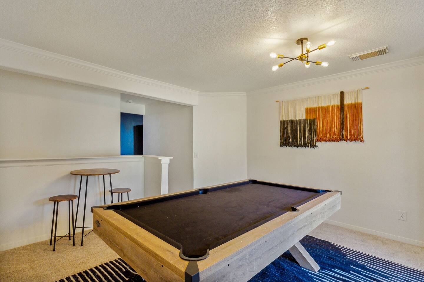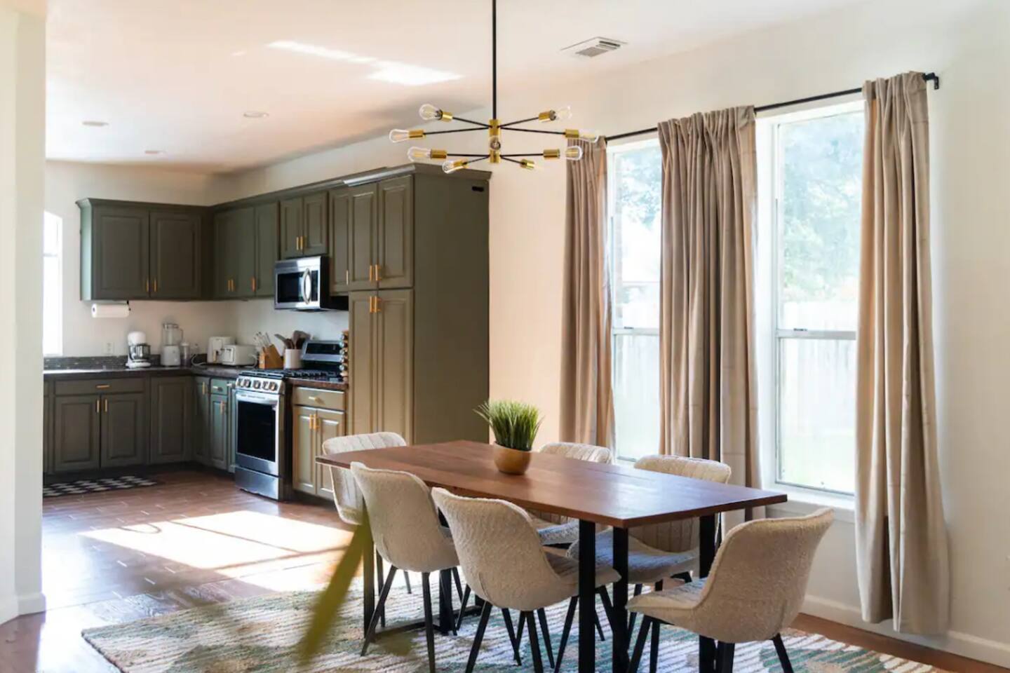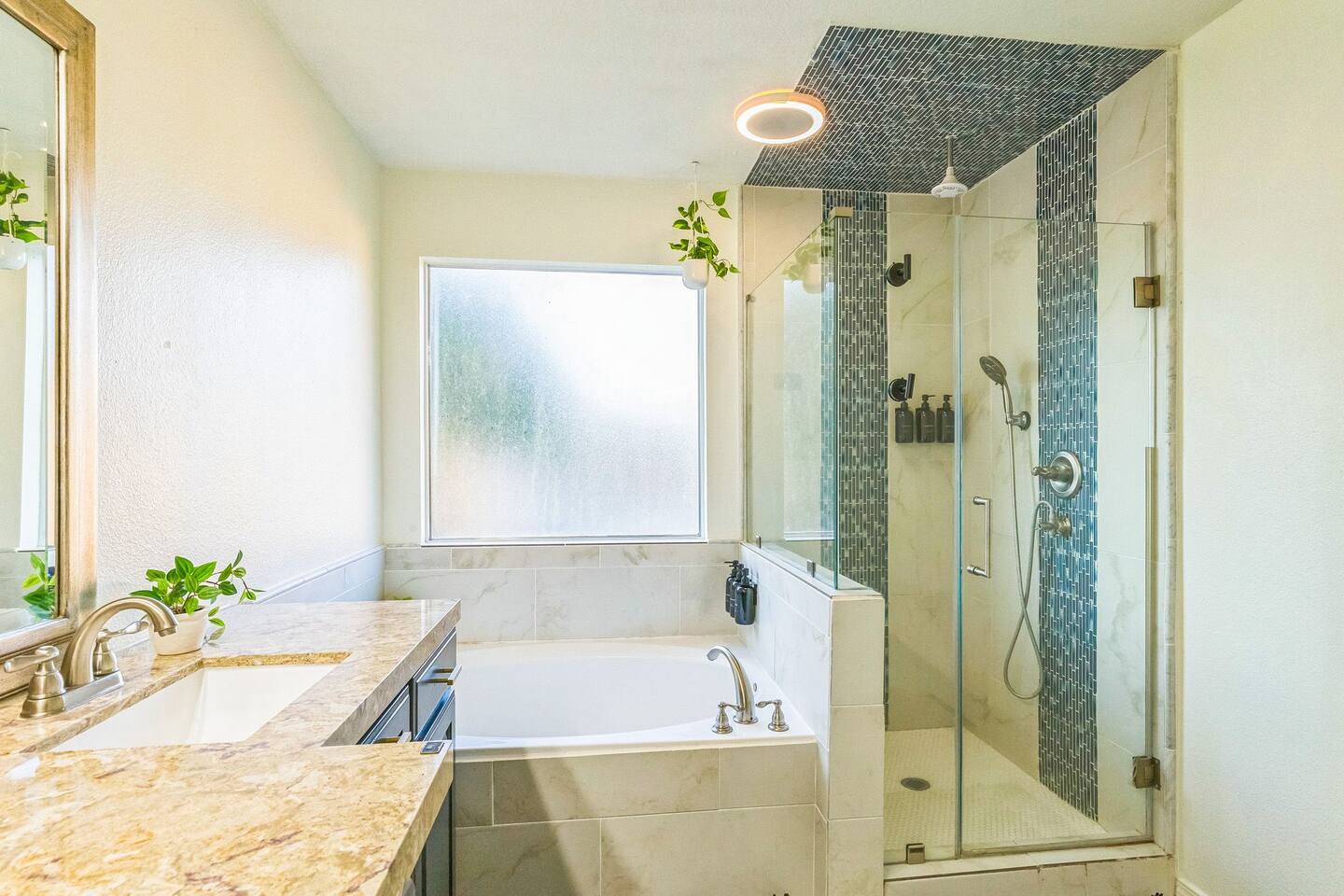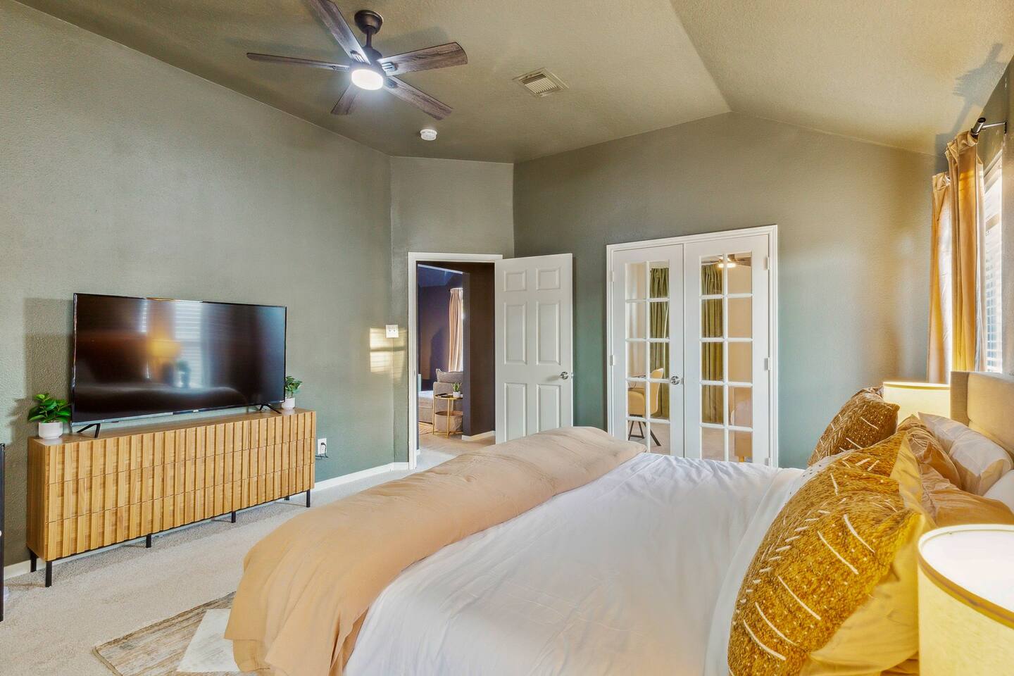 Welcome to the Vintage Texan rental, your perfect getaway in Cypress, TX! Located in a quiet cul-de-sac, this charming 5-bedroom, 3.5-bath home offers comfort, convenience, and all the amenities you need for a memorable short or mid-term stay. The house sits on an oversized lot at the bend of the road, providing a peaceful and spacious retreat for families, groups, or business travelers. Upon entering the neighborhood, you’ll immediately notice the serene atmosphere, ideal for a relaxing stay away from the hustle and bustle of the city. Parking is a breeze, with a two-car garage and a large driveway that can accommodate up to four cars. There's also ample street parking available. The front yard, adorned with a beautiful palm tree and well-lit landscaping, creates a warm and inviting welcome. Your arrival will be seamless, thanks to our Yale smart lock, pre-programmed with the last four digits of your phone number. This convenient feature ensures that accessing the home is effortless throughout your stay. As you step through the front door, you’re greeted by a cozy sitting area, perfect for luggage drop-off or a moment to relax. Here, you’ll also find a welcome gift and our house manual with all the information you need to make your stay as smooth as possible. The front sitting area leads into the open and airy dining room, which is spacious enough for large family meals or gatherings with friends. The dining area flows seamlessly into the beautifully updated kitchen, which is fully stocked with everything you’ll need for your stay. Whether you're preparing a gourmet meal, brewing a fresh cup of coffee in the morning, or stocking the fridge and pantry with snacks, the kitchen is designed to accommodate every culinary need. Stainless steel appliances and ample counter space make meal prep a breeze. Just around the corner, you'll find the main living room downstairs. This open-concept space features a cozy U-shaped sectional, a large TV, and a beautiful remote-controlled fireplace, perfect for relaxing after a long day. The shuffleboard table adds a fun element to the space, inviting friendly competition among guests. From the living room, you can easily access the backyard, making BBQ season that much easier. At the front of the house, the staircase takes you to the second floor, where the space splits into two wings. To the right, you'll find the game room, complete with a pool table ready for your next match. This side of the house also features a private bedroom with a queen bed and its own ensuite bathroom, complete with a walk-in shower—ideal for guests seeking extra privacy. On the left side of the second floor, you’ll discover a cozy upstairs living room, thoughtfully designed with kids in mind. It features a comfortable modular sleeper sofa, a TV, and a soft, washable rug. This room provides a perfect space for younger guests to relax and watch their favorite shows or movies. Off this living room is the primary bedroom, your own personal sanctuary during your stay. This luxurious room includes a king-size bed, a sitting chair, and a TV for unwinding with a good movie or show. The en-suite bathroom is equally impressive, featuring a large soaking tub, a walk-in shower with a rainhead, and a double vanity. You'll have plenty of storage space with a walk-in closet and dresser, ensuring you can unpack and feel right at home. The primary suite also includes a dual-purpose room just off the bedroom. This additional space is furnished with a full-size daybed and a sit/stand desk, perfect for anyone needing a quiet workspace. The 43-inch TV in this room can also double as a monitor if needed. On the opposite side of the upstairs living room, you’ll find two additional bedrooms and a third bathroom. One bedroom is equipped with a king-size bed, while the other features a queen-size bed. Both rooms include smart TVs and sit/stand desks, offering even more work-from-home options. The shared bathroom on this side has a full-size tub and shower combo, ensuring all guests have access to everything they need for a comfortable stay. Now, step outside into the backyard, where a brand-new concrete slab has been poured to create the ultimate outdoor oasis. The backyard is fully fenced, making it a safe and fun space for children and pets to roam freely. A string of lights surrounds the outdoor area, creating a cozy and inviting atmosphere for evenings under the stars. A large 7-person inflatable hot tub awaits you, perfect for relaxing after a long day of exploring or working. Gather around the fire pit, which seats six comfortably, and enjoy a night of conversation and s’mores with family or friends. In addition to the hot tub and fire pit, the backyard includes a BBQ area complete with a charcoal grill and smoker for all your outdoor cooking needs. The outdoor dining space provides plenty of seating for meals al fresco, making this area ideal for BBQ season. Our location is a highlight of the Vintage Texan. We're just 20-30 minutes from downtown Houston and only 10 minutes from the Cypress Boardwalk, offering quick access to dining, shopping, and entertainment. This home is also conveniently located near highly rated schools, top-tier medical facilities, and a variety of shopping options, making it the perfect place for families and professionals alike. We’ve designed every aspect of this home with comfort, convenience, and enjoyment in mind. Whether you’re here for work, play, or a little of both, our Vintage Texan rental is the perfect place to relax, unwind, and create lasting memories. We hope you enjoy your stay, and if you have any questions during your visit, please don't hesitate to reach out!