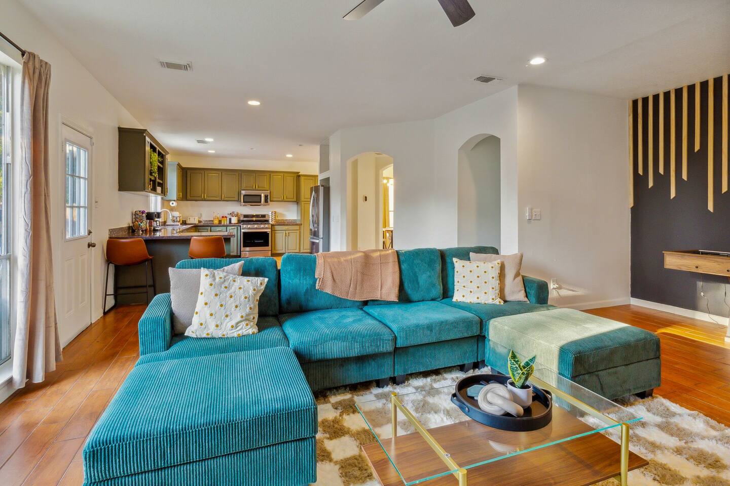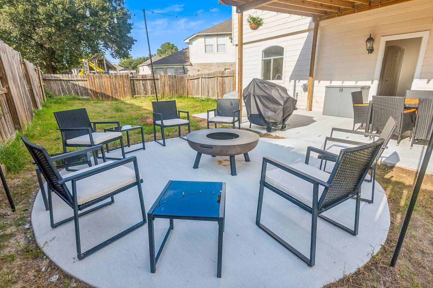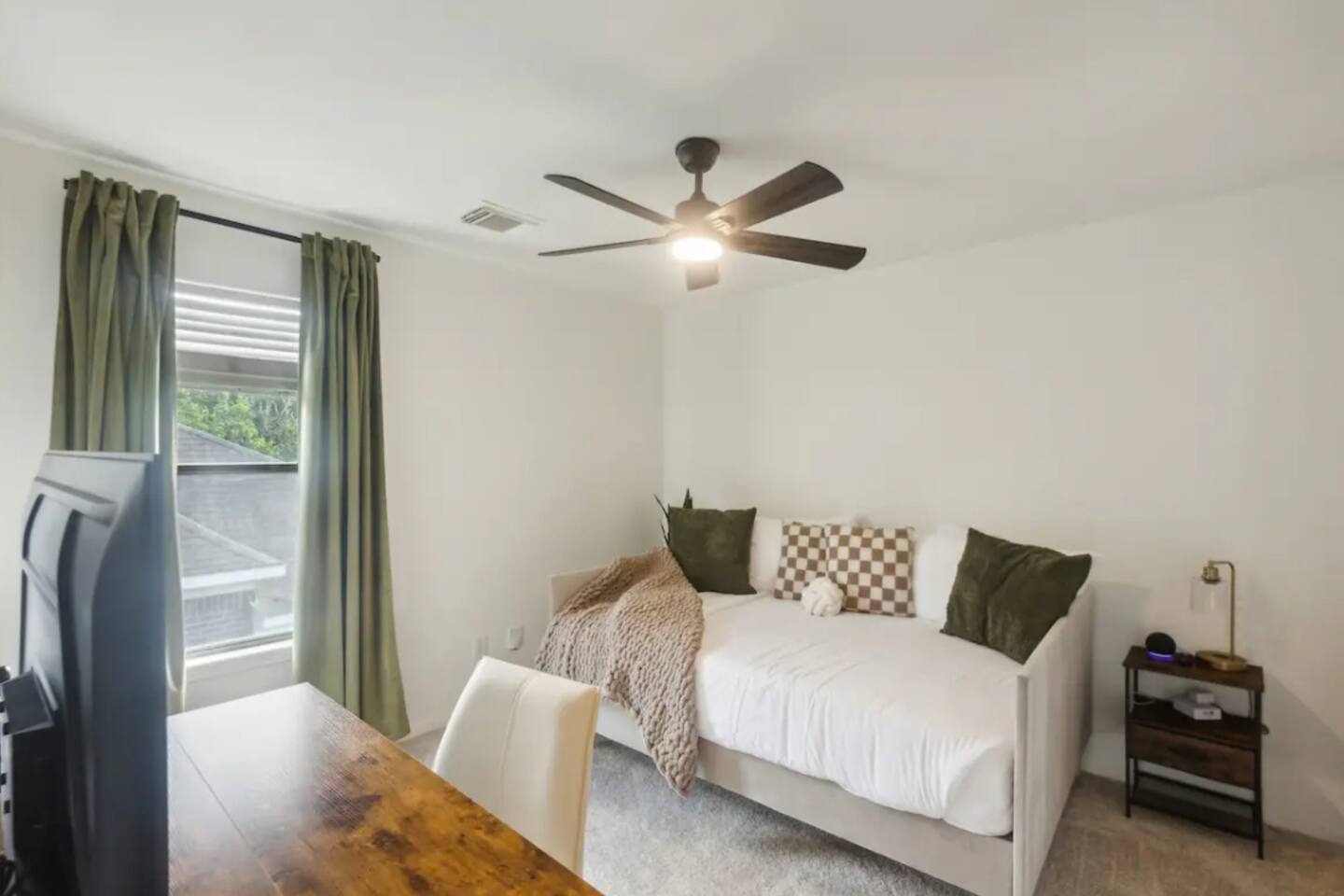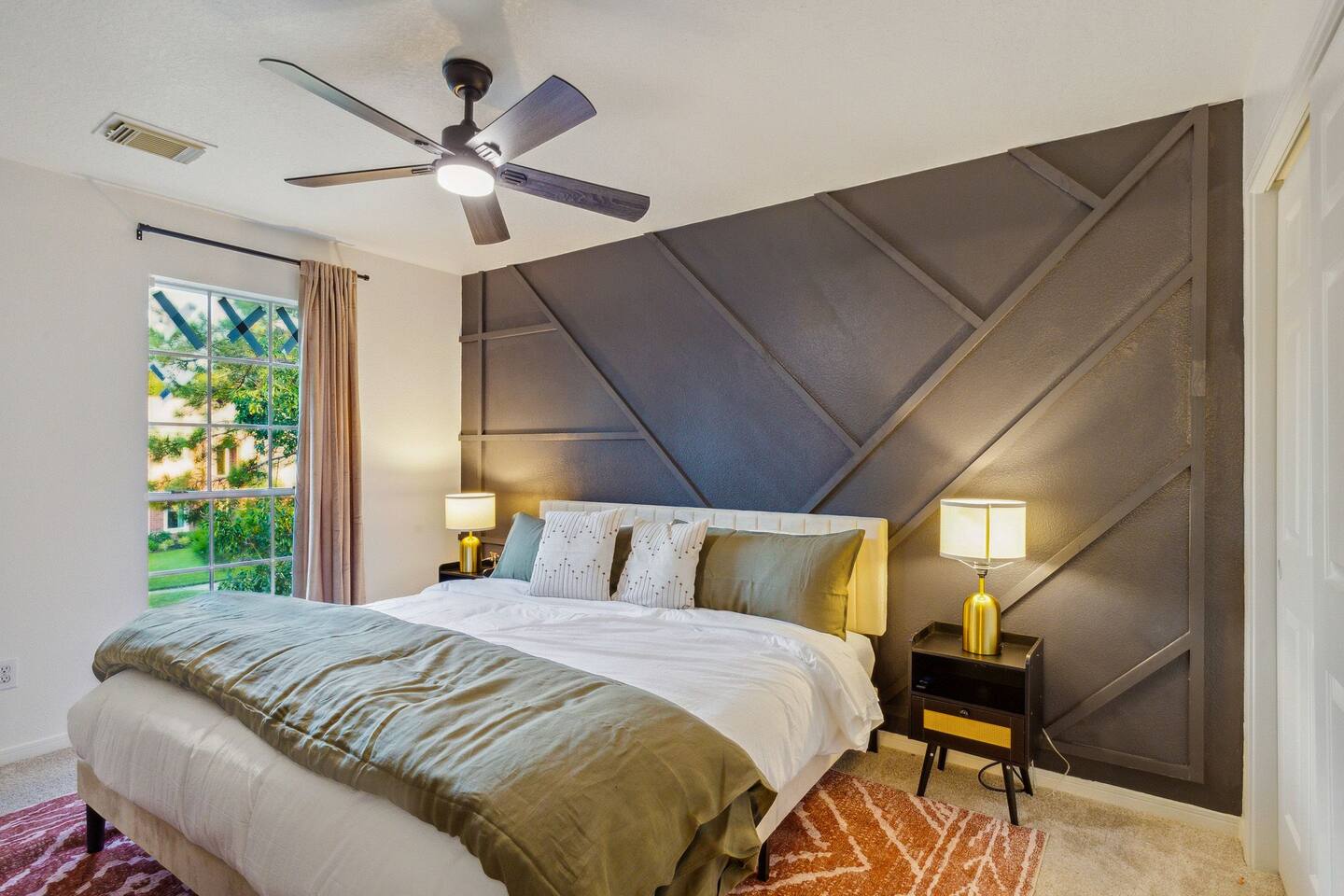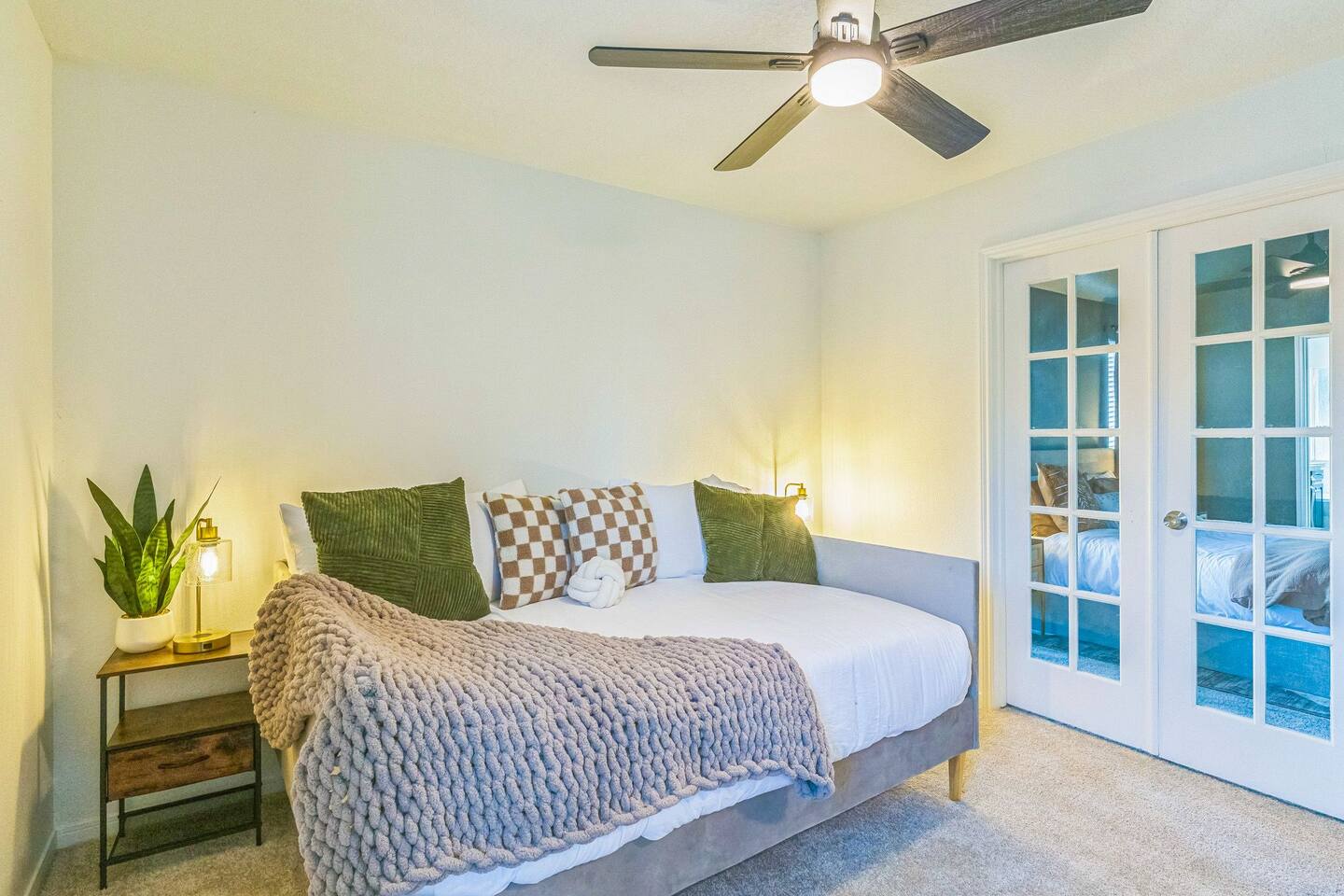 Welcome to the Vintage Texan rental, your perfect getaway in Cypress, TX! Located in a quiet cul-de-sac, this charming 5-bedroom, 3.5-bath home offers comfort, convenience, and all the amenities you need for a memorable short or mid-term stay. The house sits on an oversized lot at the bend of the road, providing a peaceful and spacious retreat for families, groups, or business travelers. Upon entering the neighborhood, you’ll immediately notice the serene atmosphere, ideal for a relaxing stay away from the hustle and bustle of the city. Parking is a breeze, with a two-car garage and a large driveway that can accommodate up to four cars. There's also ample street parking available. The front yard, adorned with a beautiful palm tree and well-lit landscaping, creates a warm and inviting welcome. Your arrival will be seamless, thanks to our Yale smart lock, pre-programmed with the last four digits of your phone number. This convenient feature ensures that accessing the home is effortless throughout your stay. As you step through the front door, you’re greeted by a cozy sitting area, perfect for luggage drop-off or a moment to relax. Here, you’ll also find a welcome gift and our house manual with all the information you need to make your stay as smooth as possible. The front sitting area leads into the open and airy dining room, which is spacious enough for large family meals or gatherings with friends. The dining area flows seamlessly into the beautifully updated kitchen, which is fully stocked with everything you’ll need for your stay. Whether you're preparing a gourmet meal, brewing a fresh cup of coffee in the morning, or stocking the fridge and pantry with snacks, the kitchen is designed to accommodate every culinary need. Stainless steel appliances and ample counter space make meal prep a breeze. Just around the corner, you'll find the main living room downstairs. This open-concept space features a cozy U-shaped sectional, a large TV, and a beautiful remote-controlled fireplace, perfect for relaxing after a long day. The shuffleboard table adds a fun element to the space, inviting friendly competition among guests. From the living room, you can easily access the backyard, making BBQ season that much easier. At the front of the house, the staircase takes you to the second floor, where the space splits into two wings. To the right, you'll find the game room, complete with a pool table ready for your next match. This side of the house also features a private bedroom with a queen bed and its own ensuite bathroom, complete with a walk-in shower—ideal for guests seeking extra privacy. On the left side of the second floor, you’ll discover a cozy upstairs living room, thoughtfully designed with kids in mind. It features a comfortable modular sleeper sofa, a TV, and a soft, washable rug. This room provides a perfect space for younger guests to relax and watch their favorite shows or movies. Off this living room is the primary bedroom, your own personal sanctuary during your stay. This luxurious room includes a king-size bed, a sitting chair, and a TV for unwinding with a good movie or show. The en-suite bathroom is equally impressive, featuring a large soaking tub, a walk-in shower with a rainhead, and a double vanity. You'll have plenty of storage space with a walk-in closet and dresser, ensuring you can unpack and feel right at home. The primary suite also includes a dual-purpose room just off the bedroom. This additional space is furnished with a full-size daybed and a sit/stand desk, perfect for anyone needing a quiet workspace. The 43-inch TV in this room can also double as a monitor if needed. On the opposite side of the upstairs living room, you’ll find two additional bedrooms and a third bathroom. One bedroom is equipped with a king-size bed, while the other features a queen-size bed. Both rooms include smart TVs and sit/stand desks, offering even more work-from-home options. The shared bathroom on this side has a full-size tub and shower combo, ensuring all guests have access to everything they need for a comfortable stay. Now, step outside into the backyard, where a brand-new concrete slab has been poured to create the ultimate outdoor oasis. The backyard is fully fenced, making it a safe and fun space for children and pets to roam freely. A string of lights surrounds the outdoor area, creating a cozy and inviting atmosphere for evenings under the stars. A large 7-person inflatable hot tub awaits you, perfect for relaxing after a long day of exploring or working. Gather around the fire pit, which seats six comfortably, and enjoy a night of conversation and s’mores with family or friends. In addition to the hot tub and fire pit, the backyard includes a BBQ area complete with a charcoal grill and smoker for all your outdoor cooking needs. The outdoor dining space provides plenty of seating for meals al fresco, making this area ideal for BBQ season. Our location is a highlight of the Vintage Texan. We're just 20-30 minutes from downtown Houston and only 10 minutes from the Cypress Boardwalk, offering quick access to dining, shopping, and entertainment. This home is also conveniently located near highly rated schools, top-tier medical facilities, and a variety of shopping options, making it the perfect place for families and professionals alike. We’ve designed every aspect of this home with comfort, convenience, and enjoyment in mind. Whether you’re here for work, play, or a little of both, our Vintage Texan rental is the perfect place to relax, unwind, and create lasting memories. We hope you enjoy your stay, and if you have any questions during your visit, please don't hesitate to reach out!