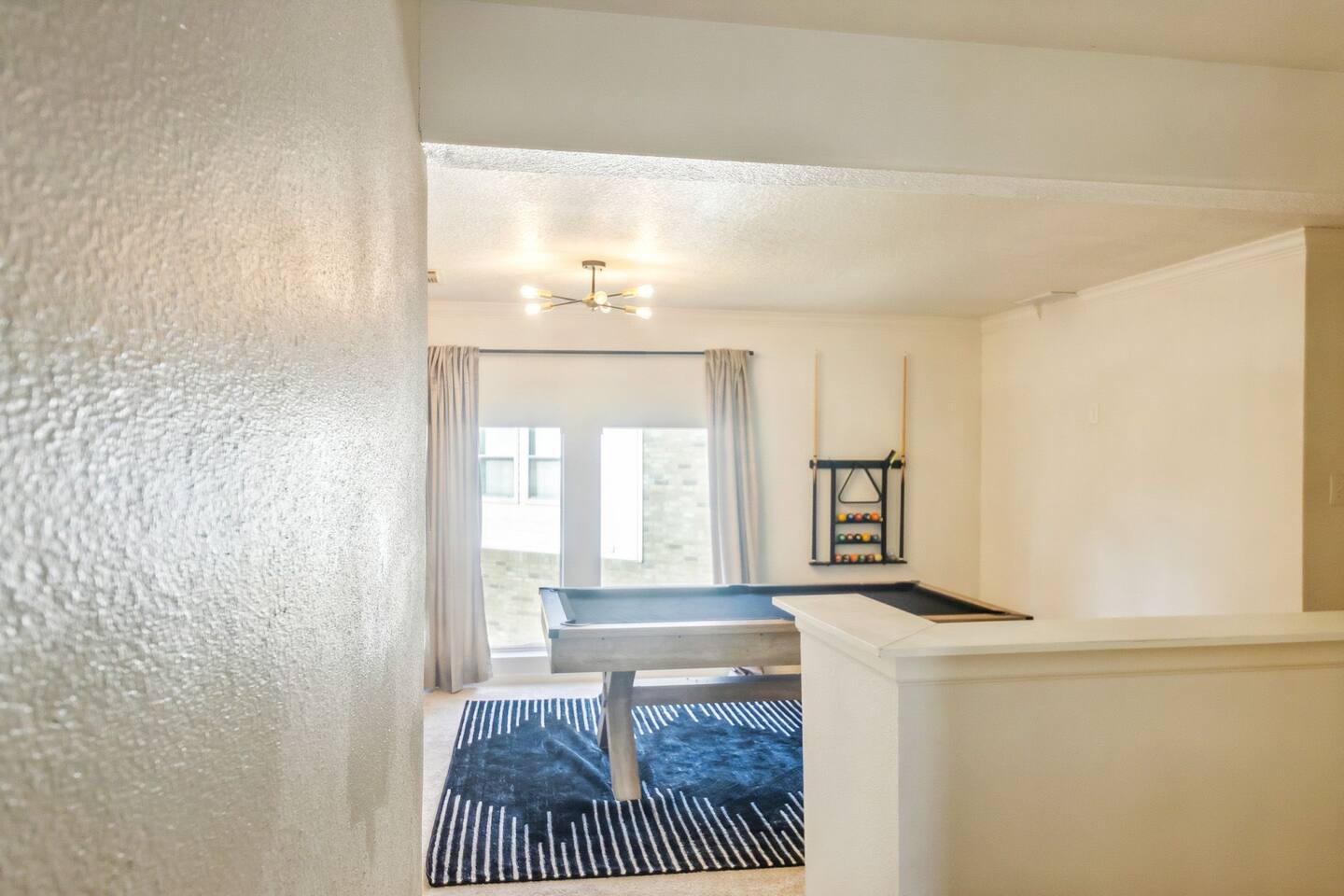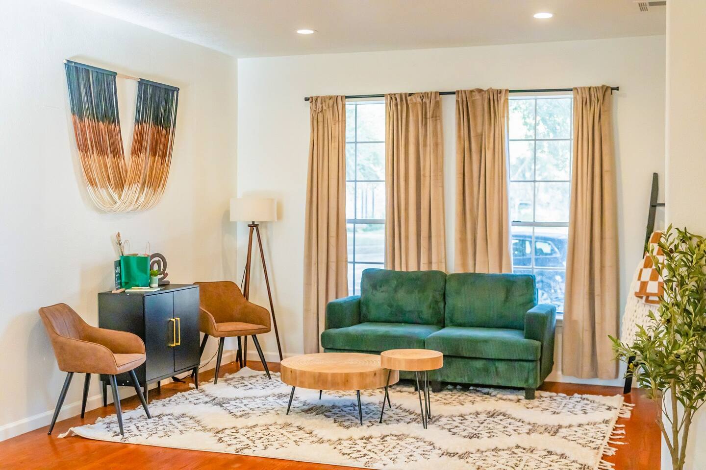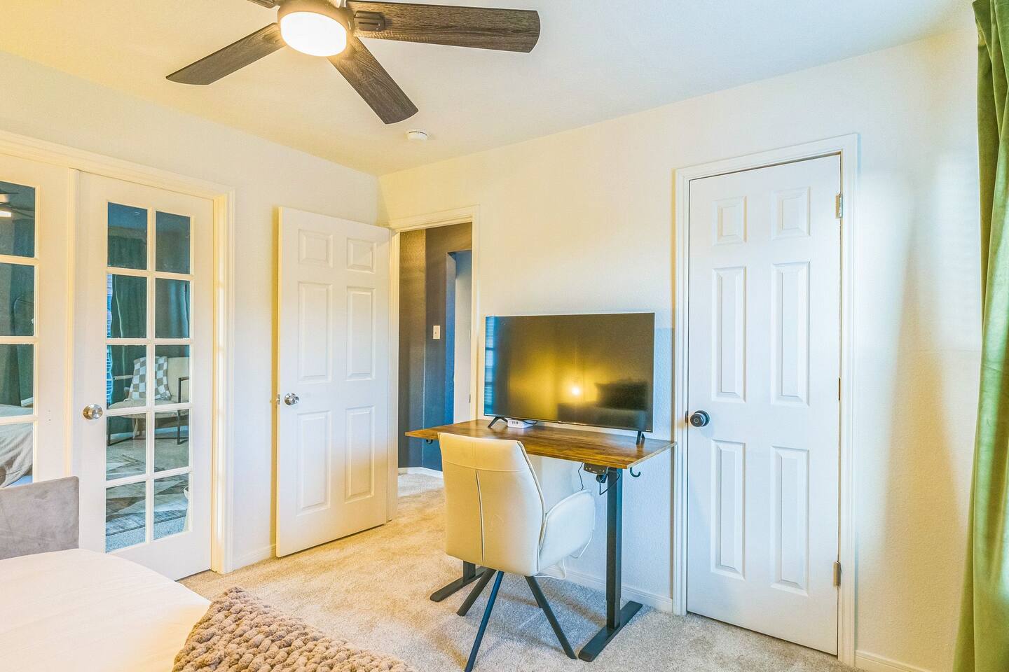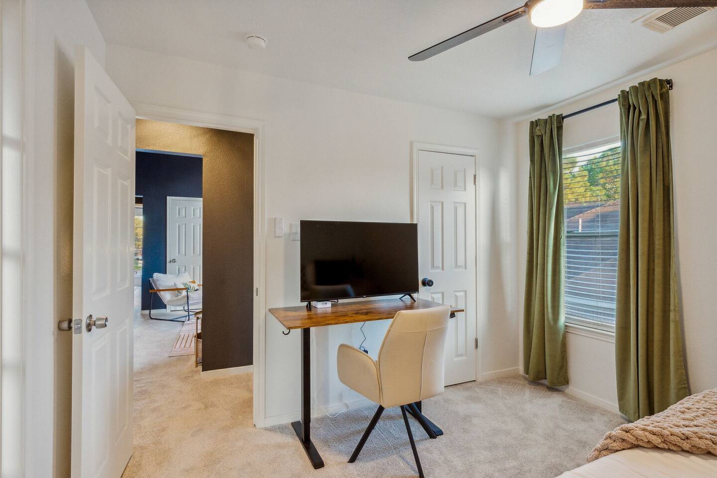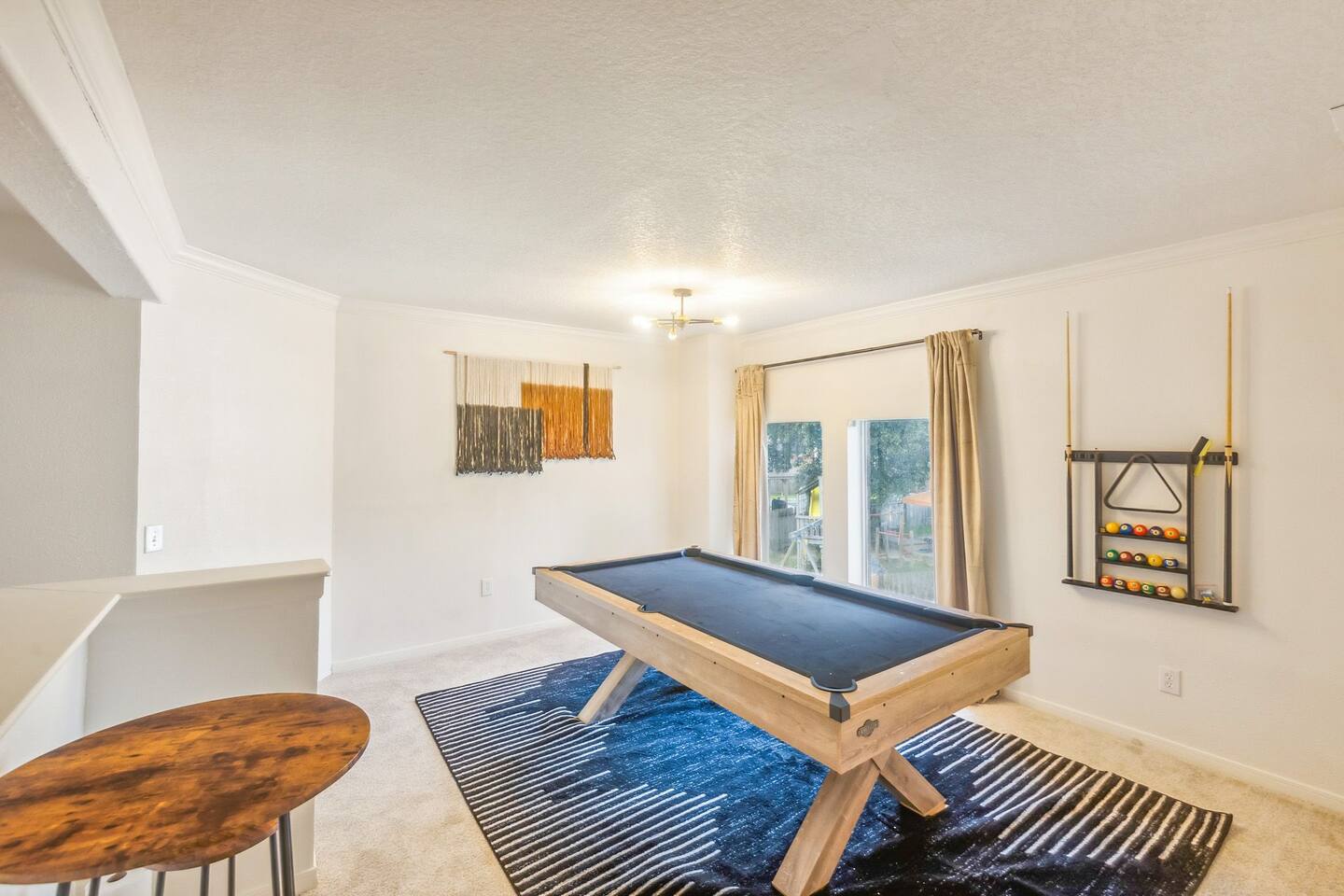 Welcome to the Vintage Texan rental, your perfect getaway in Cypress, TX! Located in a quiet cul-de-sac, this charming 5-bedroom, 3.5-bath home offers comfort, convenience, and all the amenities you need for a memorable short or mid-term stay. The house sits on an oversized lot at the bend of the road, providing a peaceful and spacious retreat for families, groups, or business travelers. Upon entering the neighborhood, you’ll immediately notice the serene atmosphere, ideal for a relaxing stay away from the hustle and bustle of the city. Parking is a breeze, with a two-car garage and a large driveway that can accommodate up to four cars. There's also ample street parking available. The front yard, adorned with a beautiful palm tree and well-lit landscaping, creates a warm and inviting welcome. Your arrival will be seamless, thanks to our Yale smart lock, pre-programmed with the last four digits of your phone number. This convenient feature ensures that accessing the home is effortless throughout your stay. As you step through the front door, you’re greeted by a cozy sitting area, perfect for luggage drop-off or a moment to relax. Here, you’ll also find a welcome gift and our house manual with all the information you need to make your stay as smooth as possible. The front sitting area leads into the open and airy dining room, which is spacious enough for large family meals or gatherings with friends. The dining area flows seamlessly into the beautifully updated kitchen, which is fully stocked with everything you’ll need for your stay. Whether you're preparing a gourmet meal, brewing a fresh cup of coffee in the morning, or stocking the fridge and pantry with snacks, the kitchen is designed to accommodate every culinary need. Stainless steel appliances and ample counter space make meal prep a breeze. Just around the corner, you'll find the main living room downstairs. This open-concept space features a cozy U-shaped sectional, a large TV, and a beautiful remote-controlled fireplace, perfect for relaxing after a long day. The shuffleboard table adds a fun element to the space, inviting friendly competition among guests. From the living room, you can easily access the backyard, making BBQ season that much easier. At the front of the house, the staircase takes you to the second floor, where the space splits into two wings. To the right, you'll find the game room, complete with a pool table ready for your next match. This side of the house also features a private bedroom with a queen bed and its own ensuite bathroom, complete with a walk-in shower—ideal for guests seeking extra privacy. On the left side of the second floor, you’ll discover a cozy upstairs living room, thoughtfully designed with kids in mind. It features a comfortable modular sleeper sofa, a TV, and a soft, washable rug. This room provides a perfect space for younger guests to relax and watch their favorite shows or movies. Off this living room is the primary bedroom, your own personal sanctuary during your stay. This luxurious room includes a king-size bed, a sitting chair, and a TV for unwinding with a good movie or show. The en-suite bathroom is equally impressive, featuring a large soaking tub, a walk-in shower with a rainhead, and a double vanity. You'll have plenty of storage space with a walk-in closet and dresser, ensuring you can unpack and feel right at home. The primary suite also includes a dual-purpose room just off the bedroom. This additional space is furnished with a full-size daybed and a sit/stand desk, perfect for anyone needing a quiet workspace. The 43-inch TV in this room can also double as a monitor if needed. On the opposite side of the upstairs living room, you’ll find two additional bedrooms and a third bathroom. One bedroom is equipped with a king-size bed, while the other features a queen-size bed. Both rooms include smart TVs and sit/stand desks, offering even more work-from-home options. The shared bathroom on this side has a full-size tub and shower combo, ensuring all guests have access to everything they need for a comfortable stay. Now, step outside into the backyard, where a brand-new concrete slab has been poured to create the ultimate outdoor oasis. The backyard is fully fenced, making it a safe and fun space for children and pets to roam freely. A string of lights surrounds the outdoor area, creating a cozy and inviting atmosphere for evenings under the stars. A large 7-person inflatable hot tub awaits you, perfect for relaxing after a long day of exploring or working. Gather around the fire pit, which seats six comfortably, and enjoy a night of conversation and s’mores with family or friends. In addition to the hot tub and fire pit, the backyard includes a BBQ area complete with a charcoal grill and smoker for all your outdoor cooking needs. The outdoor dining space provides plenty of seating for meals al fresco, making this area ideal for BBQ season. Our location is a highlight of the Vintage Texan. We're just 20-30 minutes from downtown Houston and only 10 minutes from the Cypress Boardwalk, offering quick access to dining, shopping, and entertainment. This home is also conveniently located near highly rated schools, top-tier medical facilities, and a variety of shopping options, making it the perfect place for families and professionals alike. We’ve designed every aspect of this home with comfort, convenience, and enjoyment in mind. Whether you’re here for work, play, or a little of both, our Vintage Texan rental is the perfect place to relax, unwind, and create lasting memories. We hope you enjoy your stay, and if you have any questions during your visit, please don't hesitate to reach out!