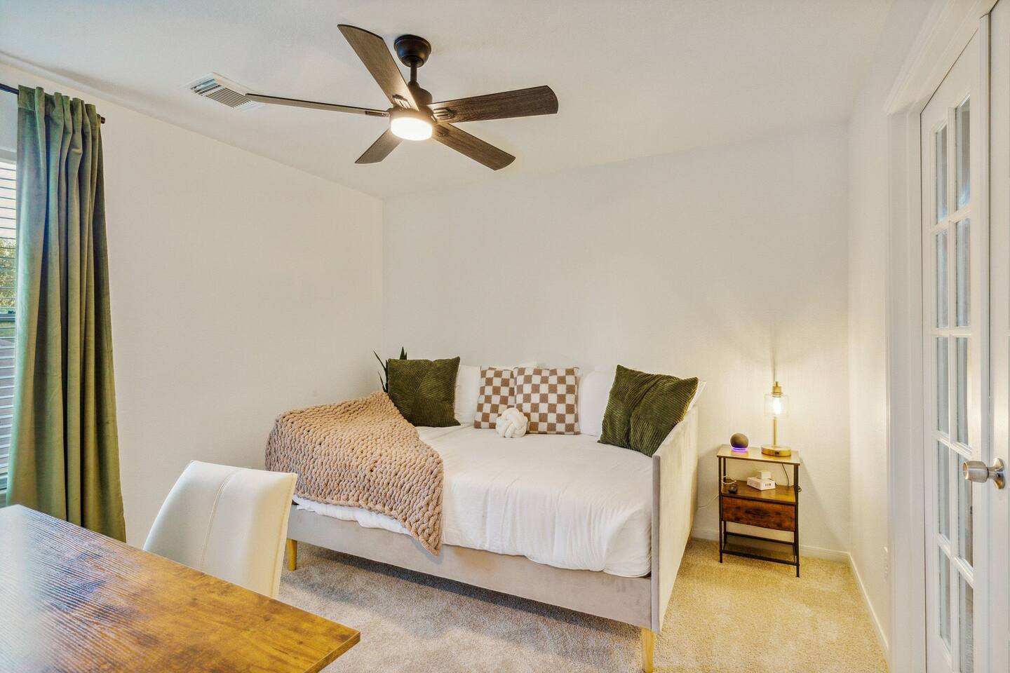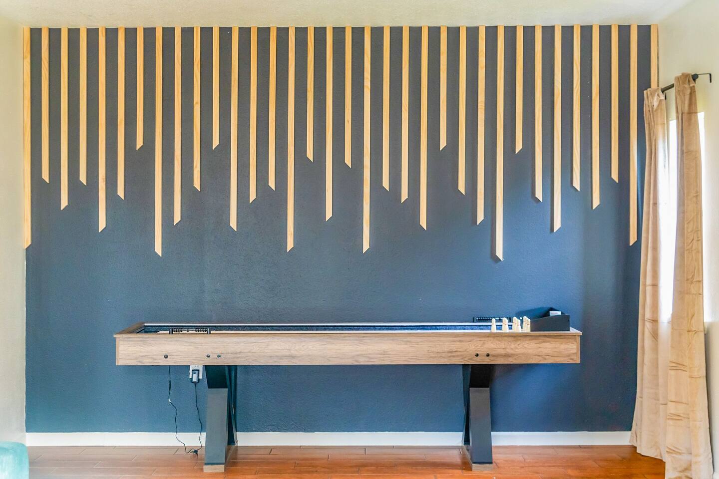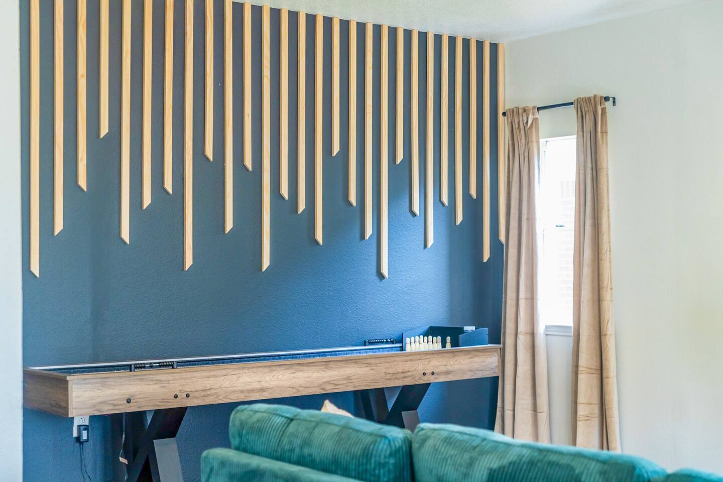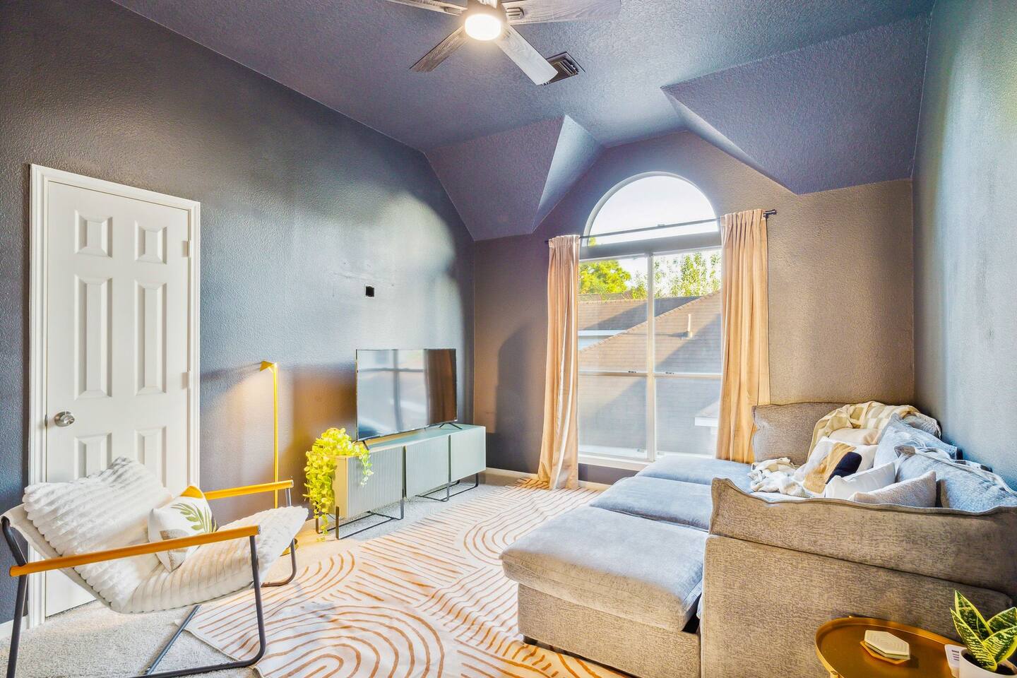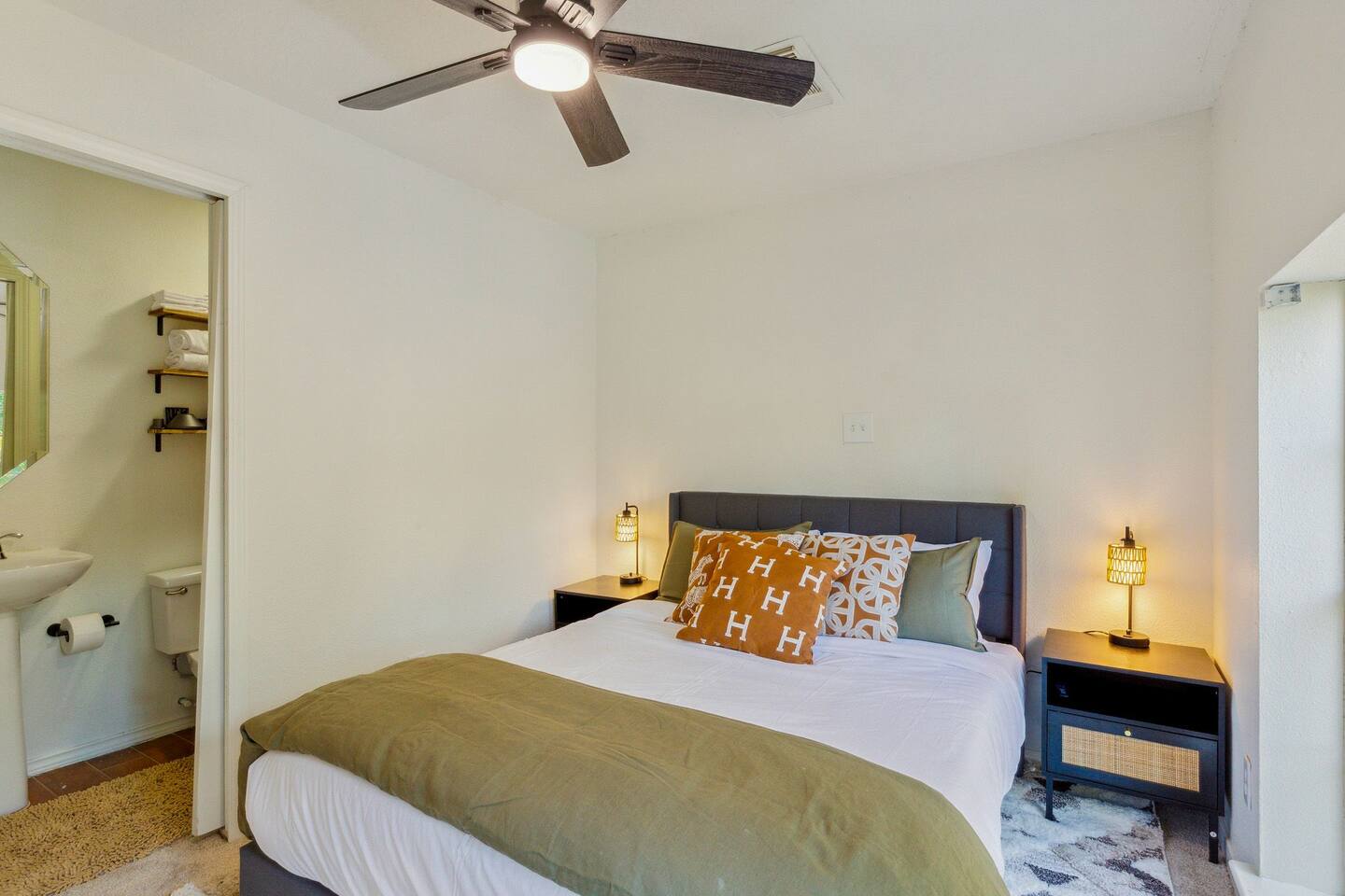 Welcome to the Vintage Texan rental, your perfect getaway in Cypress, TX! Located in a quiet cul-de-sac, this charming 5-bedroom, 3.5-bath home offers comfort, convenience, and all the amenities you need for a memorable short or mid-term stay. The house sits on an oversized lot at the bend of the road, providing a peaceful and spacious retreat for families, groups, or business travelers. Upon entering the neighborhood, you’ll immediately notice the serene atmosphere, ideal for a relaxing stay away from the hustle and bustle of the city. Parking is a breeze, with a two-car garage and a large driveway that can accommodate up to four cars. There's also ample street parking available. The front yard, adorned with a beautiful palm tree and well-lit landscaping, creates a warm and inviting welcome. Your arrival will be seamless, thanks to our Yale smart lock, pre-programmed with the last four digits of your phone number. This convenient feature ensures that accessing the home is effortless throughout your stay. As you step through the front door, you’re greeted by a cozy sitting area, perfect for luggage drop-off or a moment to relax. Here, you’ll also find a welcome gift and our house manual with all the information you need to make your stay as smooth as possible. The front sitting area leads into the open and airy dining room, which is spacious enough for large family meals or gatherings with friends. The dining area flows seamlessly into the beautifully updated kitchen, which is fully stocked with everything you’ll need for your stay. Whether you're preparing a gourmet meal, brewing a fresh cup of coffee in the morning, or stocking the fridge and pantry with snacks, the kitchen is designed to accommodate every culinary need. Stainless steel appliances and ample counter space make meal prep a breeze. Just around the corner, you'll find the main living room downstairs. This open-concept space features a cozy U-shaped sectional, a large TV, and a beautiful remote-controlled fireplace, perfect for relaxing after a long day. The shuffleboard table adds a fun element to the space, inviting friendly competition among guests. From the living room, you can easily access the backyard, making BBQ season that much easier. At the front of the house, the staircase takes you to the second floor, where the space splits into two wings. To the right, you'll find the game room, complete with a pool table ready for your next match. This side of the house also features a private bedroom with a queen bed and its own ensuite bathroom, complete with a walk-in shower—ideal for guests seeking extra privacy. On the left side of the second floor, you’ll discover a cozy upstairs living room, thoughtfully designed with kids in mind. It features a comfortable modular sleeper sofa, a TV, and a soft, washable rug. This room provides a perfect space for younger guests to relax and watch their favorite shows or movies. Off this living room is the primary bedroom, your own personal sanctuary during your stay. This luxurious room includes a king-size bed, a sitting chair, and a TV for unwinding with a good movie or show. The en-suite bathroom is equally impressive, featuring a large soaking tub, a walk-in shower with a rainhead, and a double vanity. You'll have plenty of storage space with a walk-in closet and dresser, ensuring you can unpack and feel right at home. The primary suite also includes a dual-purpose room just off the bedroom. This additional space is furnished with a full-size daybed and a sit/stand desk, perfect for anyone needing a quiet workspace. The 43-inch TV in this room can also double as a monitor if needed. On the opposite side of the upstairs living room, you’ll find two additional bedrooms and a third bathroom. One bedroom is equipped with a king-size bed, while the other features a queen-size bed. Both rooms include smart TVs and sit/stand desks, offering even more work-from-home options. The shared bathroom on this side has a full-size tub and shower combo, ensuring all guests have access to everything they need for a comfortable stay. Now, step outside into the backyard, where a brand-new concrete slab has been poured to create the ultimate outdoor oasis. The backyard is fully fenced, making it a safe and fun space for children and pets to roam freely. A string of lights surrounds the outdoor area, creating a cozy and inviting atmosphere for evenings under the stars. A large 7-person inflatable hot tub awaits you, perfect for relaxing after a long day of exploring or working. Gather around the fire pit, which seats six comfortably, and enjoy a night of conversation and s’mores with family or friends. In addition to the hot tub and fire pit, the backyard includes a BBQ area complete with a charcoal grill and smoker for all your outdoor cooking needs. The outdoor dining space provides plenty of seating for meals al fresco, making this area ideal for BBQ season. Our location is a highlight of the Vintage Texan. We're just 20-30 minutes from downtown Houston and only 10 minutes from the Cypress Boardwalk, offering quick access to dining, shopping, and entertainment. This home is also conveniently located near highly rated schools, top-tier medical facilities, and a variety of shopping options, making it the perfect place for families and professionals alike. We’ve designed every aspect of this home with comfort, convenience, and enjoyment in mind. Whether you’re here for work, play, or a little of both, our Vintage Texan rental is the perfect place to relax, unwind, and create lasting memories. We hope you enjoy your stay, and if you have any questions during your visit, please don't hesitate to reach out!