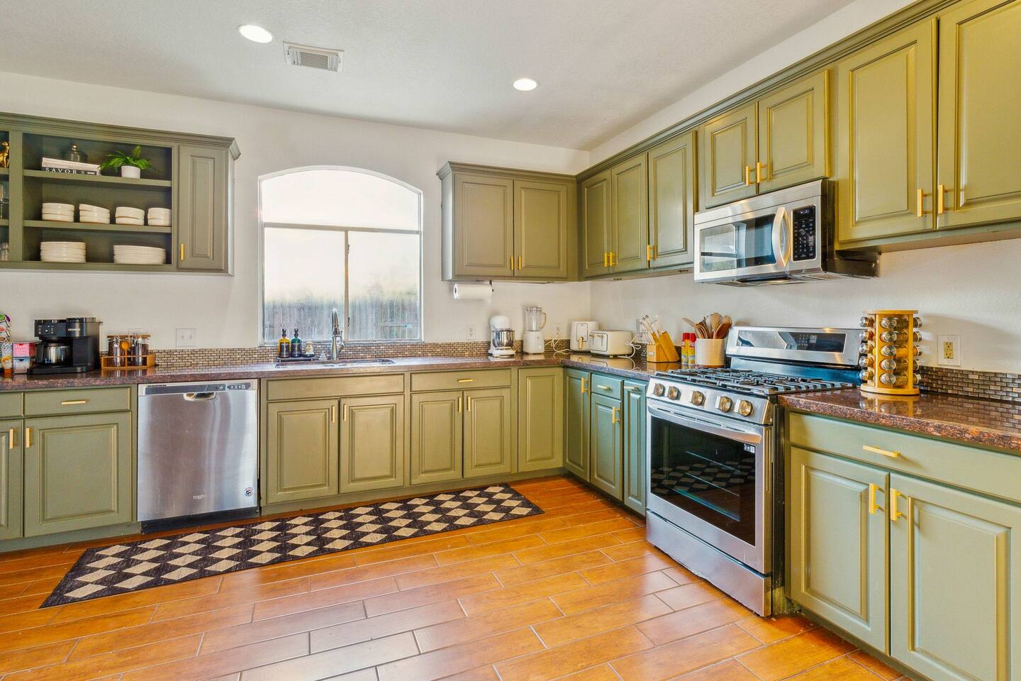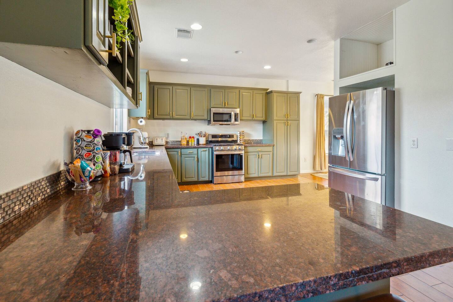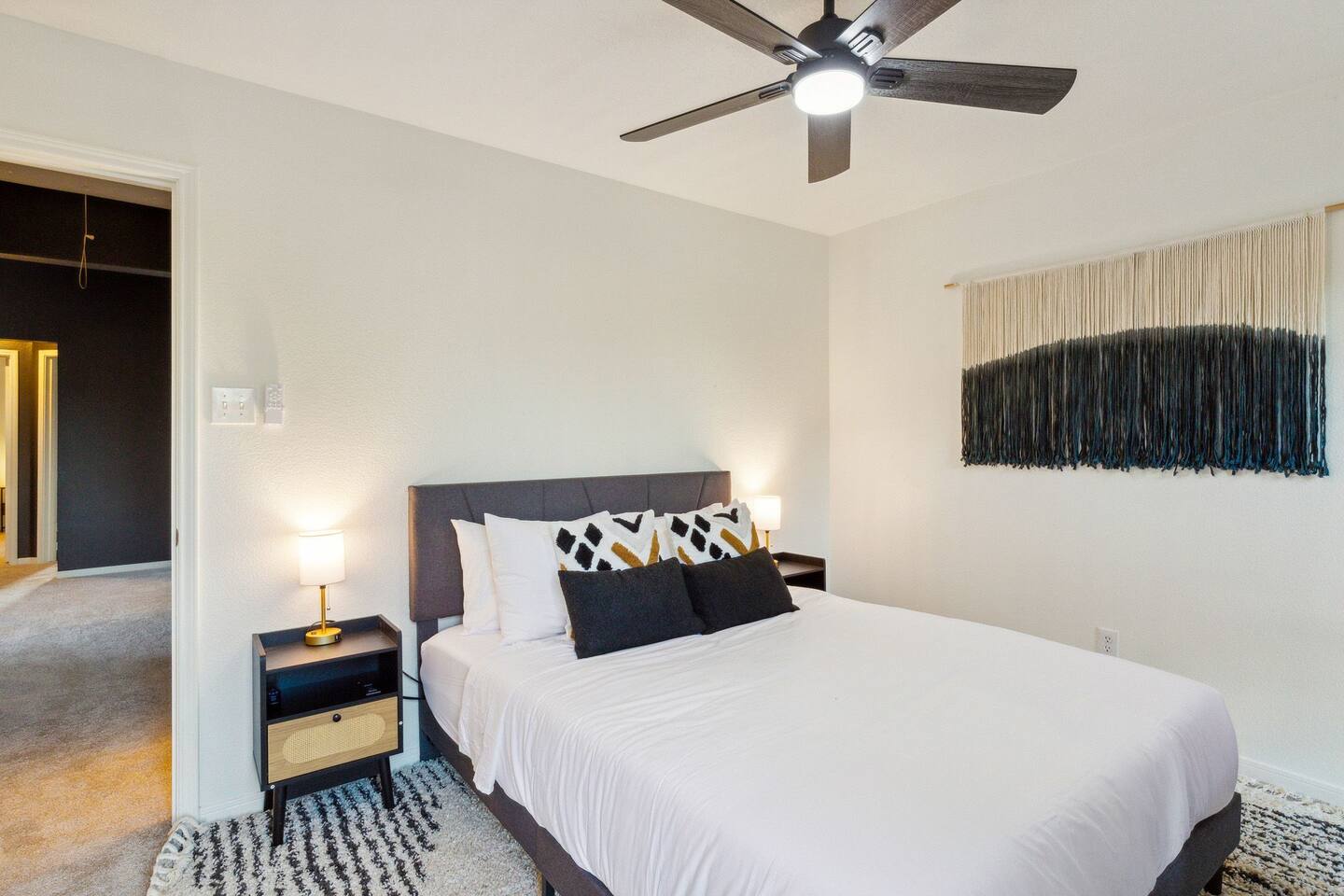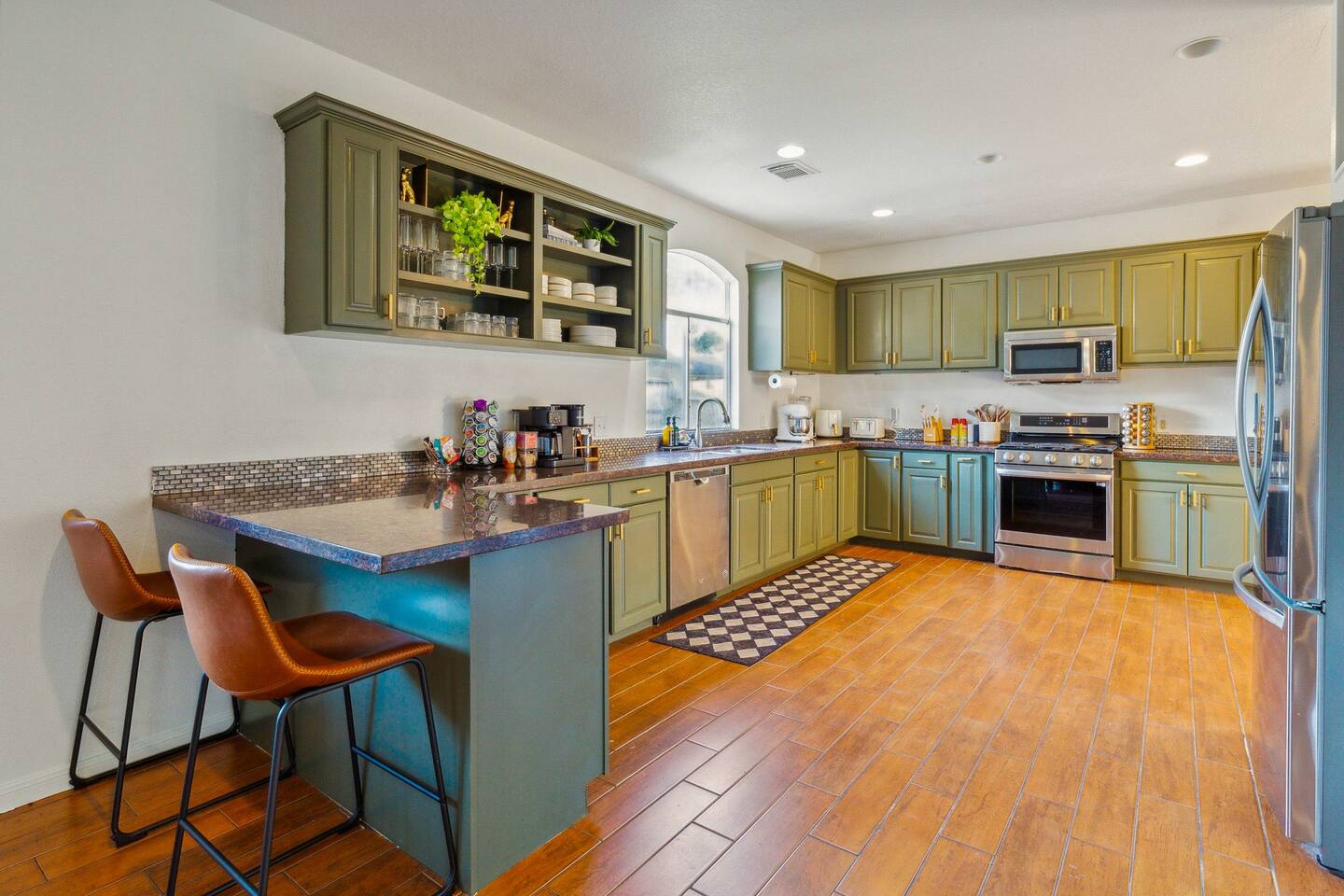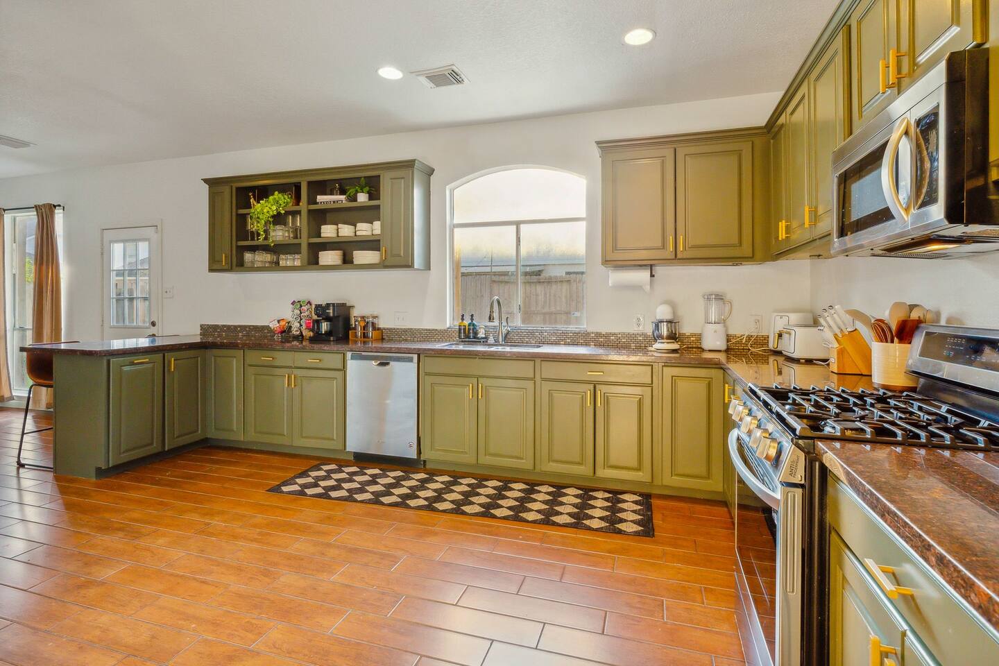 Welcome to the Vintage Texan rental, your perfect getaway in Cypress, TX! Located in a quiet cul-de-sac, this charming 5-bedroom, 3.5-bath home offers comfort, convenience, and all the amenities you need for a memorable short or mid-term stay. The house sits on an oversized lot at the bend of the road, providing a peaceful and spacious retreat for families, groups, or business travelers. Upon entering the neighborhood, you’ll immediately notice the serene atmosphere, ideal for a relaxing stay away from the hustle and bustle of the city. Parking is a breeze, with a two-car garage and a large driveway that can accommodate up to four cars. There's also ample street parking available. The front yard, adorned with a beautiful palm tree and well-lit landscaping, creates a warm and inviting welcome. Your arrival will be seamless, thanks to our Yale smart lock, pre-programmed with the last four digits of your phone number. This convenient feature ensures that accessing the home is effortless throughout your stay. As you step through the front door, you’re greeted by a cozy sitting area, perfect for luggage drop-off or a moment to relax. Here, you’ll also find a welcome gift and our house manual with all the information you need to make your stay as smooth as possible. The front sitting area leads into the open and airy dining room, which is spacious enough for large family meals or gatherings with friends. The dining area flows seamlessly into the beautifully updated kitchen, which is fully stocked with everything you’ll need for your stay. Whether you're preparing a gourmet meal, brewing a fresh cup of coffee in the morning, or stocking the fridge and pantry with snacks, the kitchen is designed to accommodate every culinary need. Stainless steel appliances and ample counter space make meal prep a breeze. Just around the corner, you'll find the main living room downstairs. This open-concept space features a cozy U-shaped sectional, a large TV, and a beautiful remote-controlled fireplace, perfect for relaxing after a long day. The shuffleboard table adds a fun element to the space, inviting friendly competition among guests. From the living room, you can easily access the backyard, making BBQ season that much easier. At the front of the house, the staircase takes you to the second floor, where the space splits into two wings. To the right, you'll find the game room, complete with a pool table ready for your next match. This side of the house also features a private bedroom with a queen bed and its own ensuite bathroom, complete with a walk-in shower—ideal for guests seeking extra privacy. On the left side of the second floor, you’ll discover a cozy upstairs living room, thoughtfully designed with kids in mind. It features a comfortable modular sleeper sofa, a TV, and a soft, washable rug. This room provides a perfect space for younger guests to relax and watch their favorite shows or movies. Off this living room is the primary bedroom, your own personal sanctuary during your stay. This luxurious room includes a king-size bed, a sitting chair, and a TV for unwinding with a good movie or show. The en-suite bathroom is equally impressive, featuring a large soaking tub, a walk-in shower with a rainhead, and a double vanity. You'll have plenty of storage space with a walk-in closet and dresser, ensuring you can unpack and feel right at home. The primary suite also includes a dual-purpose room just off the bedroom. This additional space is furnished with a full-size daybed and a sit/stand desk, perfect for anyone needing a quiet workspace. The 43-inch TV in this room can also double as a monitor if needed. On the opposite side of the upstairs living room, you’ll find two additional bedrooms and a third bathroom. One bedroom is equipped with a king-size bed, while the other features a queen-size bed. Both rooms include smart TVs and sit/stand desks, offering even more work-from-home options. The shared bathroom on this side has a full-size tub and shower combo, ensuring all guests have access to everything they need for a comfortable stay. Now, step outside into the backyard, where a brand-new concrete slab has been poured to create the ultimate outdoor oasis. The backyard is fully fenced, making it a safe and fun space for children and pets to roam freely. A string of lights surrounds the outdoor area, creating a cozy and inviting atmosphere for evenings under the stars. A large 7-person inflatable hot tub awaits you, perfect for relaxing after a long day of exploring or working. Gather around the fire pit, which seats six comfortably, and enjoy a night of conversation and s’mores with family or friends. In addition to the hot tub and fire pit, the backyard includes a BBQ area complete with a charcoal grill and smoker for all your outdoor cooking needs. The outdoor dining space provides plenty of seating for meals al fresco, making this area ideal for BBQ season. Our location is a highlight of the Vintage Texan. We're just 20-30 minutes from downtown Houston and only 10 minutes from the Cypress Boardwalk, offering quick access to dining, shopping, and entertainment. This home is also conveniently located near highly rated schools, top-tier medical facilities, and a variety of shopping options, making it the perfect place for families and professionals alike. We’ve designed every aspect of this home with comfort, convenience, and enjoyment in mind. Whether you’re here for work, play, or a little of both, our Vintage Texan rental is the perfect place to relax, unwind, and create lasting memories. We hope you enjoy your stay, and if you have any questions during your visit, please don't hesitate to reach out!