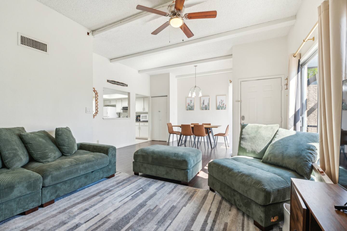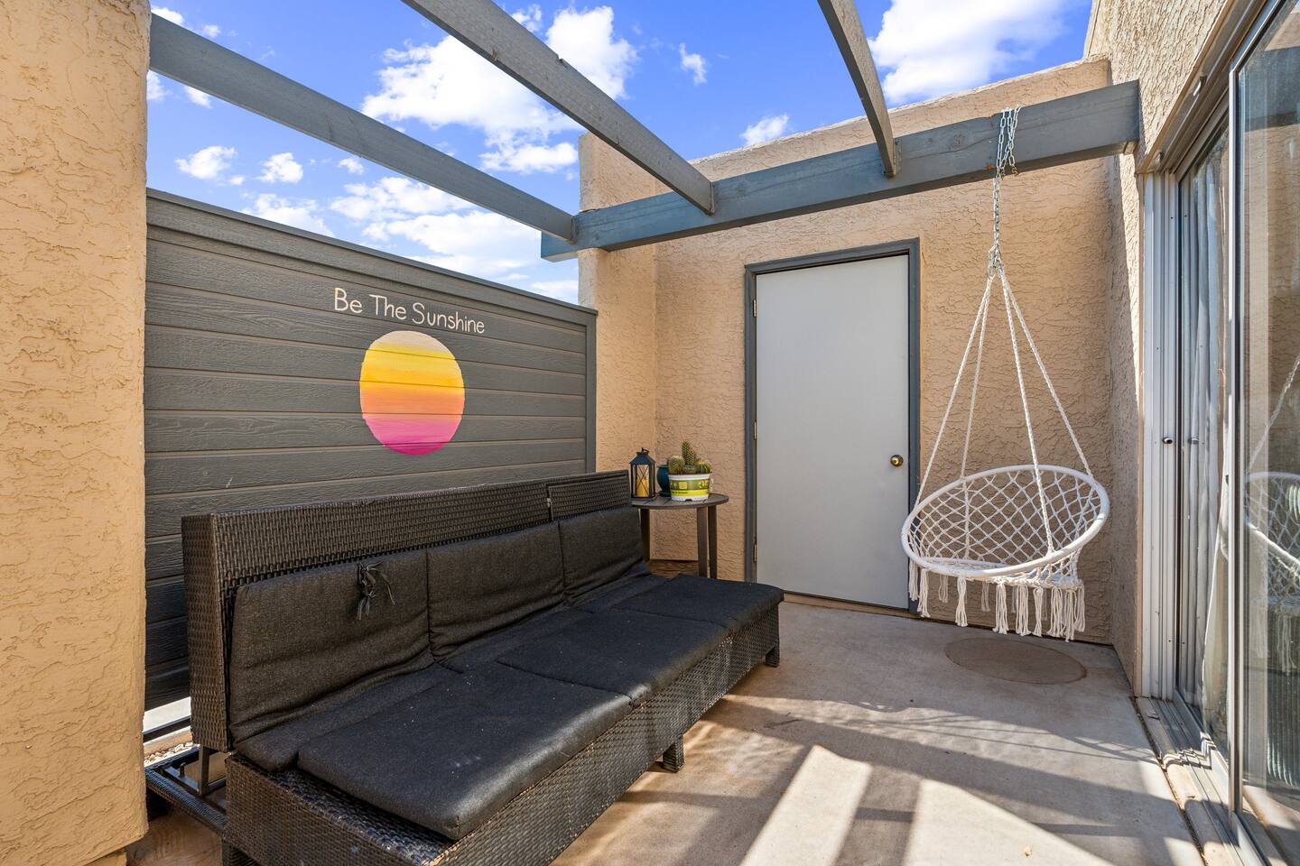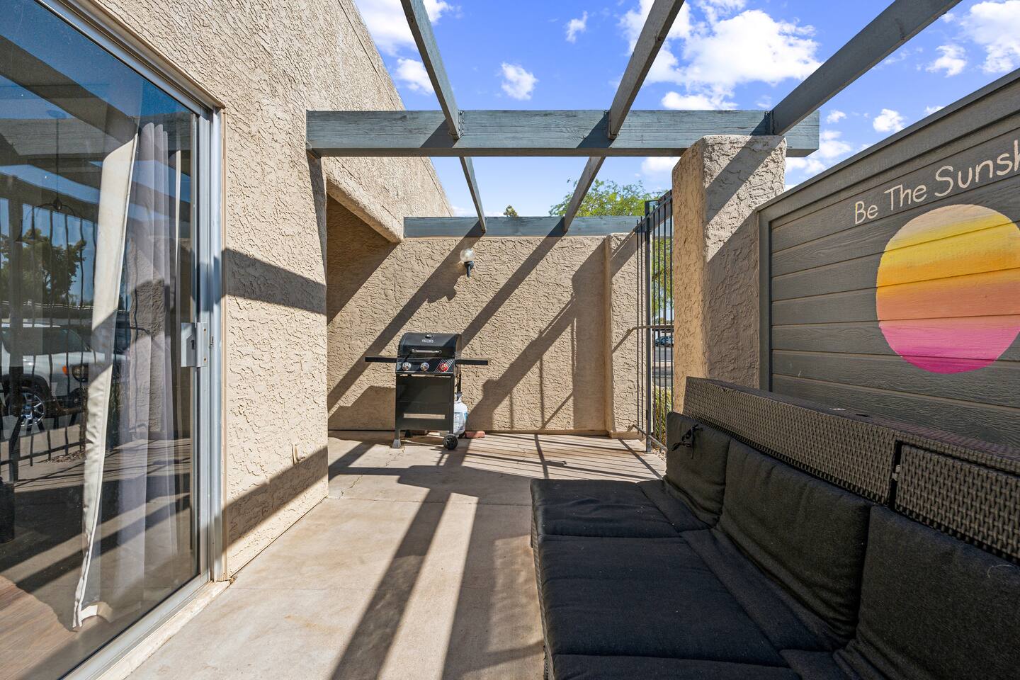 The perfect escape for those wanting to soak up the sun, enjoy Spring Training games, and spend some time in the great outdoors. A bright and airy interior with high ceilings and modern decor makes this is a wonderful getaway for everyone! Check in at anytime with the keyless lock. Two bedroom, two bath townhome. No stairs to climb and no one above or below us. High ceilings in the living room to give the room a spacious feel as well as sunroofs in parts of the home to give you natural light!. Large gated patio with seating to read and relax. The soothing color palettes and comfortable furnishings create an inviting atmosphere for a good night's sleep. KEY FEATURES: ☀ 2 Spacious Bedroom ☀ 2 Full bathroom ☀ Full kitchen w/ stainless steel appliances ☀ Spacious living room ☀ In-unit washer + dryer ☀ Central location only minutes from trails, bars, resturants + more Modern Comfort: Enjoy the open-concept living space with chic décor, a comfortable sofa, and a large flat-screen TV, perfect for unwinding after a day of exploration. The living area opens to a private patio where you can relax with a morning coffee or evening drink.. Two Cozy Bedrooms: King size bed with an attached master sweet and private patio. Refreshing Pool: Take a dip in the sparkling community pool, available for guest use. It’s a great spot to cool off from the Arizona sun or to simply relax with a book. Convenient Amenities: Free Wi-Fi, in-unit laundry facilities, air conditioning, and free parking are just some of the thoughtful amenities provided to enhance your stay. Explore the Area: Arizona State University: 8 minutes away Tempe Beach Park: 9 minutes away Desert Botanical Garden: 12 minutes away Phoenix Zoo: 11 minutes away Old Town Scottsdale: 18 minutes away Scottsdale Fashion Square: 17 minutes away