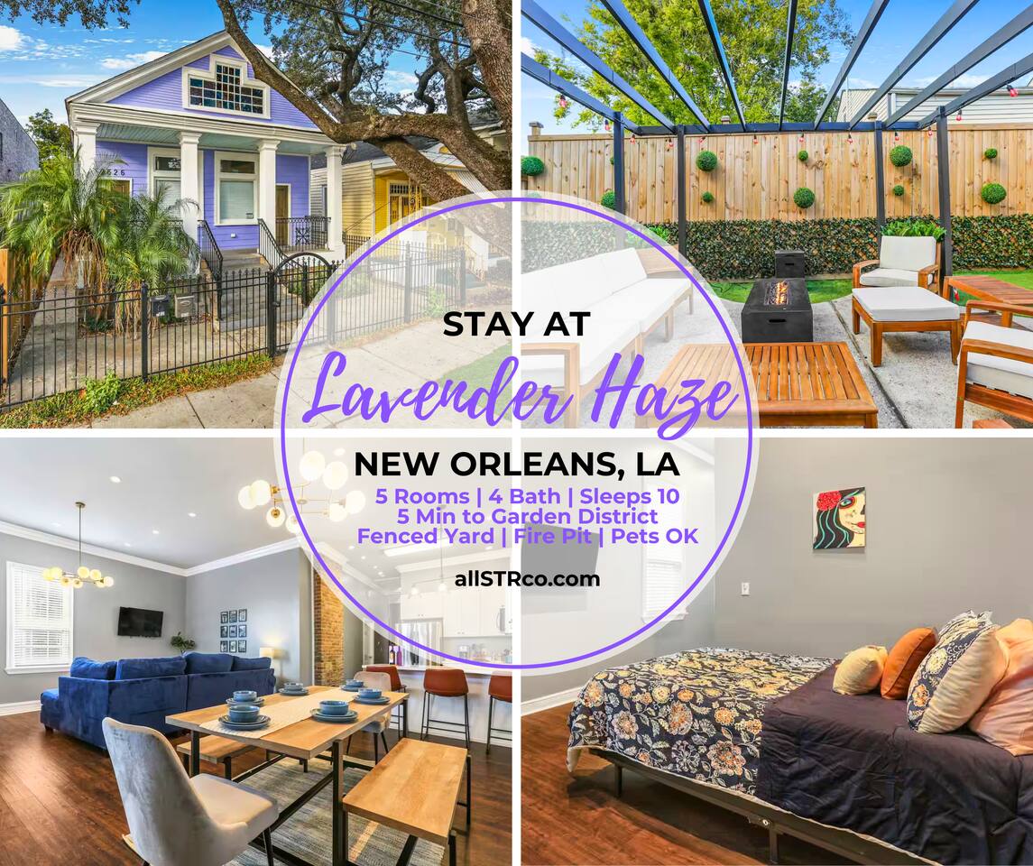 Welcome to Lavender Haze, your spacious Uptown retreat in the heart of New Orleans. ✨ This charming 5-bedroom, 4-bathroom home blends historic character with modern updates, perfect for families, groups, corporate travelers — and their pets! 🐾 Step inside and you’ll find cozy living spaces designed for gathering — whether you’re sipping coffee at the dining table, streaming your favorite show on the Smart TV, or cooking up a meal in the fully stocked kitchen. Each bedroom offers fresh linens, plenty of privacy, and comfortable beds so everyone can recharge after a day exploring the city. What You’ll Love: 3 ensuite bedrooms + 2 bedrooms sharing a bath = space & privacy for all Dual climate zones to keep everyone comfortable Fully stocked kitchen with modern appliances & coffee station Smart TVs throughout for easy streaming Pet-friendly with fenced outdoor space Quiet setting with only one neighbor + a church next door Location Highlights: 🚋 Walk to the St. Charles Streetcar 🌳 Minutes to Magazine Street & Garden District 🎶 10 min drive to the French Quarter 🏈 12 min drive to the Superdome 🍺 Close to breweries & thrift shops on Tchoupitoulas During the day, stroll through oak-lined streets in the Garden District, shop along Magazine Street, or take the streetcar downtown to soak up the energy of the French Quarter. In the evenings, return home to a calm, comfortable space where you can enjoy a glass of wine in the living room or relax with friends in the quiet backyard. At Lavender Haze, you’ll experience the best of both worlds: the excitement of New Orleans just minutes away and a cozy retreat to return to each night. ✨