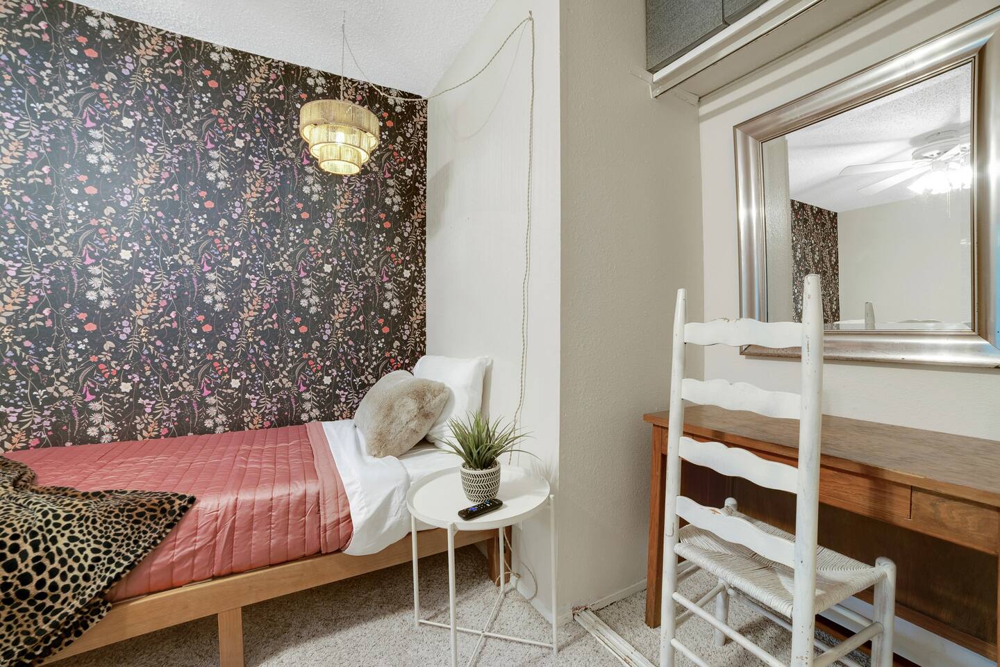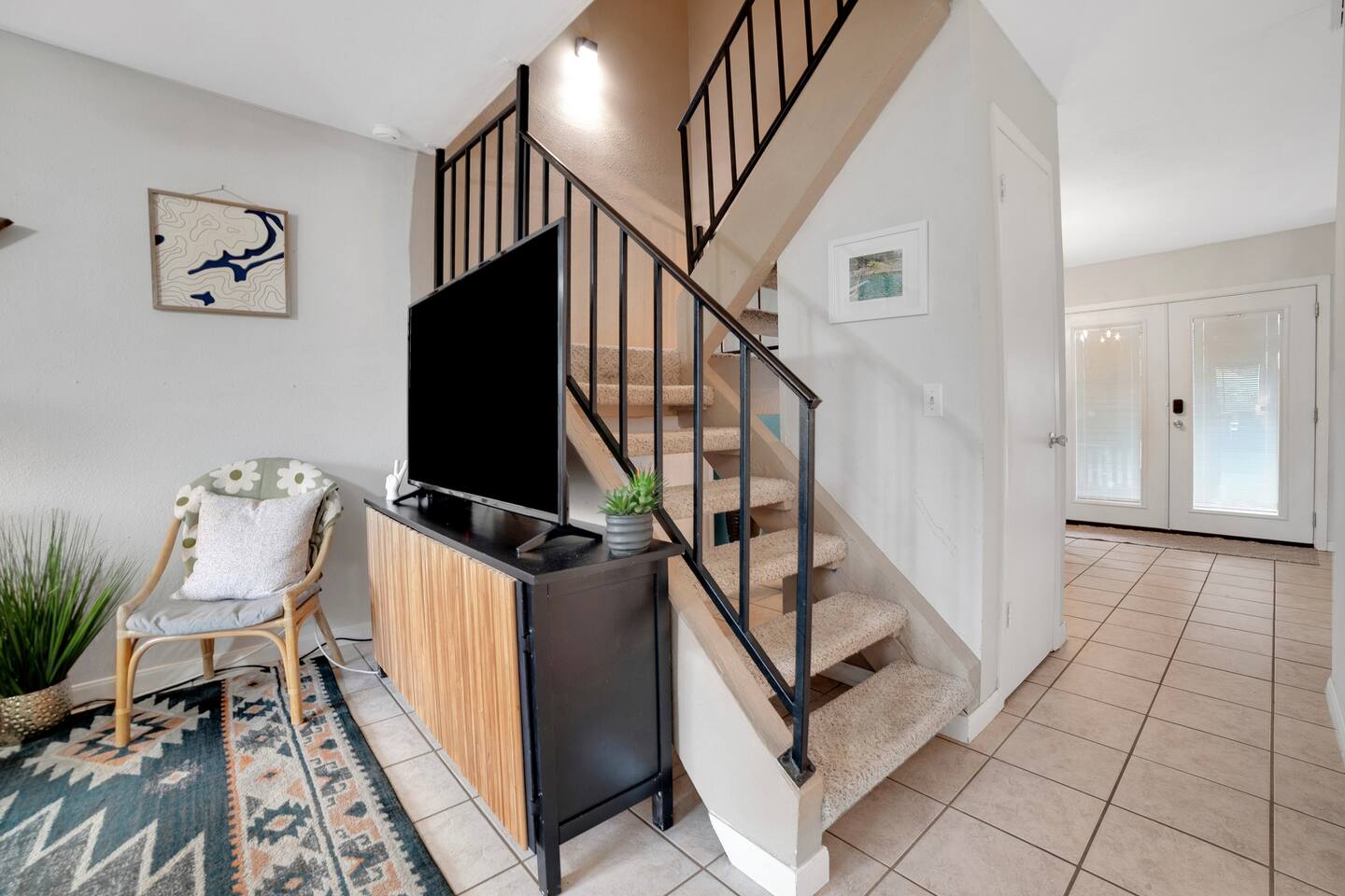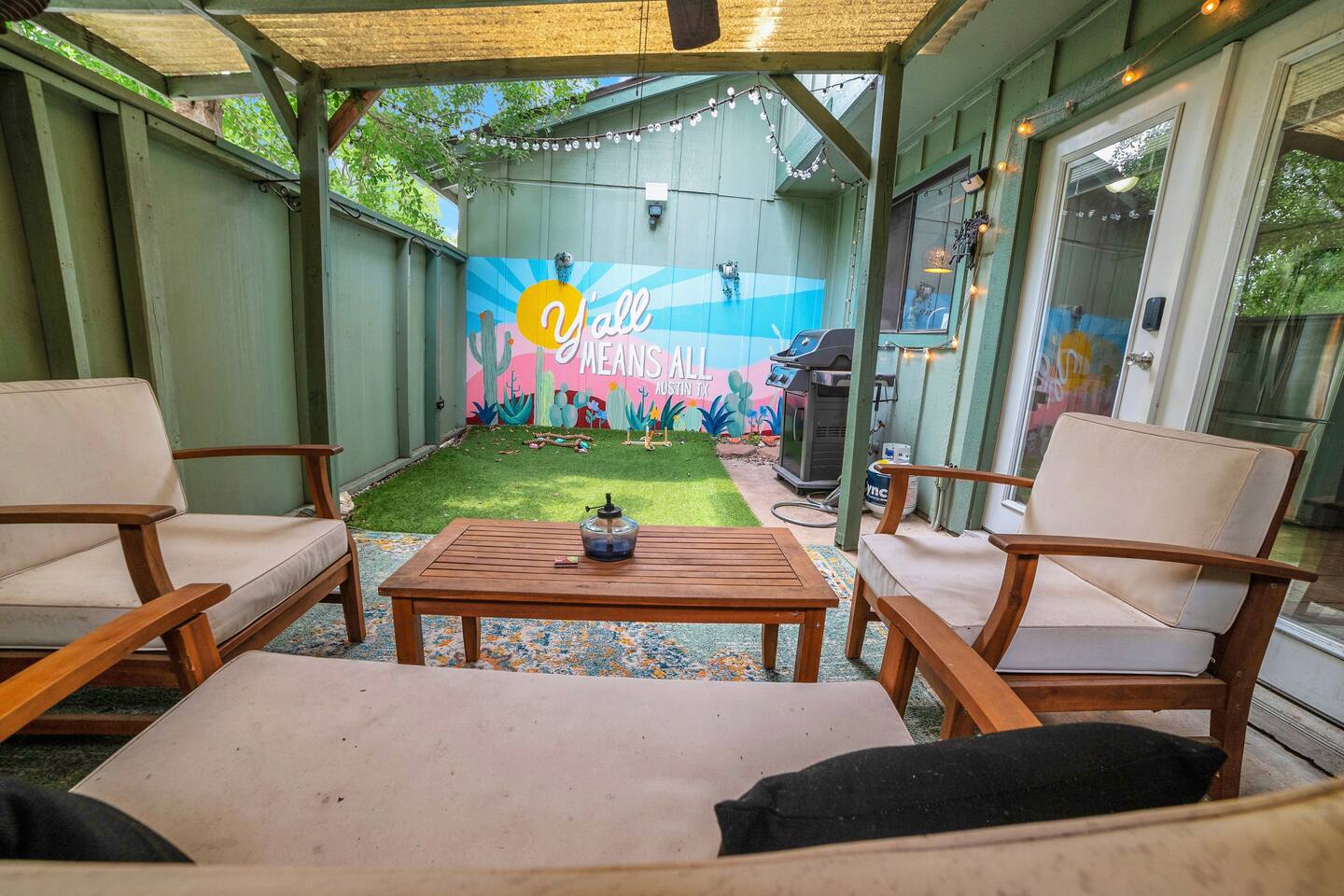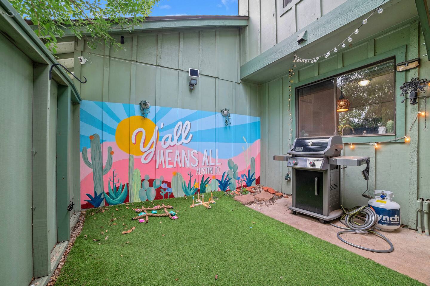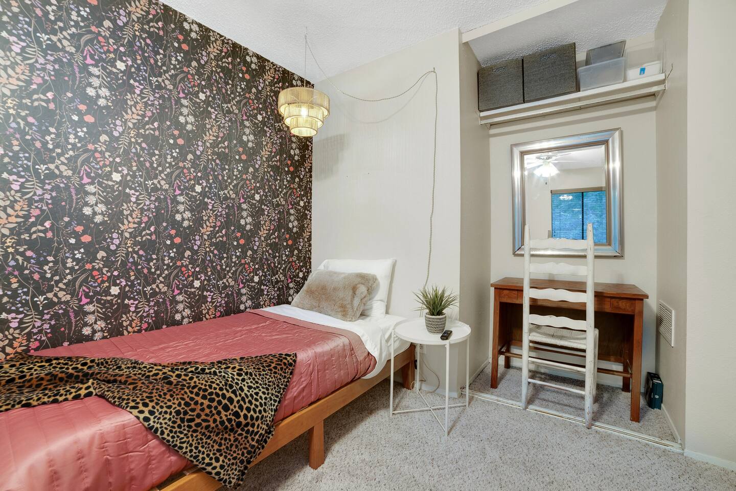 The Space: Step into The Vinyl Wildflower, a bold and cozy 3-bedroom, 1.5-bath Austin townhouse designed for unforgettable stays. From the moment you walk in, the colorful mural, curated vinyl collection, and welcoming vibe set the tone. Perfect for girl trips, family adventures, or work + play retreats, this space was made to unwind after soaking up everything Austin has to offer. Downstairs features a spacious, fully stocked kitchen with everything you need to cook up local market finds, a dining area for 4–6, and a chic half bath. The living room gives you all the cozy vibes with records, a record player, and laid-back lounge space to recharge. Upstairs, you’ll find: • Primary Bedroom: King bed + desk + smart TV • Guest Room 1: Queen + Twin bed + desk • Guest Room 2: Queen bed + desk + smart TV • Full bathroom with tub/shower combo Outdoor Space: Relax on the private, pet-friendly turf patio with outdoor seating, a propane grill, and custom Austin mural — the perfect backdrop for morning coffee or late-night hangs. Community Perks: The community pool is literally across the street — ideal for kiddos or a mid-day cool-off. Parking: We offer 2 dedicated parking spots + plenty of visitor parking (up to 3 cars total). Location Highlights (10–15 min drive): • Downtown Austin • Zilker Park & Barton Springs • South Congress (SoCo) • Lady Bird Lake Hike & Bike Trail • The Domain • Mueller District • Austin-Bergstrom Airport (20 mins) Extras & Amenities: • Pet-friendly (with turf yard!) • Fully stocked kitchen (blender, toaster, air fryer, etc.) • High-speed WiFi • Washer/dryer in garage • Smart TVs (in 2 rooms) • Desks in every bedroom • Record player + vinyl collection • Self check-in + smart lock • Coffee, teas, spices & more