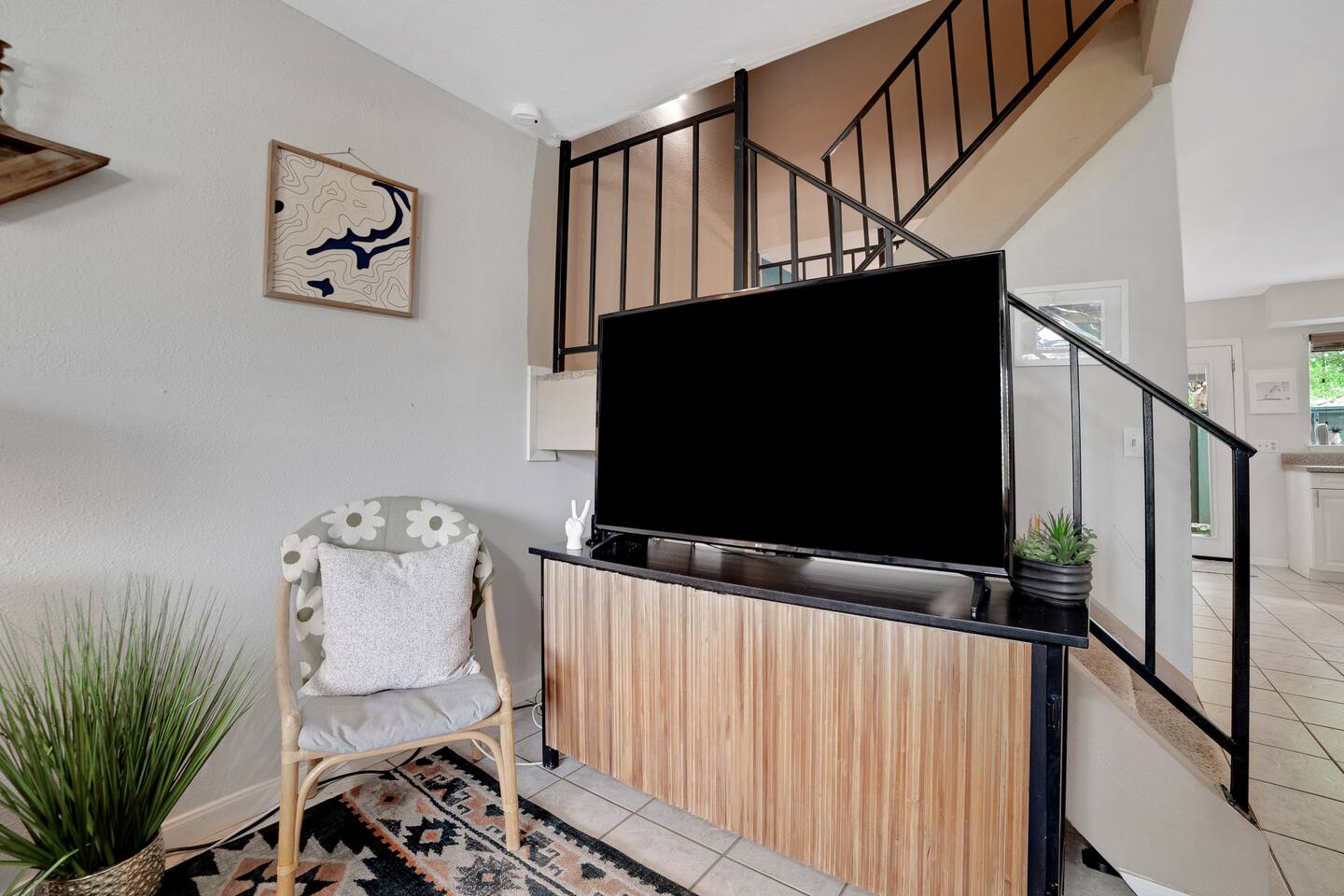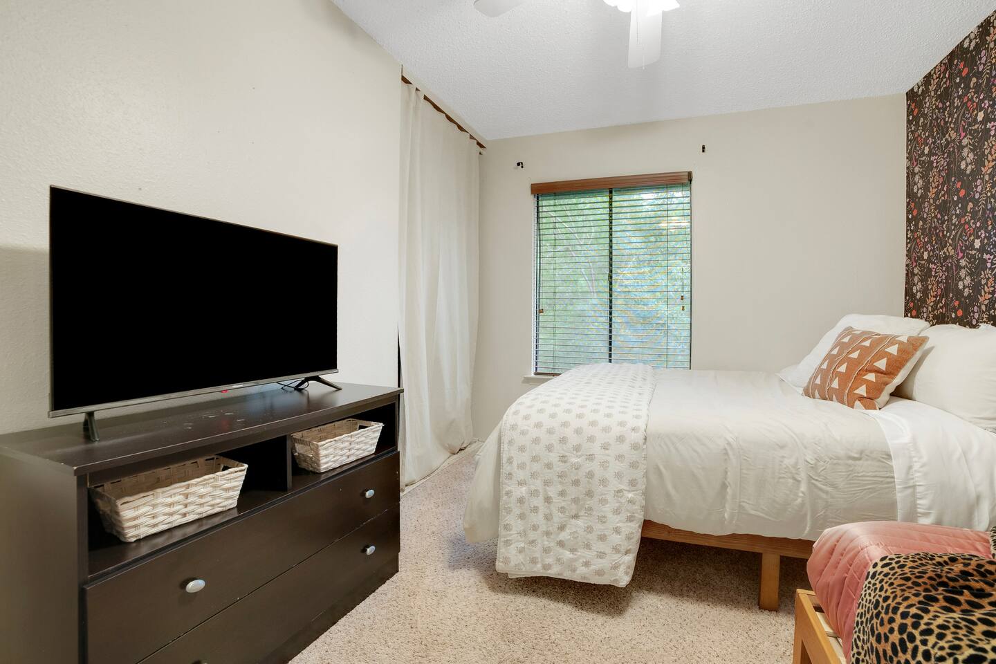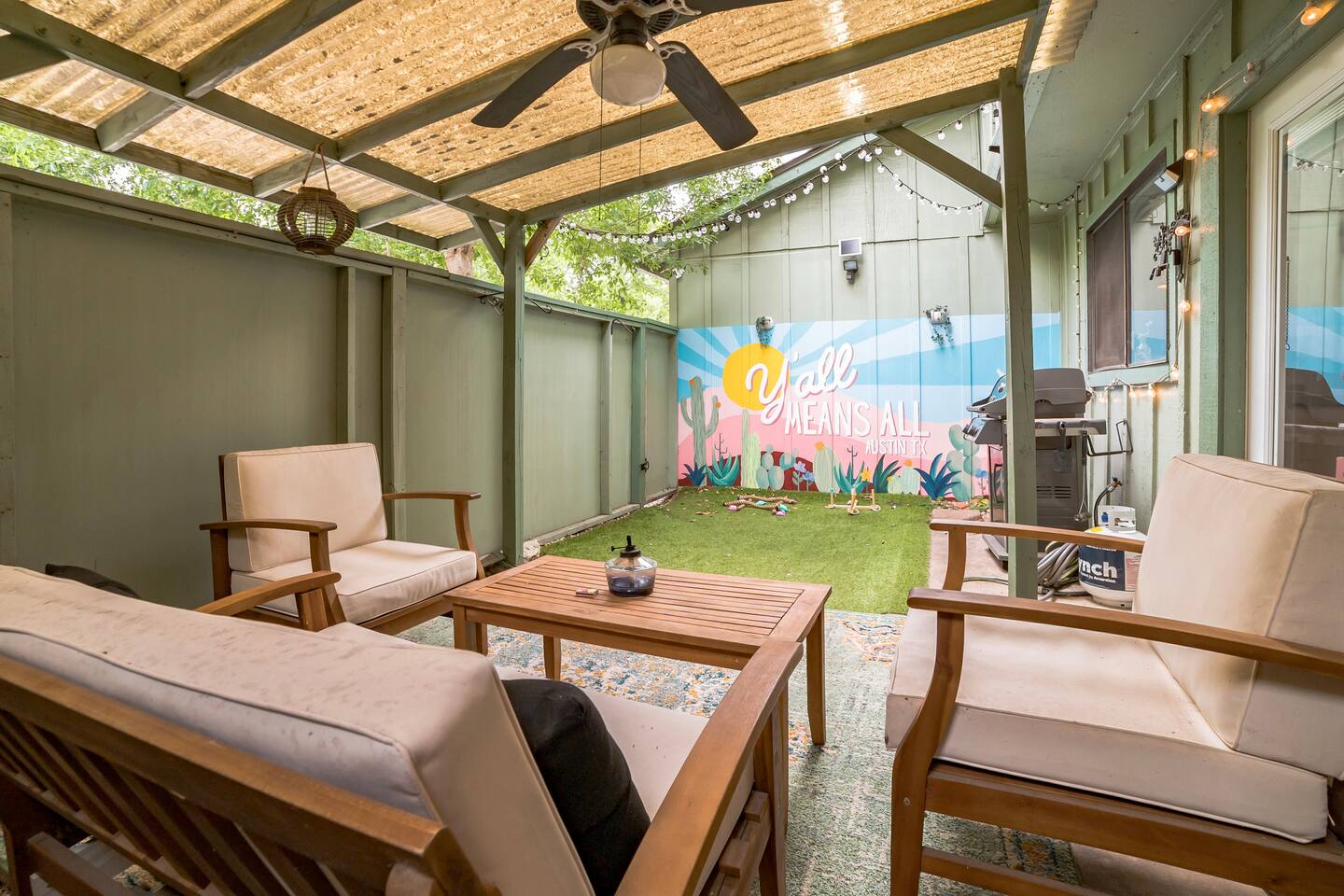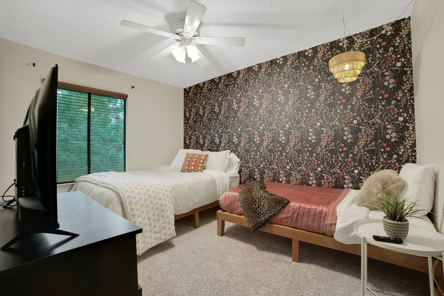 The Space: Step into The Vinyl Wildflower, a bold and cozy 3-bedroom, 1.5-bath Austin townhouse designed for unforgettable stays. From the moment you walk in, the colorful mural, curated vinyl collection, and welcoming vibe set the tone. Perfect for girl trips, family adventures, or work + play retreats, this space was made to unwind after soaking up everything Austin has to offer. Downstairs features a spacious, fully stocked kitchen with everything you need to cook up local market finds, a dining area for 4–6, and a chic half bath. The living room gives you all the cozy vibes with records, a record player, and laid-back lounge space to recharge. Upstairs, you’ll find: • Primary Bedroom: King bed + desk + smart TV • Guest Room 1: Queen + Twin bed + desk • Guest Room 2: Queen bed + desk + smart TV • Full bathroom with tub/shower combo Outdoor Space: Relax on the private, pet-friendly turf patio with outdoor seating, a propane grill, and custom Austin mural — the perfect backdrop for morning coffee or late-night hangs. Community Perks: The community pool is literally across the street — ideal for kiddos or a mid-day cool-off. Parking: We offer 2 dedicated parking spots + plenty of visitor parking (up to 3 cars total). Location Highlights (10–15 min drive): • Downtown Austin • Zilker Park & Barton Springs • South Congress (SoCo) • Lady Bird Lake Hike & Bike Trail • The Domain • Mueller District • Austin-Bergstrom Airport (20 mins) Extras & Amenities: • Pet-friendly (with turf yard!) • Fully stocked kitchen (blender, toaster, air fryer, etc.) • High-speed WiFi • Washer/dryer in garage • Smart TVs (in 2 rooms) • Desks in every bedroom • Record player + vinyl collection • Self check-in + smart lock • Coffee, teas, spices & more