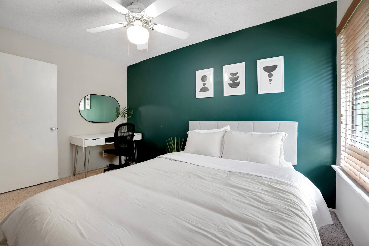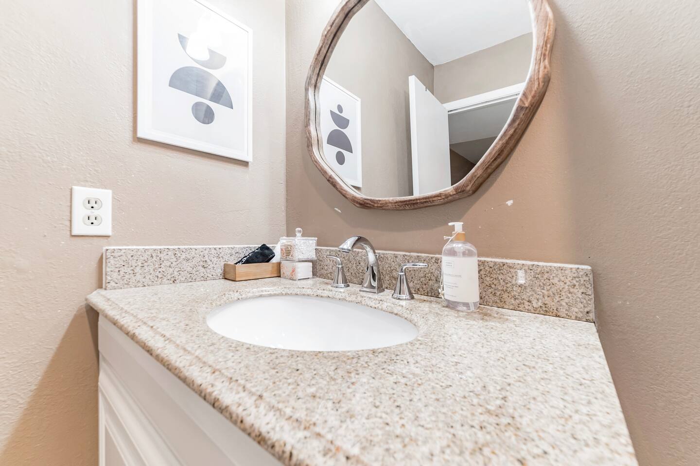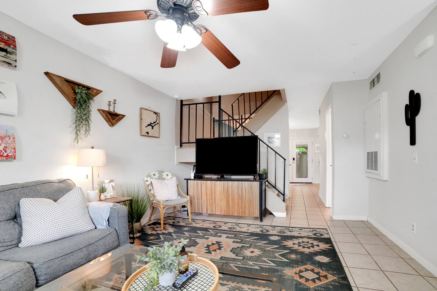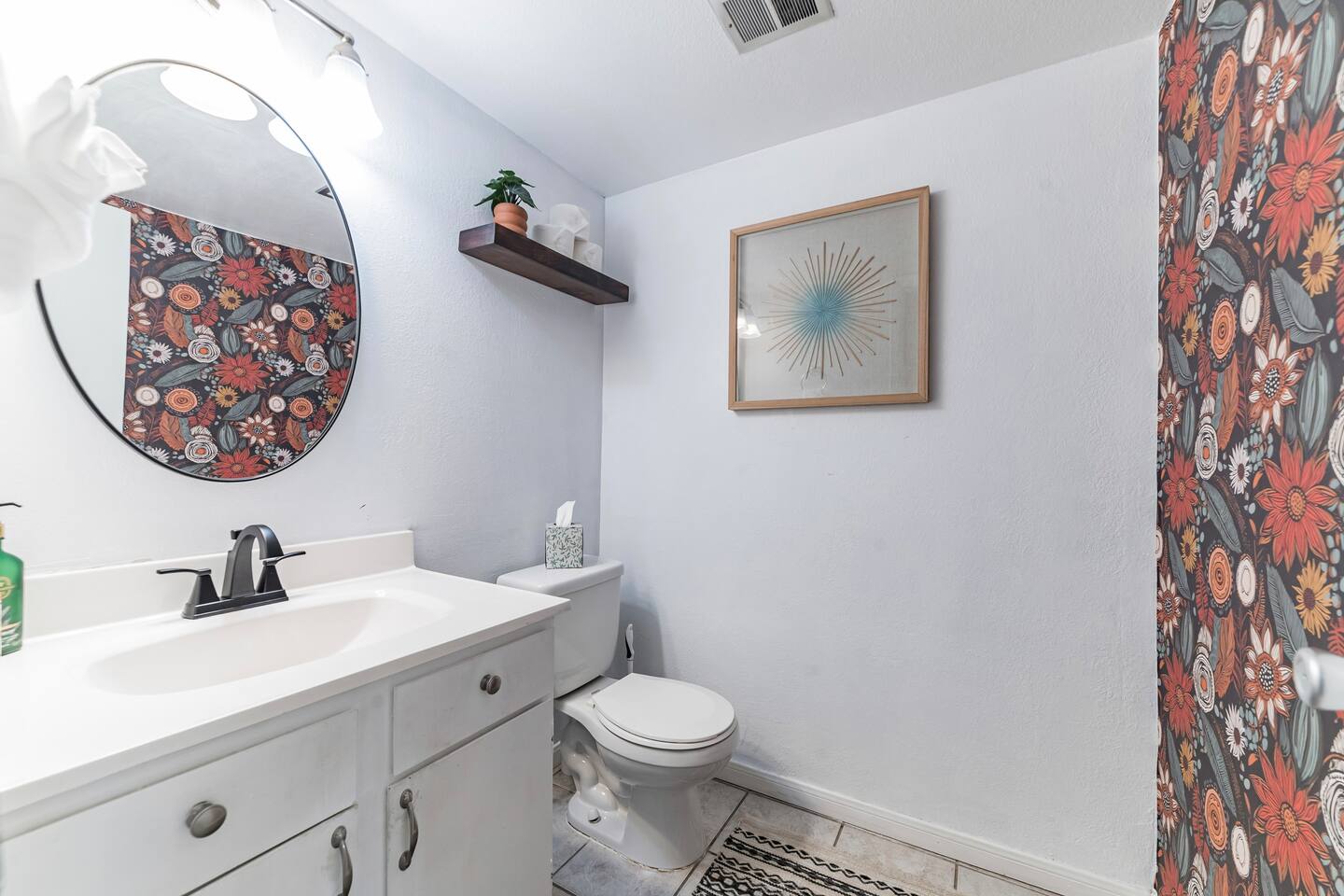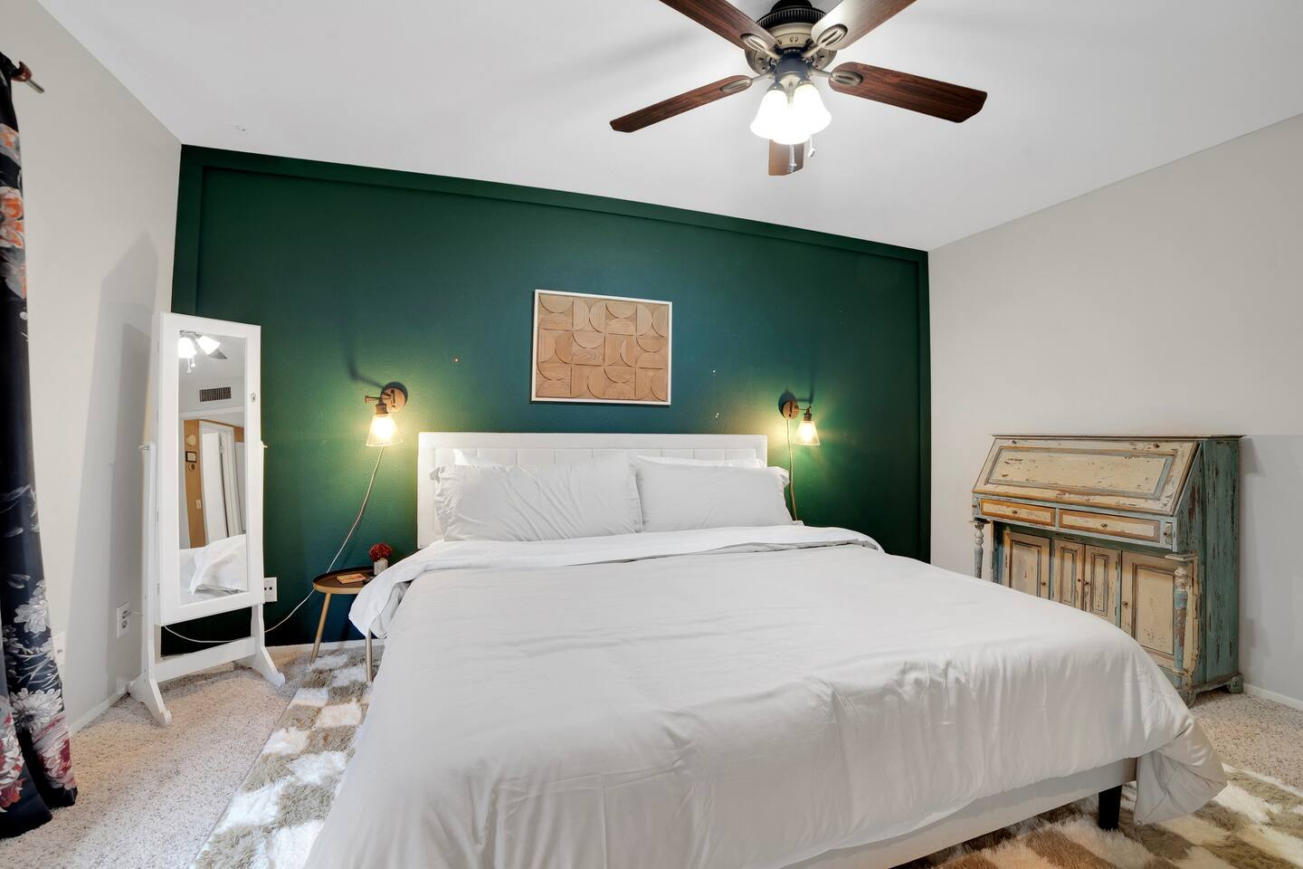 The Space: Step into The Vinyl Wildflower, a bold and cozy 3-bedroom, 1.5-bath Austin townhouse designed for unforgettable stays. From the moment you walk in, the colorful mural, curated vinyl collection, and welcoming vibe set the tone. Perfect for girl trips, family adventures, or work + play retreats, this space was made to unwind after soaking up everything Austin has to offer. Downstairs features a spacious, fully stocked kitchen with everything you need to cook up local market finds, a dining area for 4–6, and a chic half bath. The living room gives you all the cozy vibes with records, a record player, and laid-back lounge space to recharge. Upstairs, you’ll find: • Primary Bedroom: King bed + desk + smart TV • Guest Room 1: Queen + Twin bed + desk • Guest Room 2: Queen bed + desk + smart TV • Full bathroom with tub/shower combo Outdoor Space: Relax on the private, pet-friendly turf patio with outdoor seating, a propane grill, and custom Austin mural — the perfect backdrop for morning coffee or late-night hangs. Community Perks: The community pool is literally across the street — ideal for kiddos or a mid-day cool-off. Parking: We offer 2 dedicated parking spots + plenty of visitor parking (up to 3 cars total). Location Highlights (10–15 min drive): • Downtown Austin • Zilker Park & Barton Springs • South Congress (SoCo) • Lady Bird Lake Hike & Bike Trail • The Domain • Mueller District • Austin-Bergstrom Airport (20 mins) Extras & Amenities: • Pet-friendly (with turf yard!) • Fully stocked kitchen (blender, toaster, air fryer, etc.) • High-speed WiFi • Washer/dryer in garage • Smart TVs (in 2 rooms) • Desks in every bedroom • Record player + vinyl collection • Self check-in + smart lock • Coffee, teas, spices & more